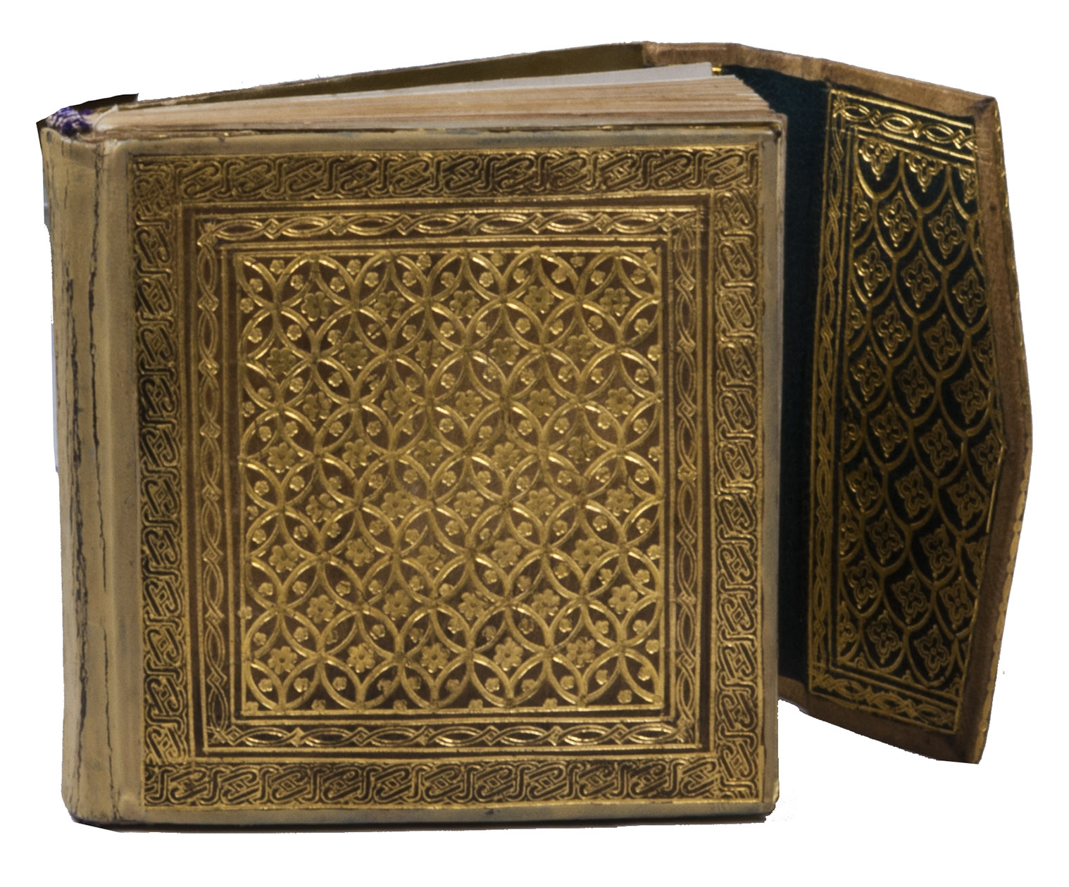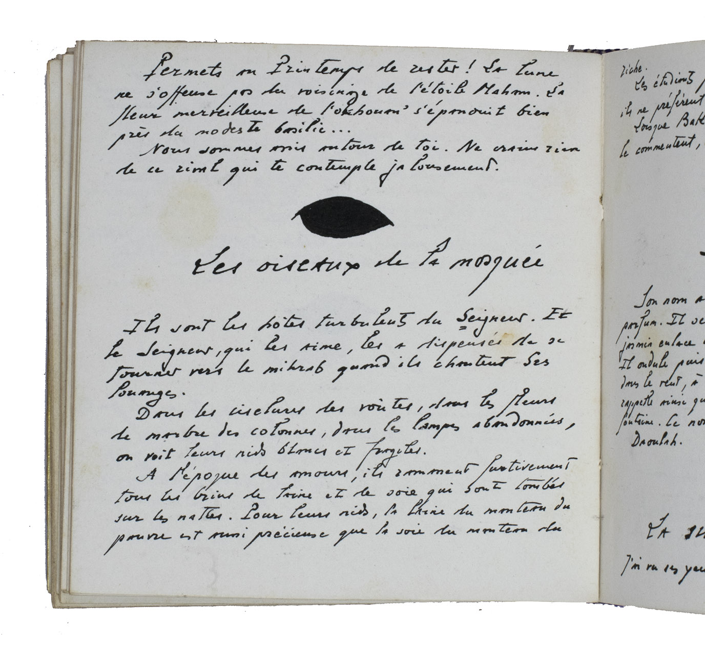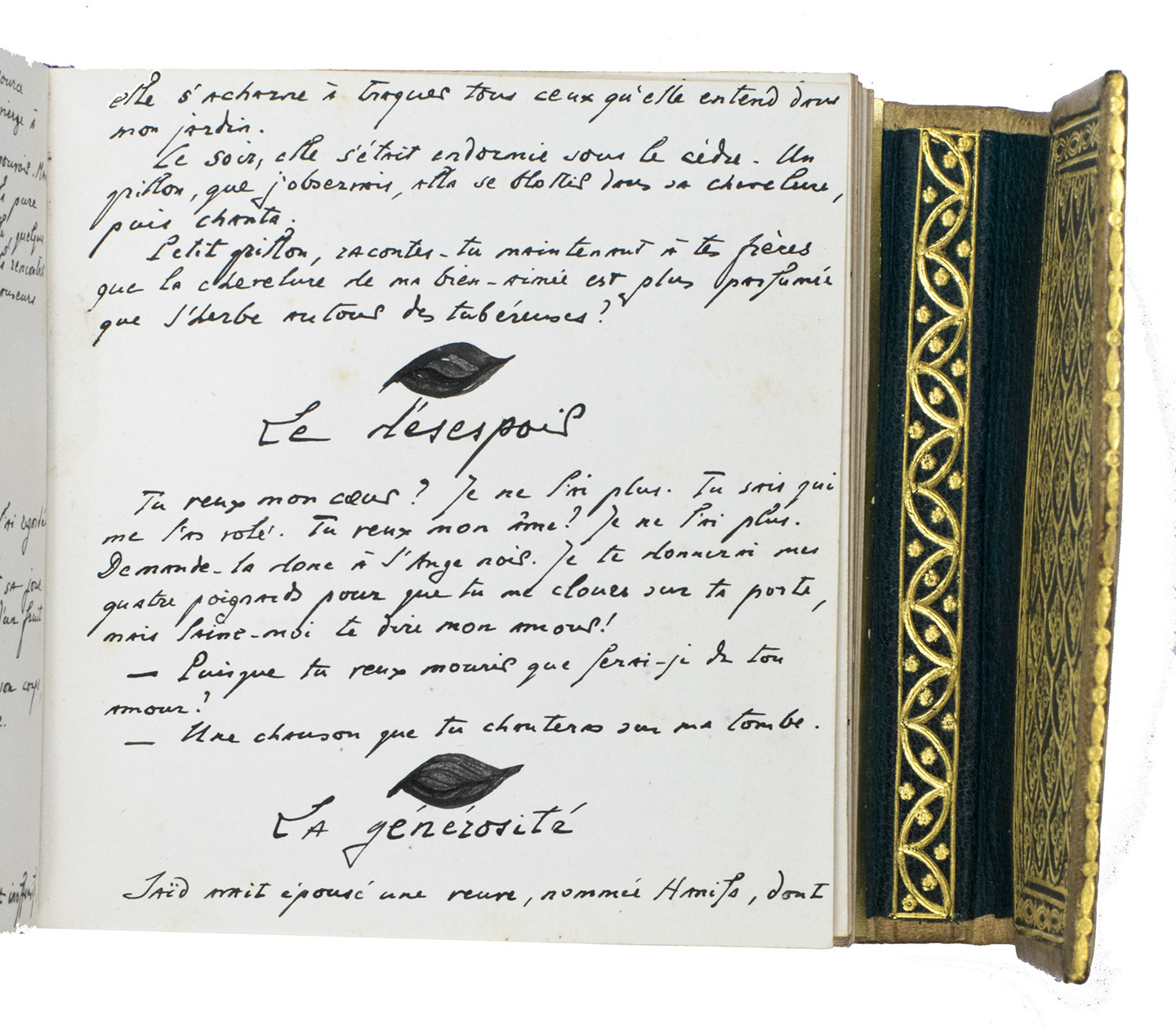 May and June 1936. 11.5 x 12 cm. Manuscript in French written by the author in blank ink a neat 20th-century hand in one column. Chapter divisions are made in the form of a calligraphic leaf, drawn in the same black ink as the text. Bound in contemporary richly gold-tooled arabesque beige morocco with a flap at the front-edge, covered with gold-tooled green morocco on the inside, purple and white head and end bands, gold and light blue endpapers. Stored in a professionally made beige morocco box (ca. 15 x 15 cm) with a gold-tooled three-line fillet frame on the boards, on the inside covered with light pink silk, title in gold on the spine. [3 blank], [141], [13 blank] pp.