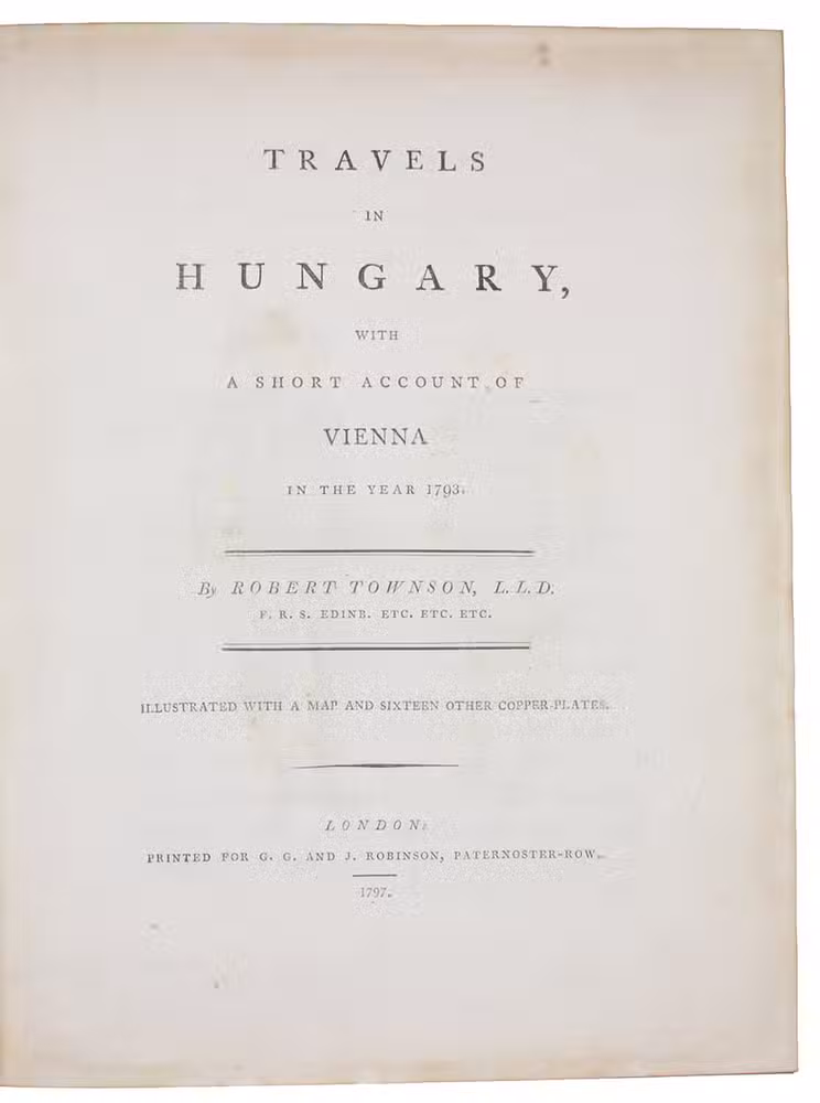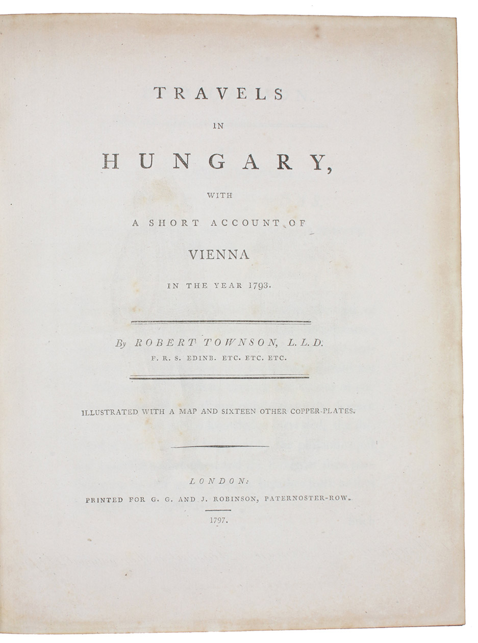 First edition of "the best English work respecting Hungary" (Cox), soon translated into Dutch and French. Includes a chapter entitled "Alpine excursions", describing the author's plant hunting activities. The chapter on Vienna, an account that historiography has surprisingly almost ignored, deals extensively with the local gluttonous eating habits first described (and since immortalized) by Aeneas Silvius Piccolomini three and a half centuries earlier. Townson continues to describe at length the imperial hothouses and zoo at Schönbrunn Palace. The book is also "a work valuable to the natural historian, particularly the mineralogist; it also contains a very particular account of the Tokay wines" (Lowndes).