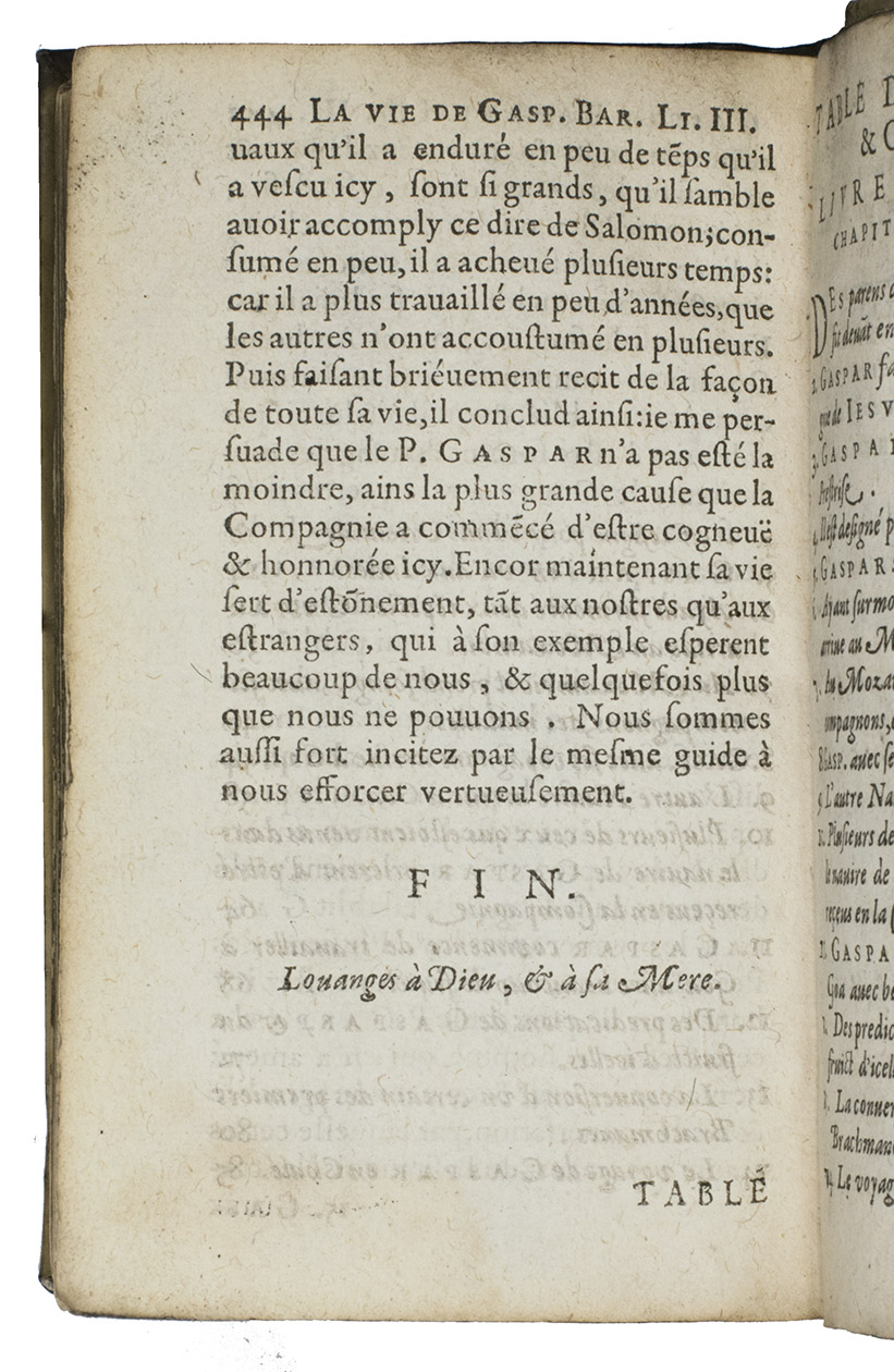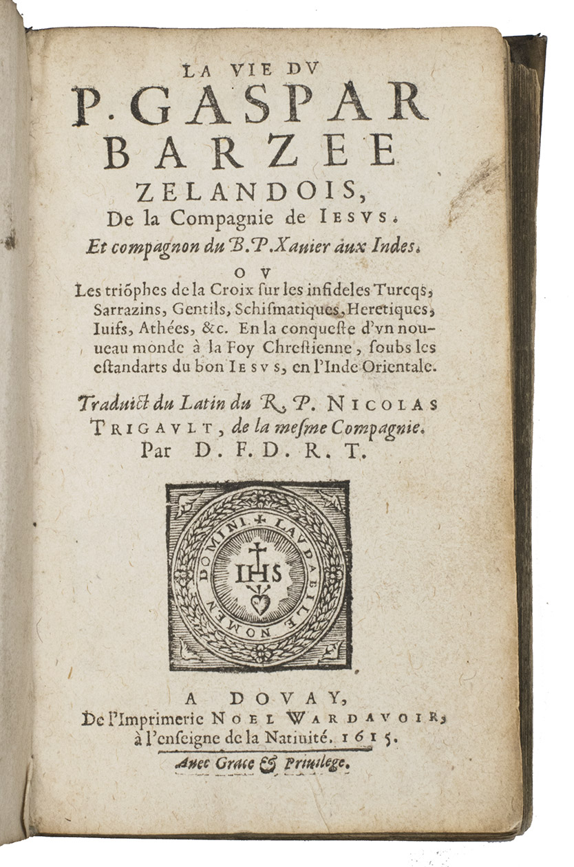 First French edition of a biography of the Jesuit Gaspar Berse (1515-1553), who preached in Ormuz at the mouth of the Persian Gulf and Goa in India. Berse was born in Goes on the island of Walcheren in Zeeland, the Netherlands. After his studies in Louvain he went to Coimbra in 1546 where he entered the Jesuit order. In 1548 he was sent to the island of Ormuz and in 1551 to Goa where the well-known François Xavier, who would soon depart for Japan, appointed him director of St. Paul's College in Goa and entrusted him with the provincialate of the Indian Mission. He died in Goa on 6 October 1553.