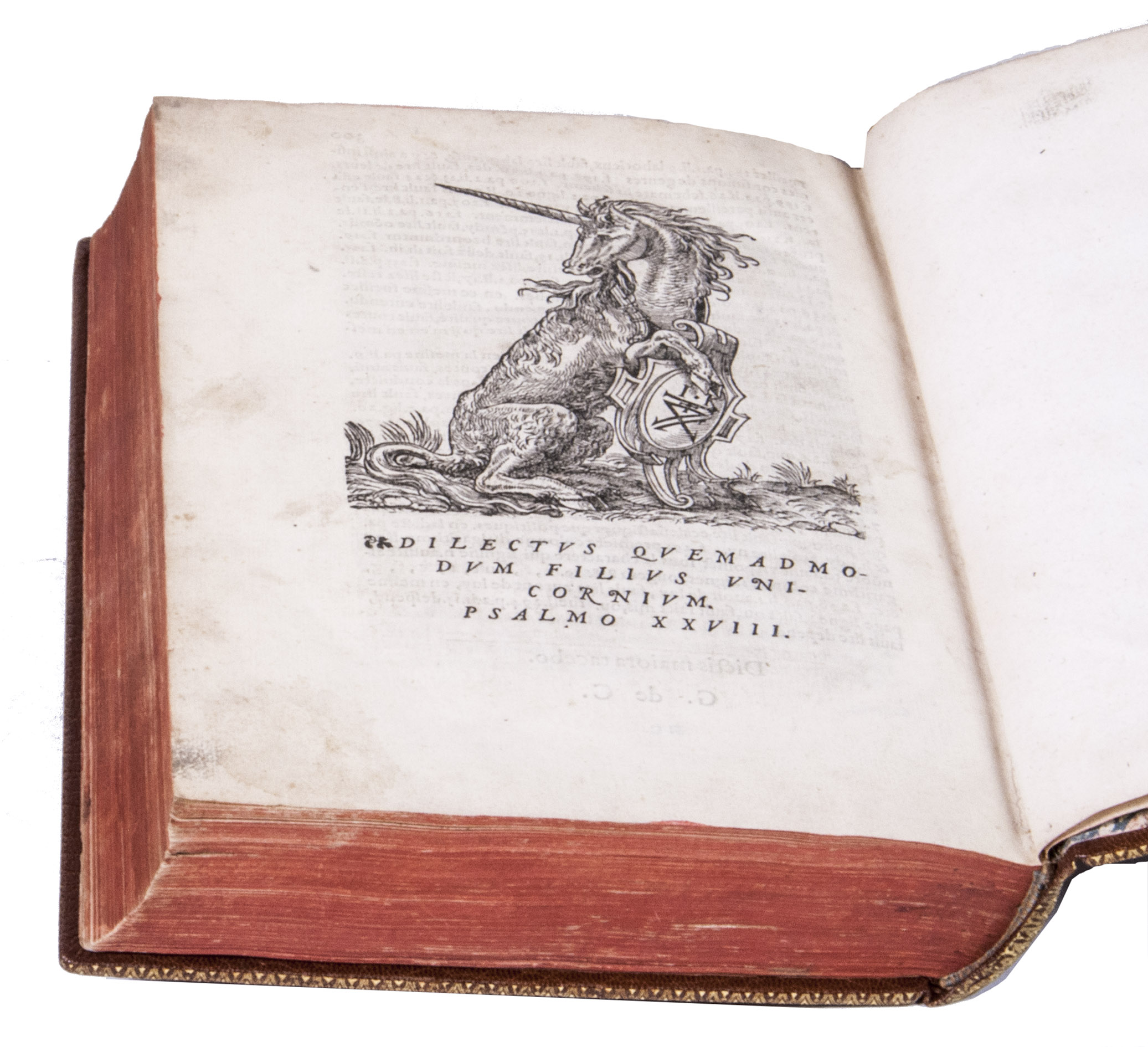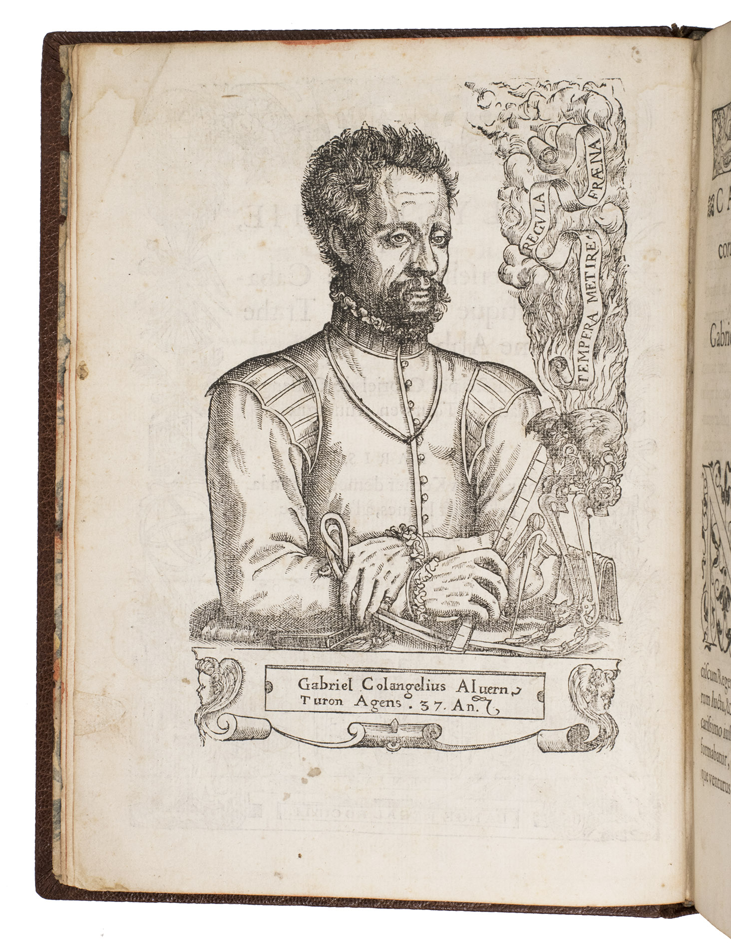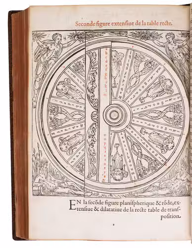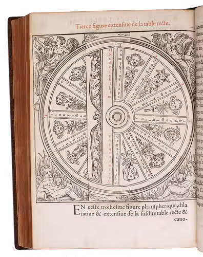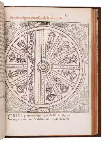 Paris, Benoît Prévost for Jacques Kerver, 1561. 3 parts in 1 volume. 4to. Printed in red and black, the main title and the titles of parts 2 and 3 set within a woodcut decorated border, 3 woodcut portraits of the translator, 13 large volvelles in part 3, numerous woodcut headpieces, and numerous woodcut decorated initials. 18th-century gold-tooled reddish-brown morocco, with the title and author lettered in gold on the spine, marbled endpapers, gold-tooled board edges, red edges. [18], 300 ll.