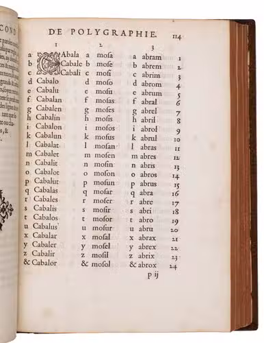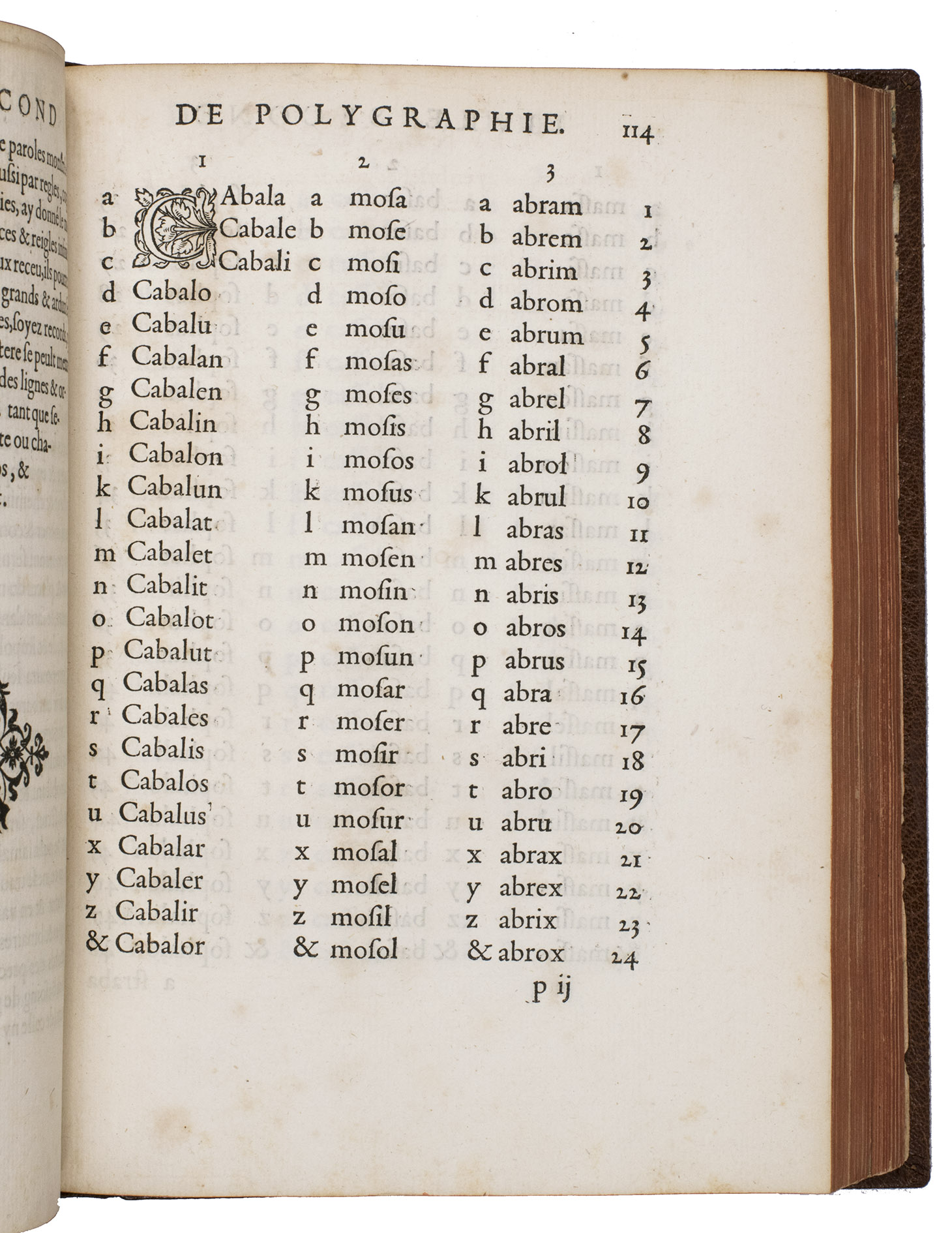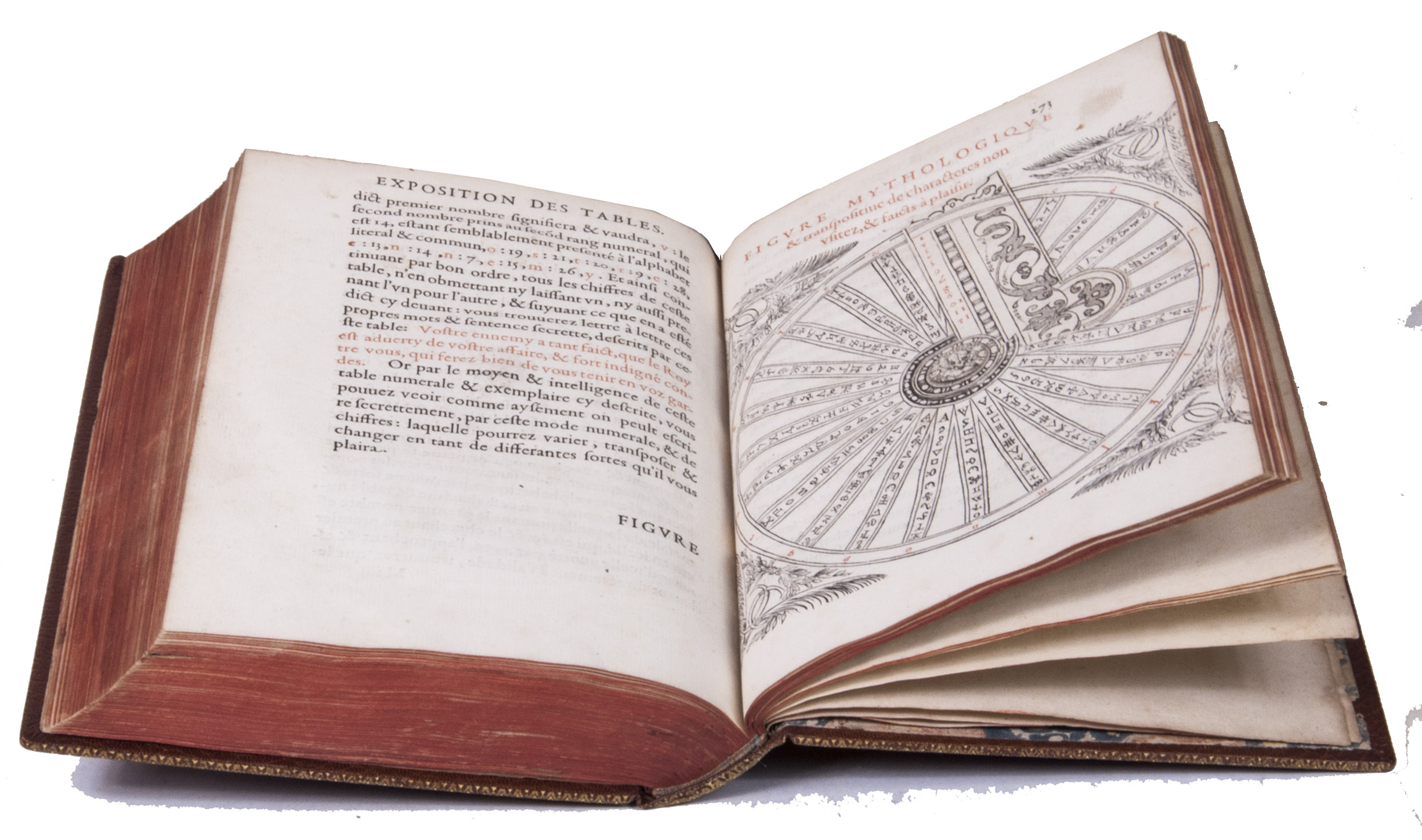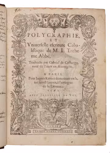 First French edition of the first printed work on cryptography, complete with all the tables and illustrations. This edition is particularly impressive because of the volvelles, which are exclusive to the French edition. The beautifully printed work contains hundreds of codes and ciphers, which could be used for writing or deciphering coded messages. It also includes many ancient alphabets and is the oldest known source for the Theban or witches' alphabet, which is still used in modern witchcraft today.