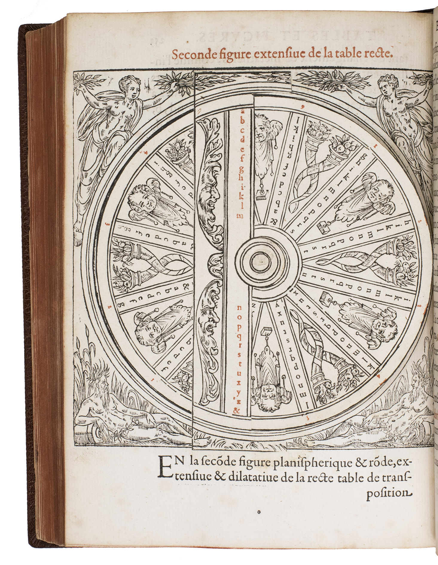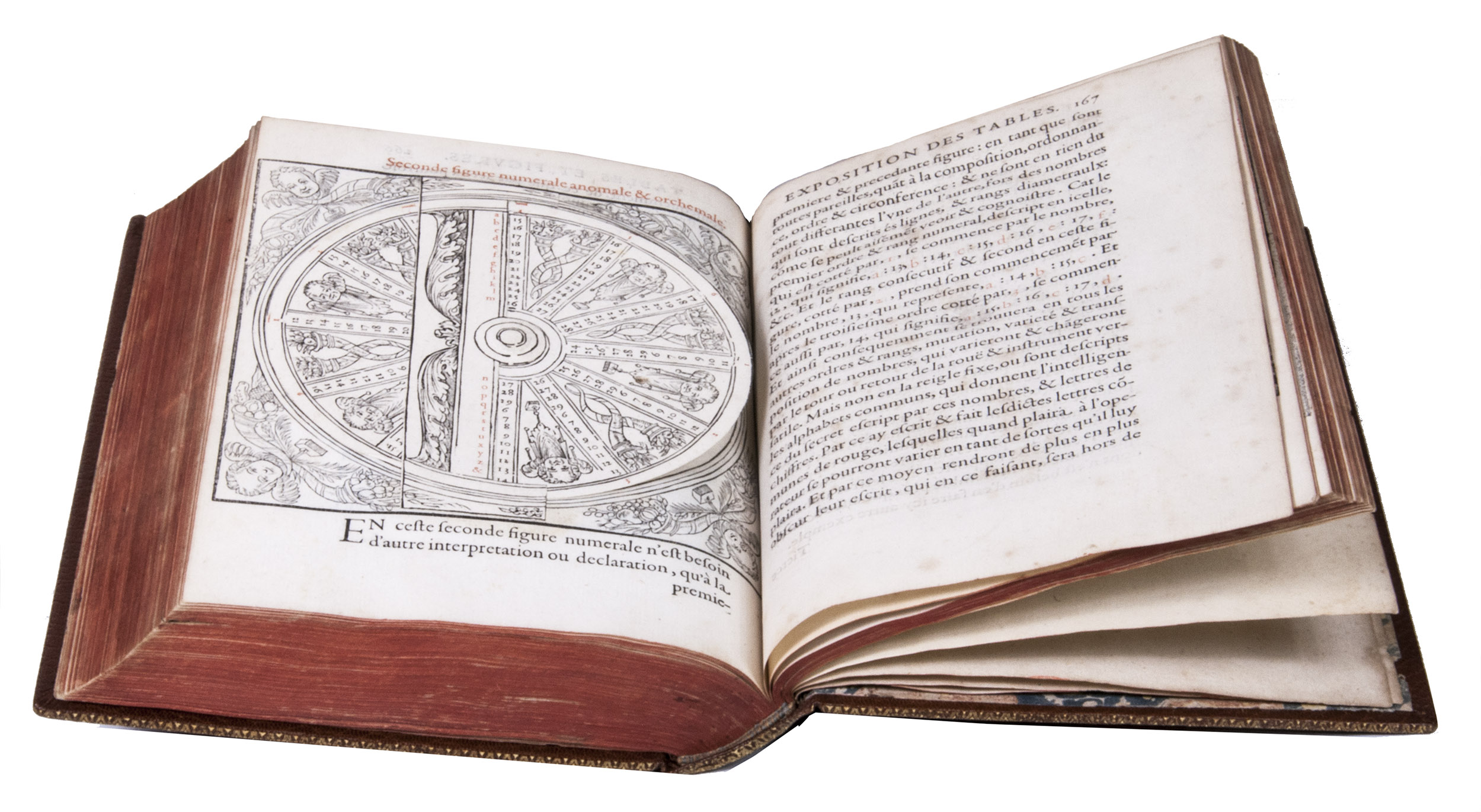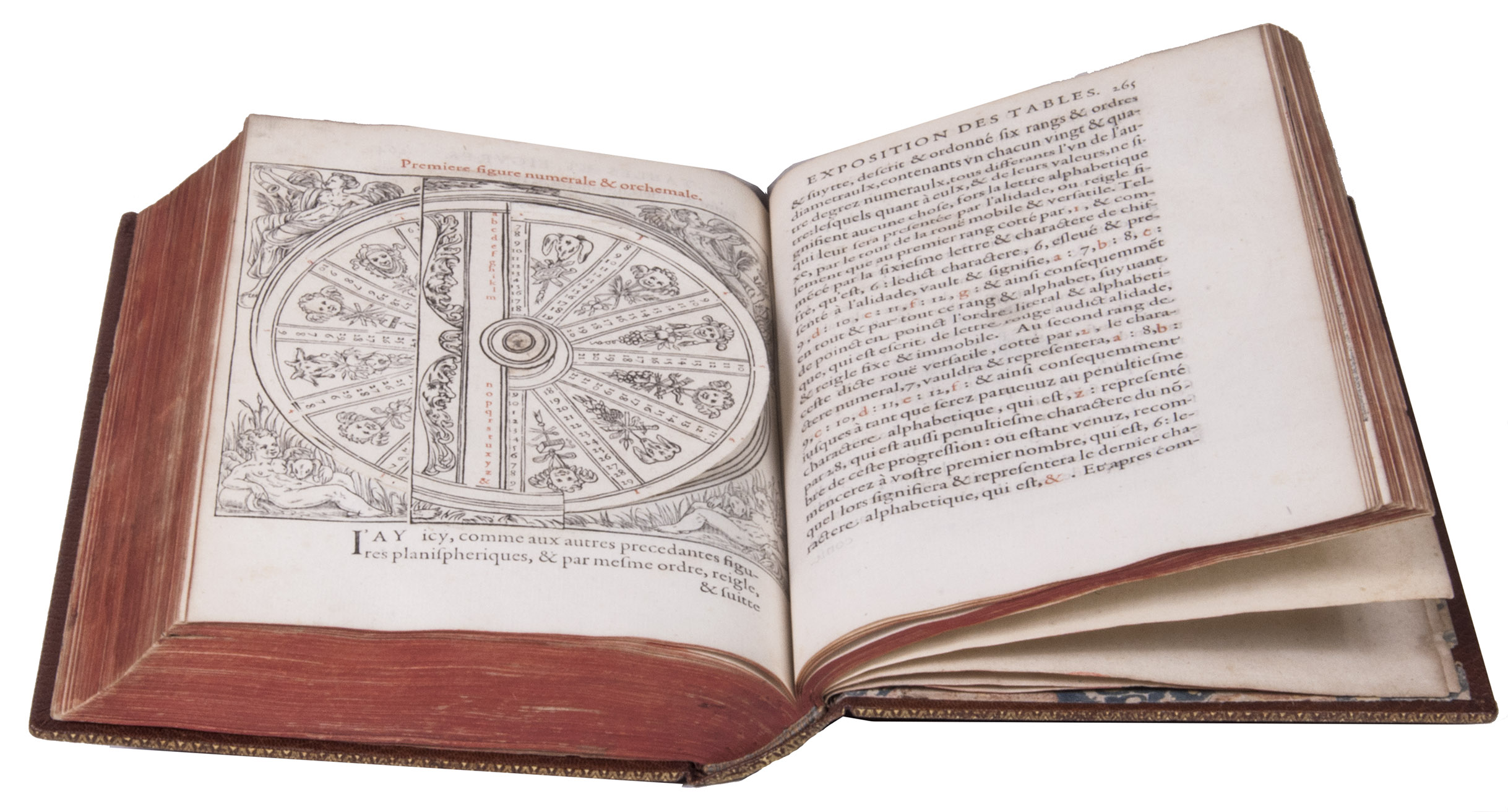 With the bookplates of Henry Pannier (1885-1935) and Guy Bechtel (1931) mounted on the front pastedown, later manuscript annotations with information about the work in four different hands on the verso of the second free endleaf, and a small manuscript inscription at the head of the main title page. With a small restored hole in the outer margin of the title page, not affecting the text, some of the leaves are slightly foxed, with brown stain on the verso of leaf 15, somewhat affecting the text, a water stain in the outer margins of leaves 177-186, some of the volvelles are slightly creased, the end papers have a small tear in the gutter, not affecting the structural integrity of the binding. Otherwise in very good condition. Caillet 10850; Mortimer, Harvard college library: French 16th century books, 528; Pettegree & Walsby 49898; USTC 1225; cf. Glidden, H., Polygraphia and the Renaissance sign: The case of Trithemius. In: Neophilogus 71, 1987, pp. 183-195.