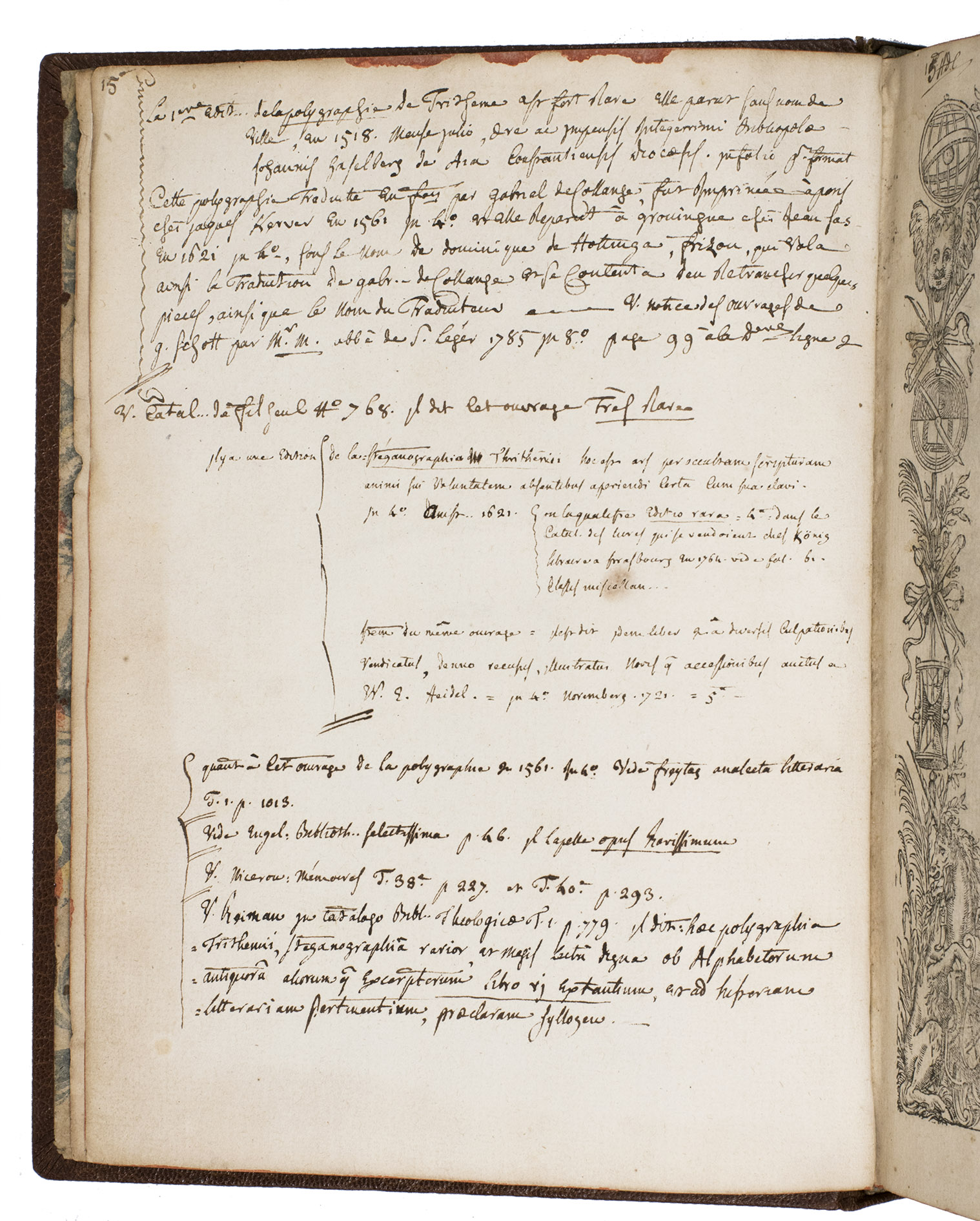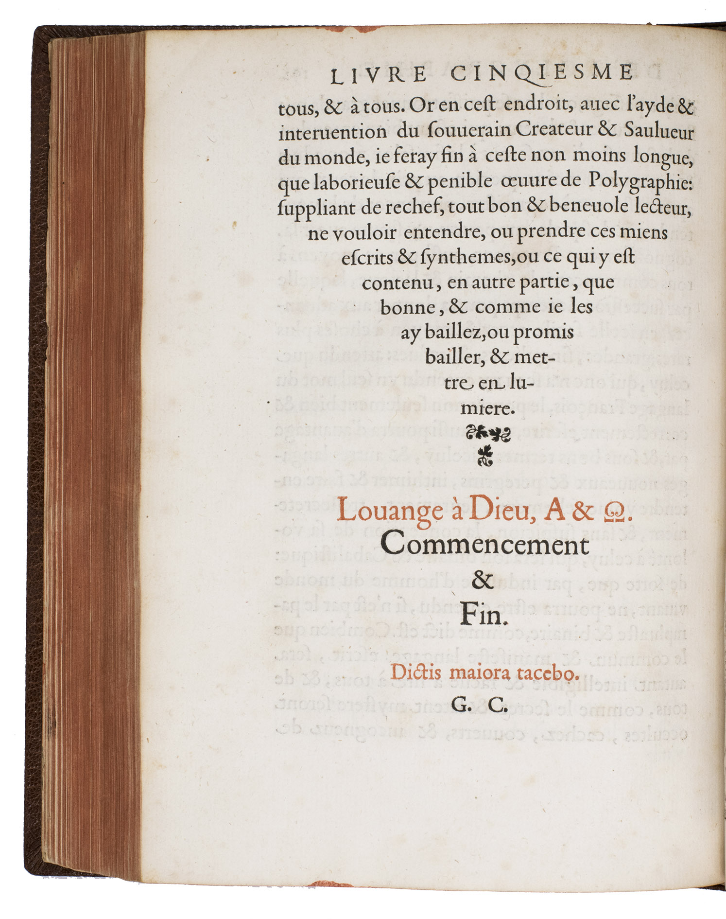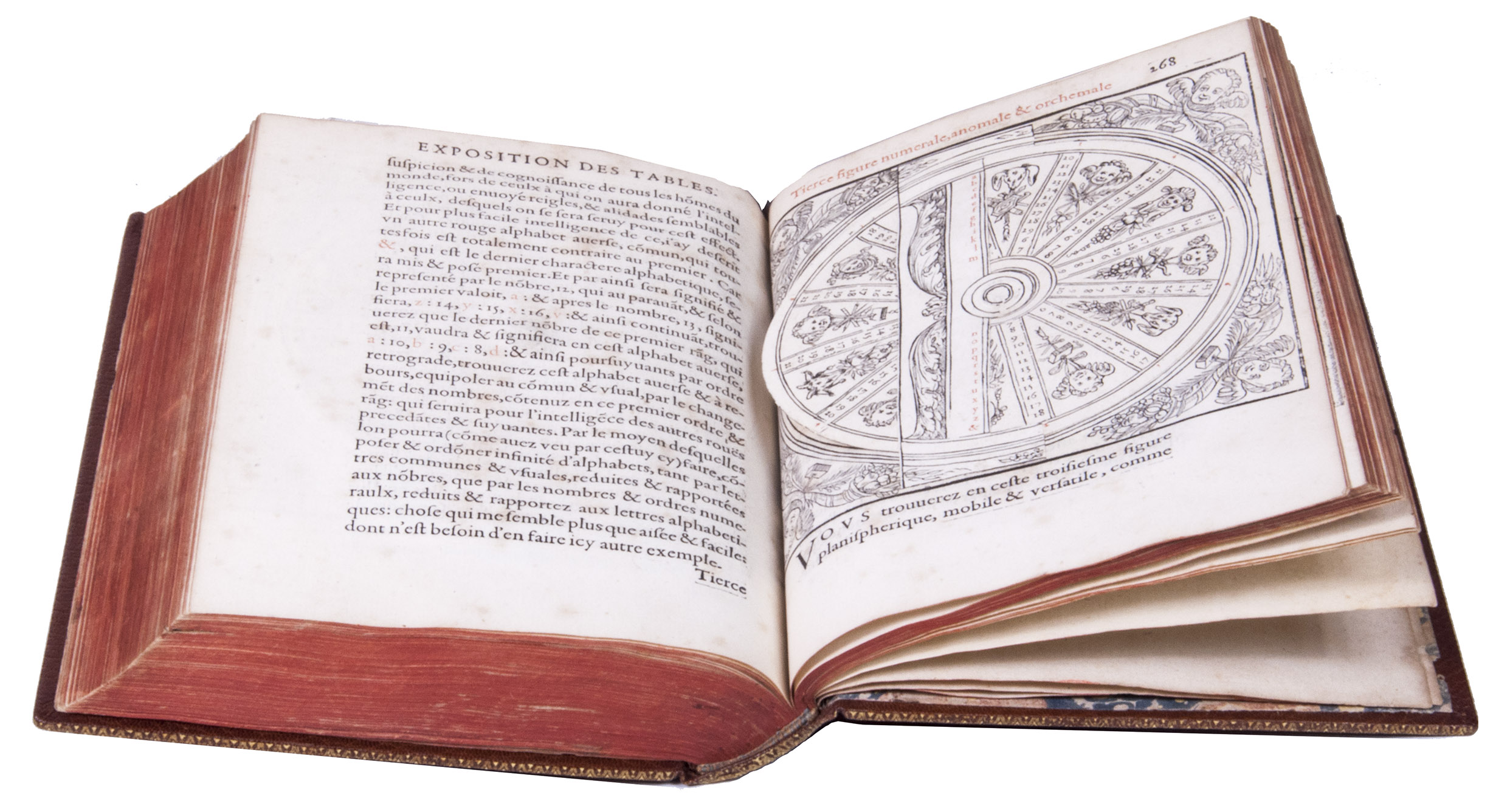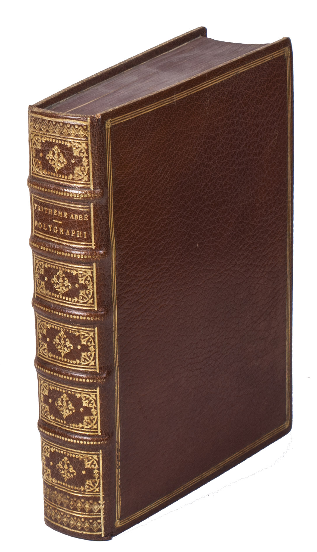 With the bookplates of Henry Pannier (1885-1935) and Guy Bechtel (1931) mounted on the front pastedown, later manuscript annotations with information about the work in four different hands on the verso of the second free endleaf, and a small manuscript inscription at the head of the main title page. With a small restored hole in the outer margin of the title page, not affecting the text, some of the leaves are slightly foxed, with brown stain on the verso of leaf 15, somewhat affecting the text, a water stain in the outer margins of leaves 177-186, some of the volvelles are slightly creased, the end papers have a small tear in the gutter, not affecting the structural integrity of the binding. Otherwise in very good condition. Caillet 10850; Mortimer, Harvard college library: French 16th century books, 528; Pettegree & Walsby 49898; USTC 1225; cf. Glidden, H., Polygraphia and the Renaissance sign: The case of Trithemius. In: Neophilogus 71, 1987, pp. 183-195.