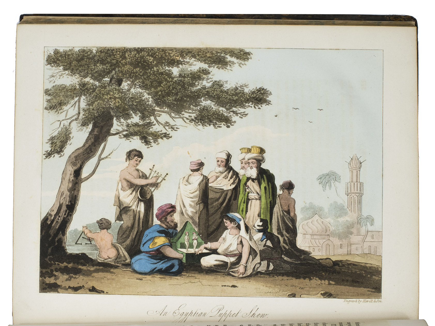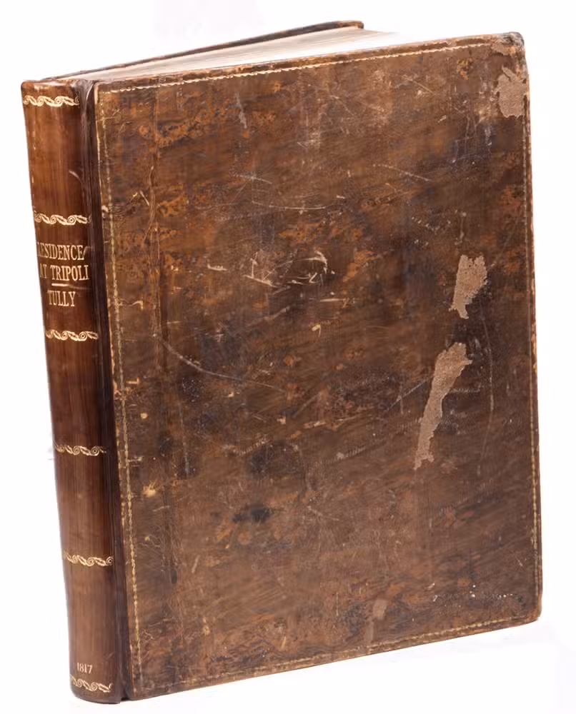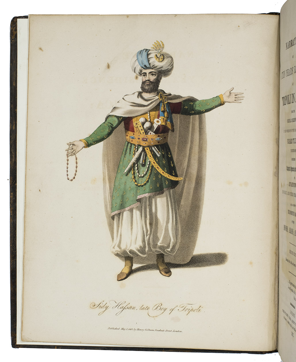 London, Henry Colburn, 1817. Large 4to. Engraved coloured frontispiece of Sidy Hassan, late Bey of Tripoli, folding engraved map (220 x 390 mm) of the regencies of Tripoli and Tunis, signed "Neele scuplt. Strand", 6 full-page plates of the Triumphal Arch of Tripoli, Arabs recreating in the desert, a Bedouin woman, officers of the Grand Seraglio, a guard of Tripoli, and an Egyptian puppet- shew, all engraved by Hoovell & Son and beautifully coloured by hand. Contemporary calf, spine with title lettered in gold, gilt fillet border on covers, marbled edges. XIII, [2], 376 pp.