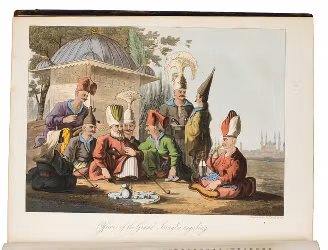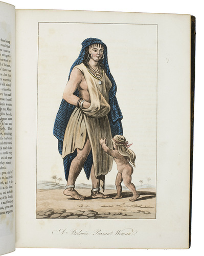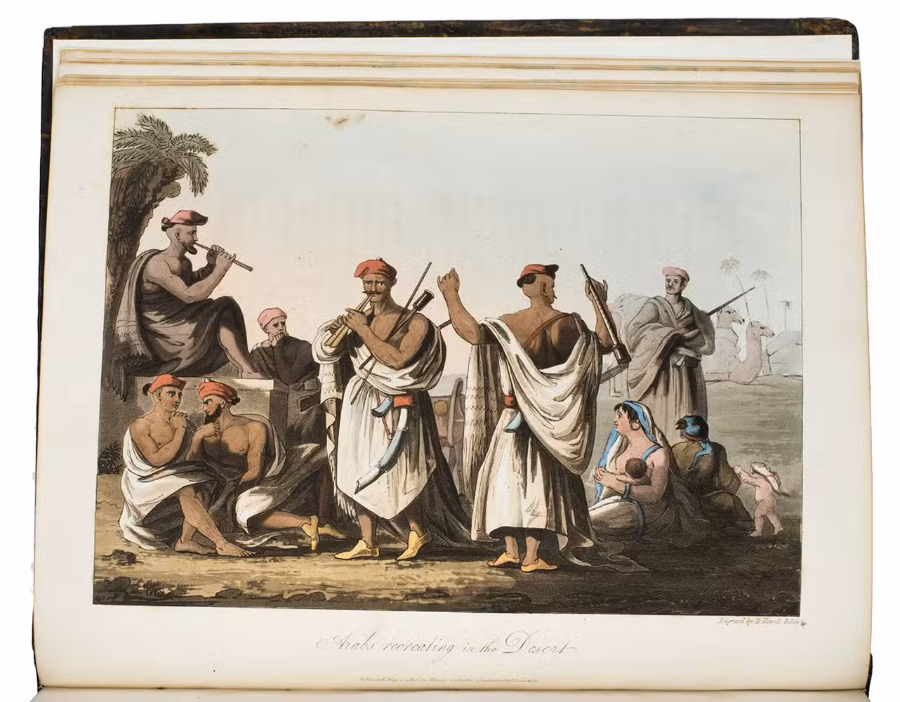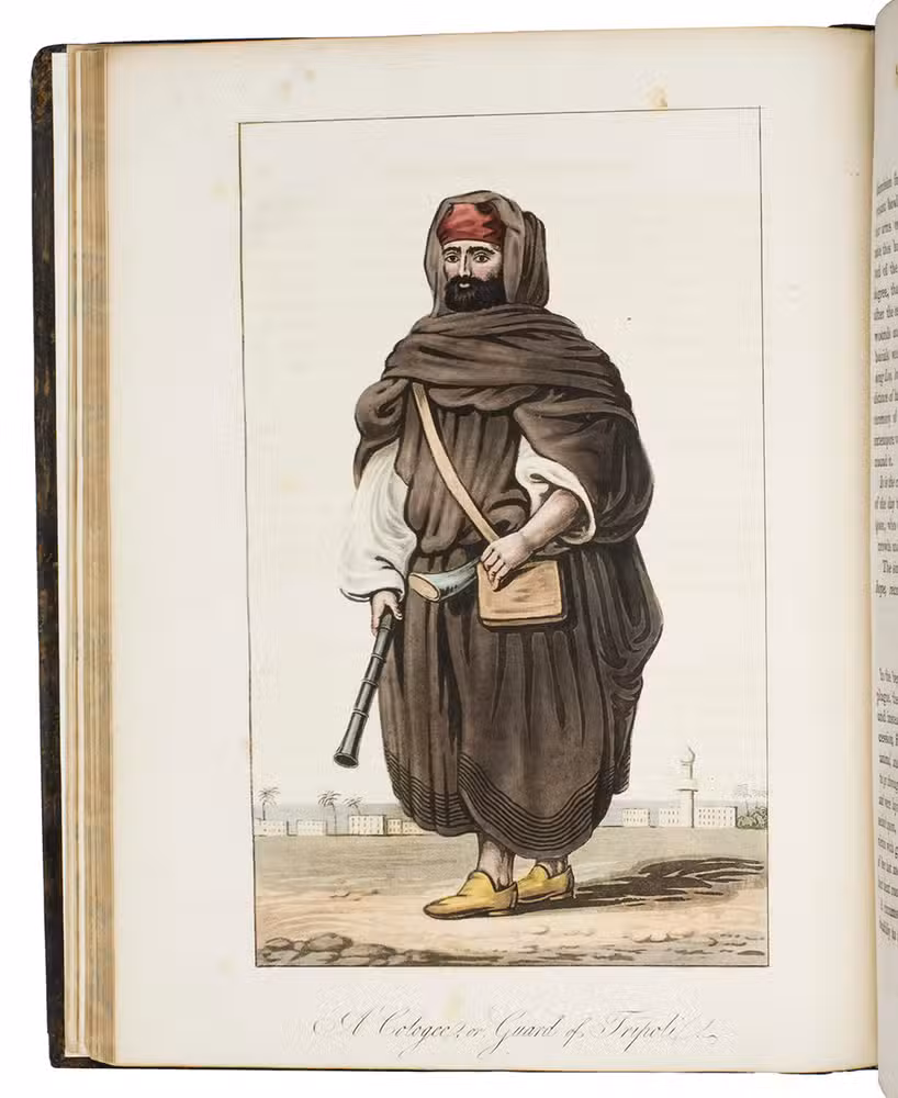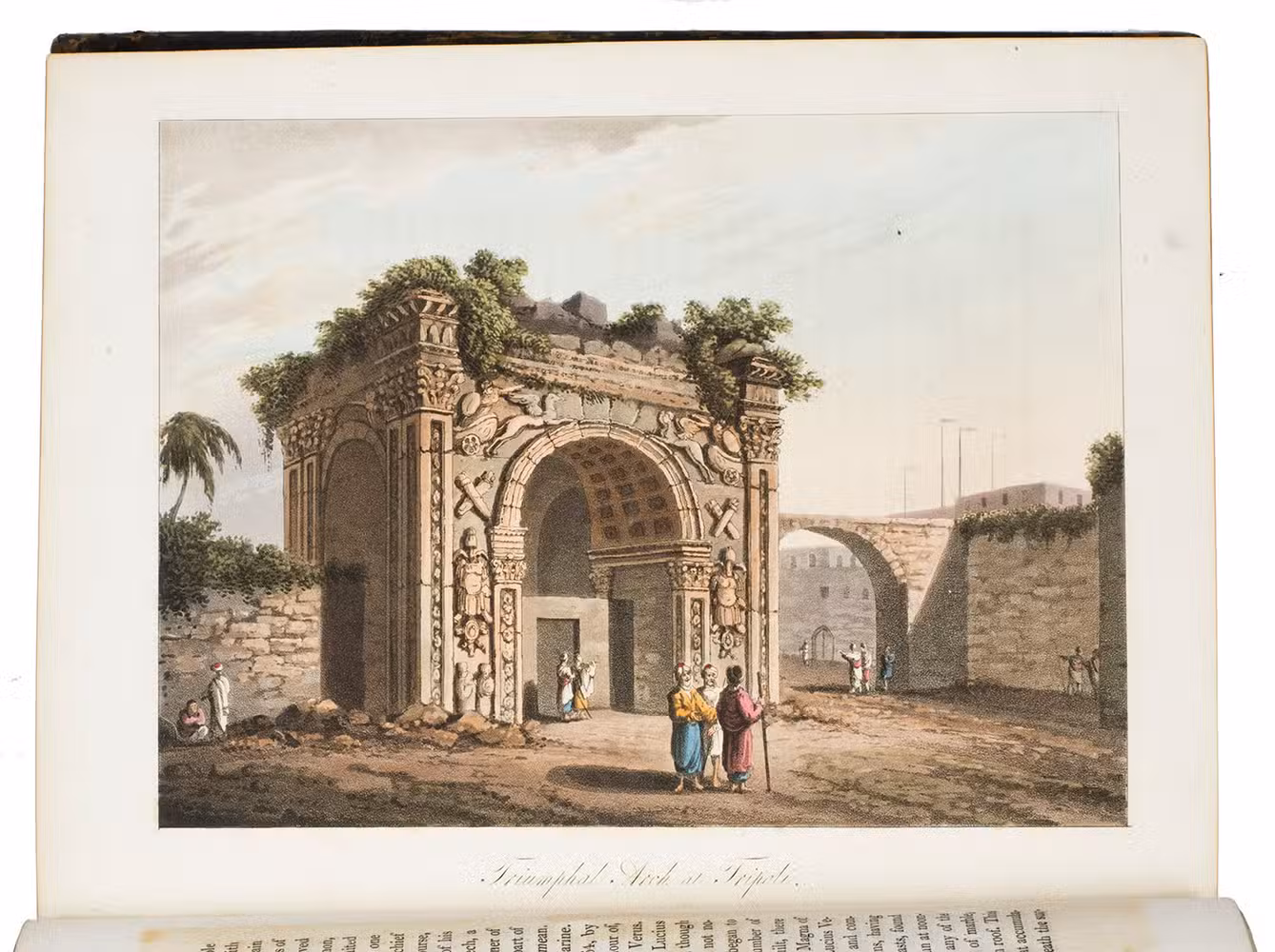 London, Henry Colburn, 1817. Large 4to. Engraved coloured frontispiece of Sidy Hassan, late Bey of Tripoli, folding engraved map (220 x 390 mm) of the regencies of Tripoli and Tunis, signed "Neele scuplt. Strand", 6 full-page plates of the Triumphal Arch of Tripoli, Arabs recreating in the desert, a Bedouin woman, officers of the Grand Seraglio, a guard of Tripoli, and an Egyptian puppet- shew, all engraved by Hoovell & Son and beautifully coloured by hand. Contemporary calf, spine with title lettered in gold, gilt fillet border on covers, marbled edges. XIII, [2], 376 pp.