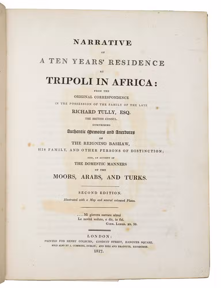 Narrative of a ten years' residence at Tripoli in Africa: from the original correspondence in the possession of the family of the late Richard Tully, esq. the British consul. Comprising authentic memoirs and anecdotes of the reigning Bashaw, his family, and other persons of distinction; also, an account of the domestic manners of the Moors, Arabs, and Turks.