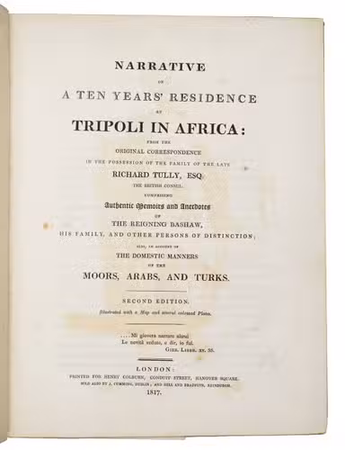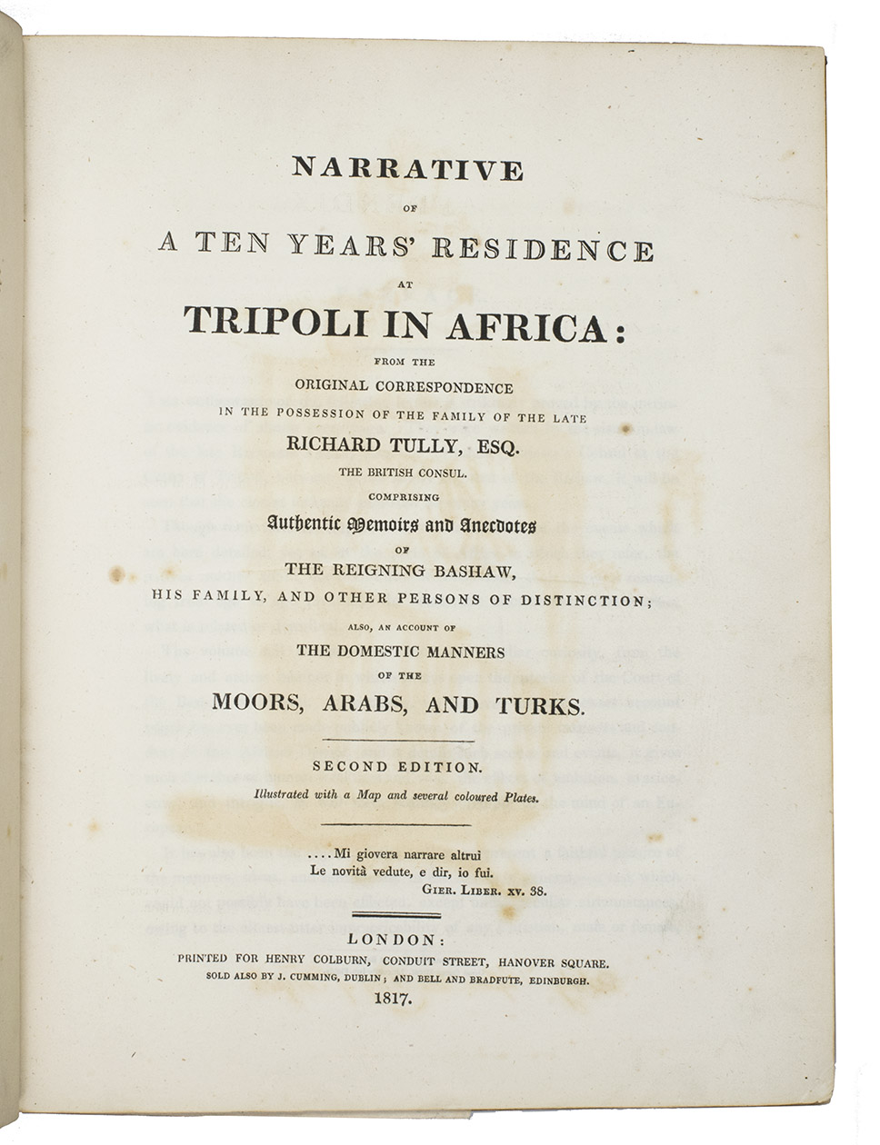 Second edition of this collection of letters on Tripoli, containing valuable information on the court of the Bashaw of Tripoli, being one of the few accounts made publicly known of the private manners of this African despot. The letters were written by Miss Tully, the sister-in-law of the late Richard Tully, British Consul in Tripoli (1783-1793), as is mentioned in the preface. Edwards in his Catalogue of books on Africa attributes the letters to Richard Tully. Her family was very intimate with that of the Bashaw, which gave the author the opportunity to collect this large amount of specific information.