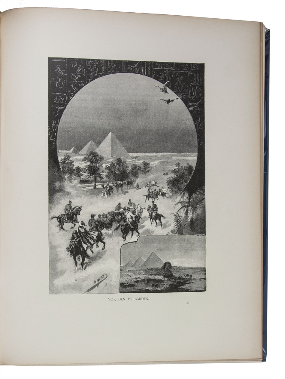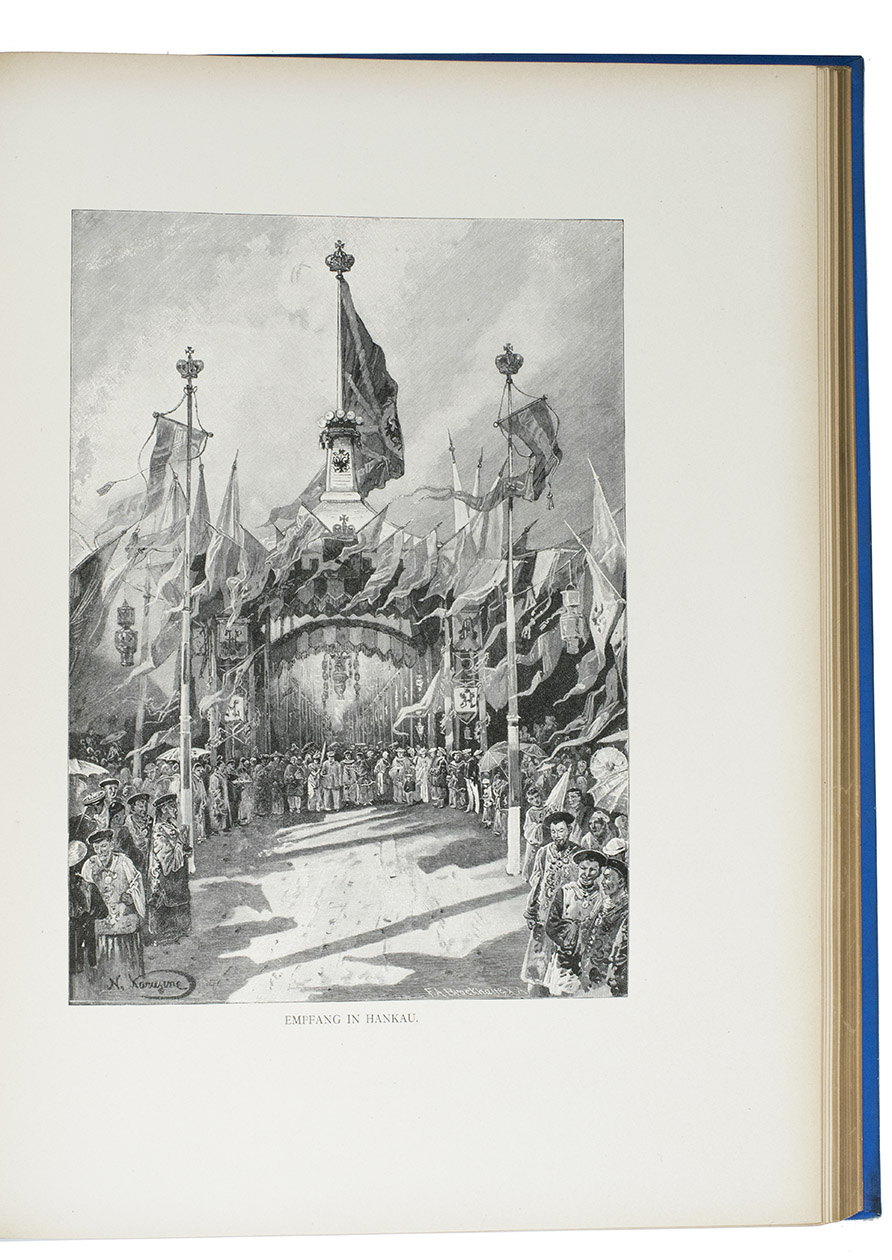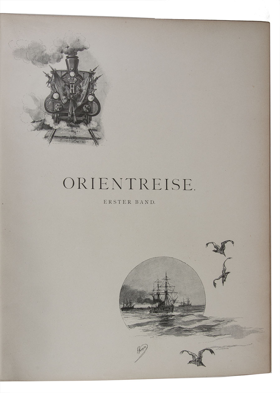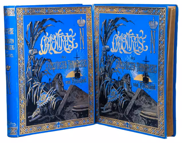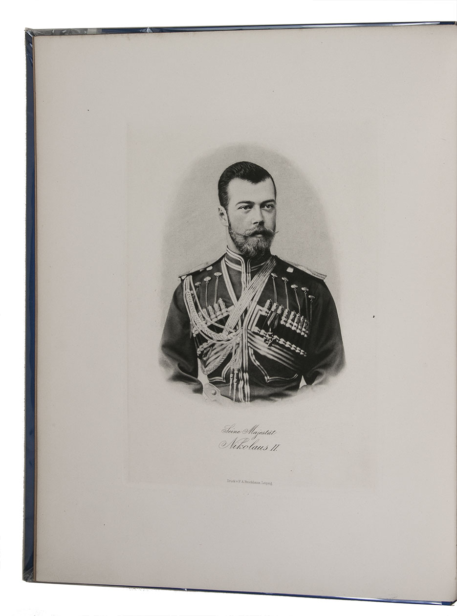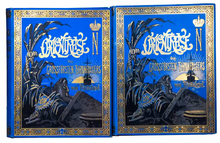 First and only edition in German of a richly illustrated travelogue of a journey around the Eurasian continent, made by the future Russian Czar Nicholas II. The journey was planned as a Grand Tour through Europe and Asia with the opening ceremony of the Trans-Siberian Railway as the final destination. After visiting Austria, Italy and Greece, Nicholas travelled to Egypt and through the Suez Canal to India. Subsequently Nicholas and his entourage visited the Dutch-East Indies, Siam and China. In Japan the future emperor had a fire breathing dragon tattooed on his arm and received a facial scar due to an assassination attempt. After the opening of the railway in Siberia, the travellers boarded the train back to St. Petersburg.