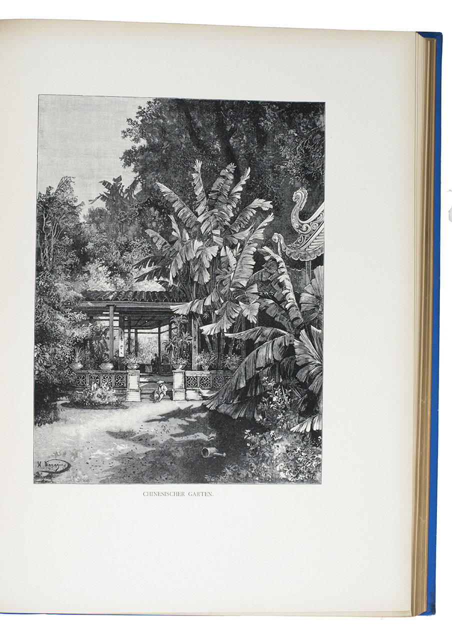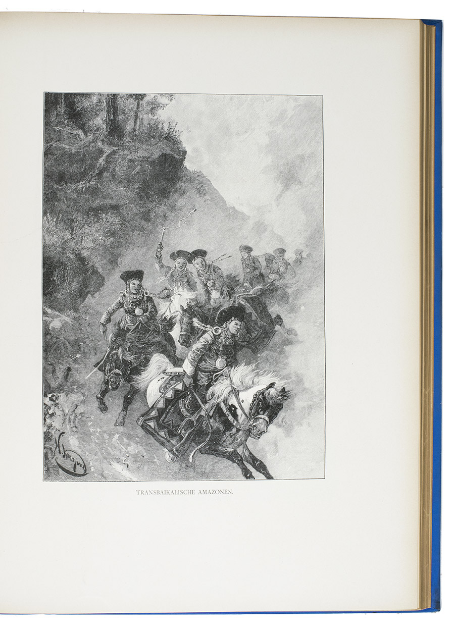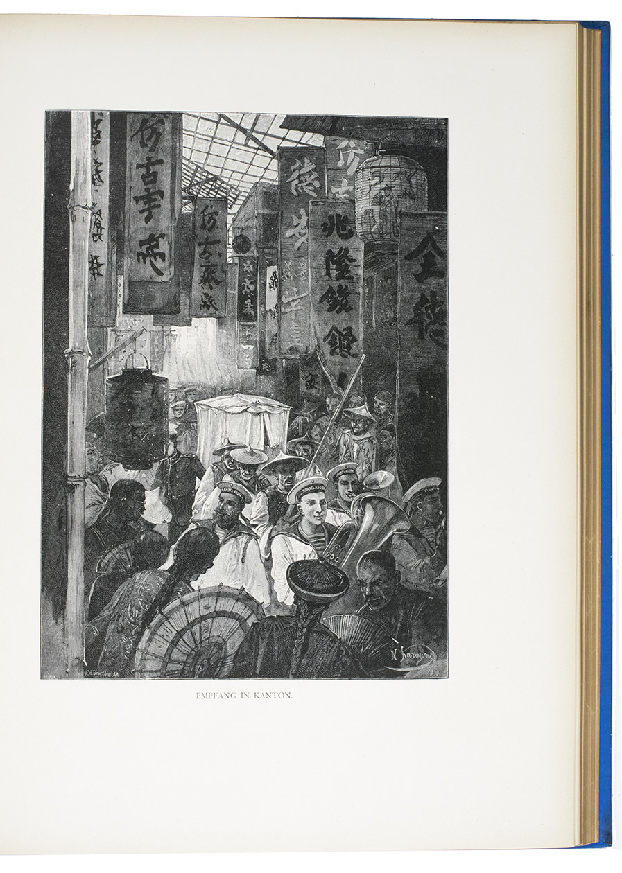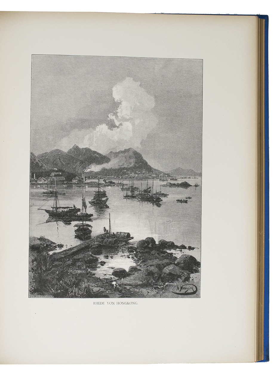 First and only edition in German of a richly illustrated travelogue of a journey around the Eurasian continent, made by the future Russian Czar Nicholas II. The journey was planned as a Grand Tour through Europe and Asia with the opening ceremony of the Trans-Siberian Railway as the final destination. After visiting Austria, Italy and Greece, Nicholas travelled to Egypt and through the Suez Canal to India. Subsequently Nicholas and his entourage visited the Dutch-East Indies, Siam and China. In Japan the future emperor had a fire breathing dragon tattooed on his arm and received a facial scar due to an assassination attempt. After the opening of the railway in Siberia, the travellers boarded the train back to St. Petersburg.