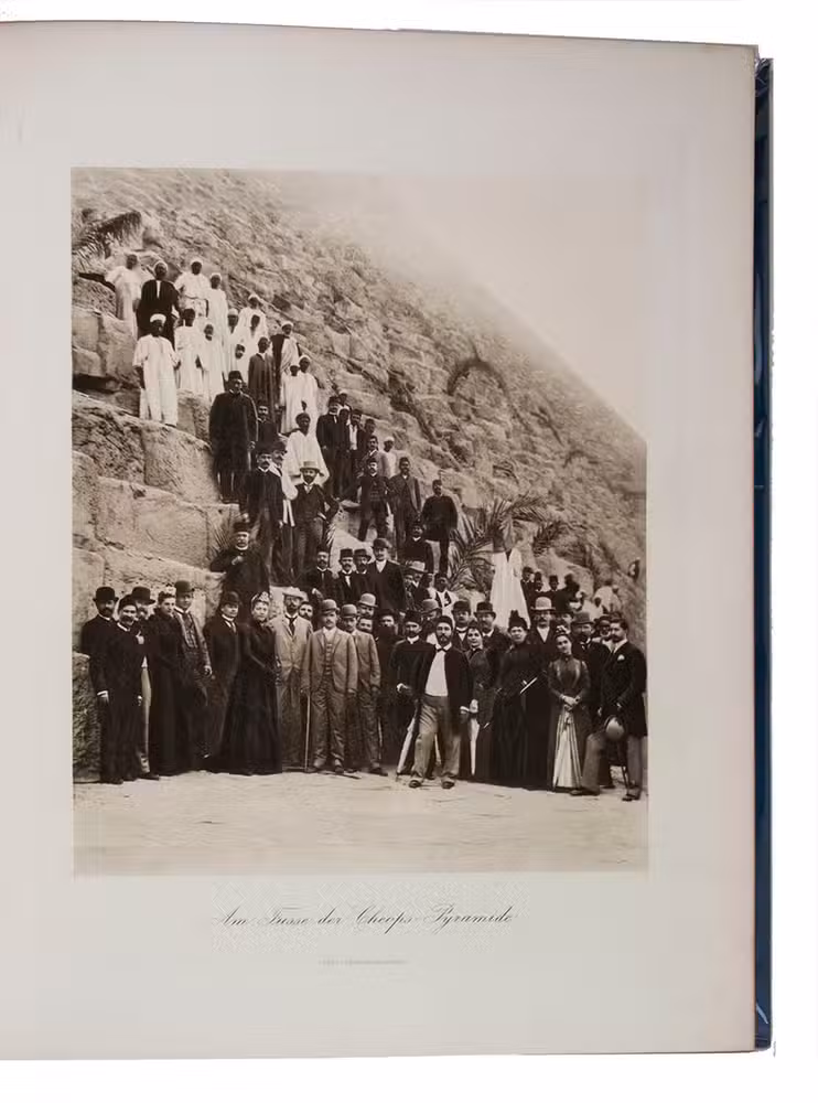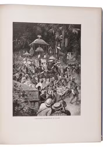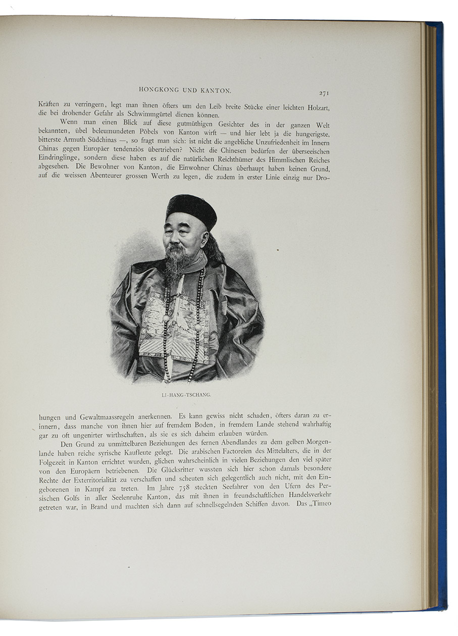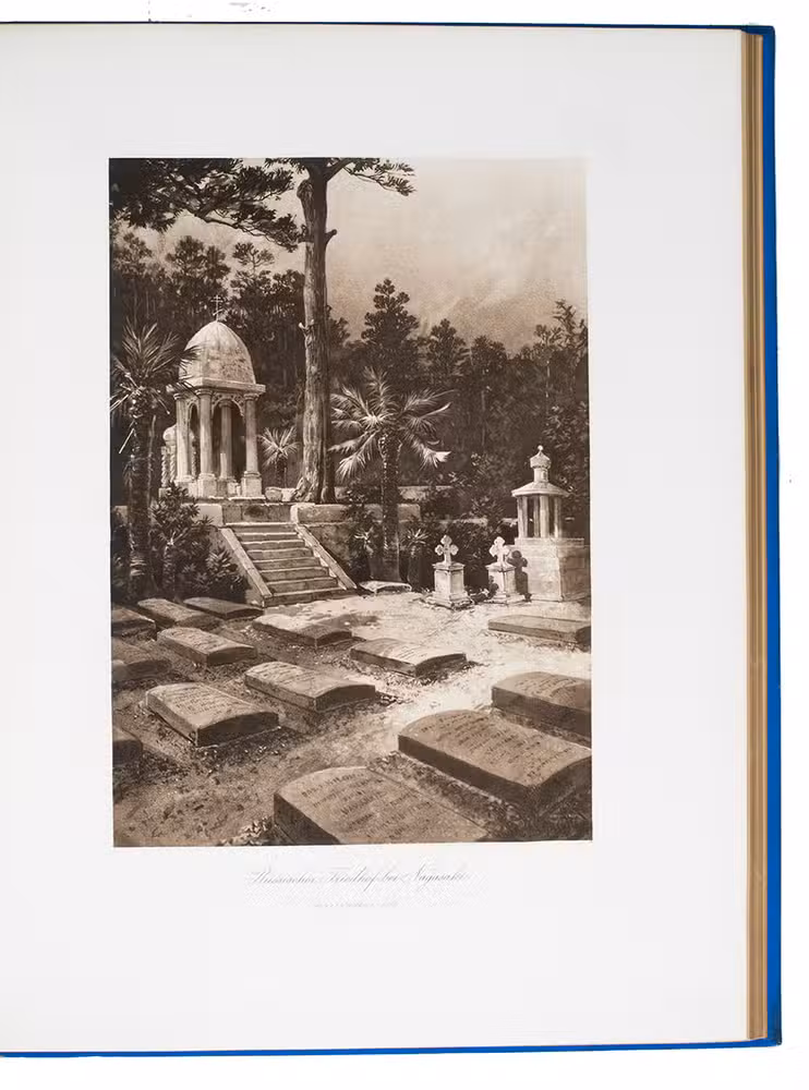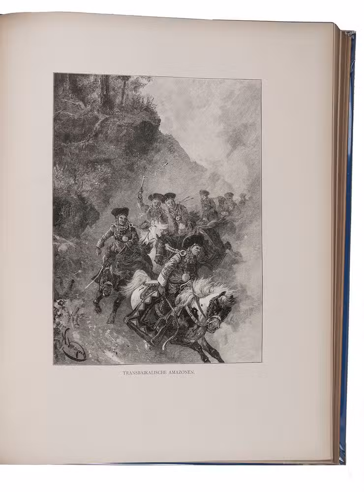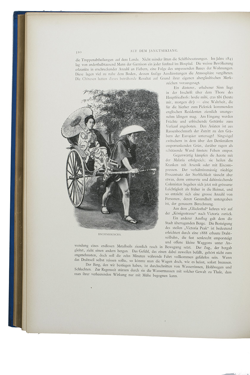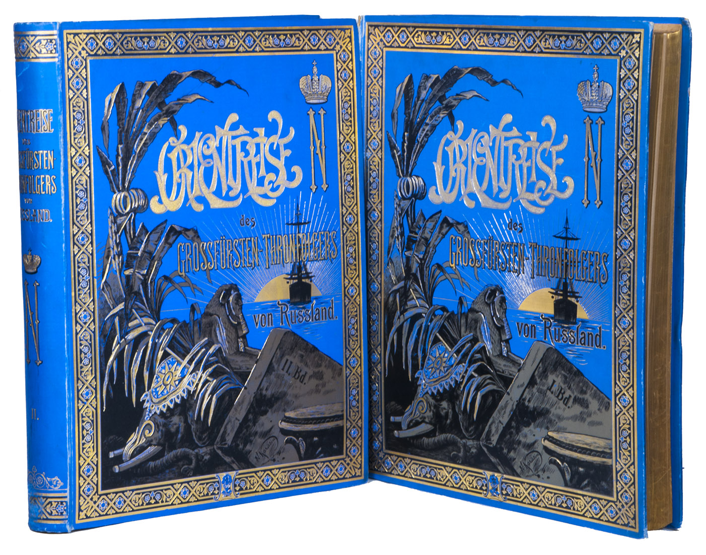 First and only edition in German of a richly illustrated travelogue of a journey around the Eurasian continent, made by the future Russian Czar Nicholas II. The journey was planned as a Grand Tour through Europe and Asia with the opening ceremony of the Trans-Siberian Railway as the final destination. After visiting Austria, Italy and Greece, Nicholas travelled to Egypt and through the Suez Canal to India. Subsequently Nicholas and his entourage visited the Dutch-East Indies, Siam and China. In Japan the future emperor had a fire breathing dragon tattooed on his arm and received a facial scar due to an assassination attempt. After the opening of the railway in Siberia, the travellers boarded the train back to St. Petersburg.