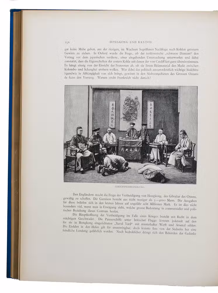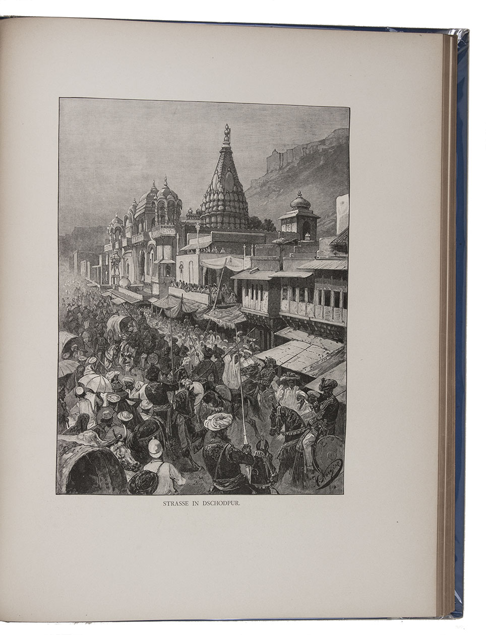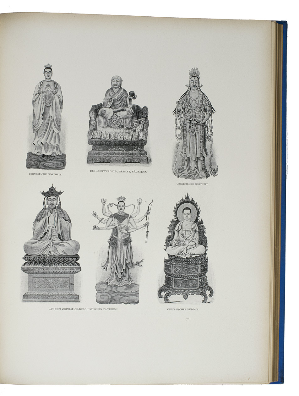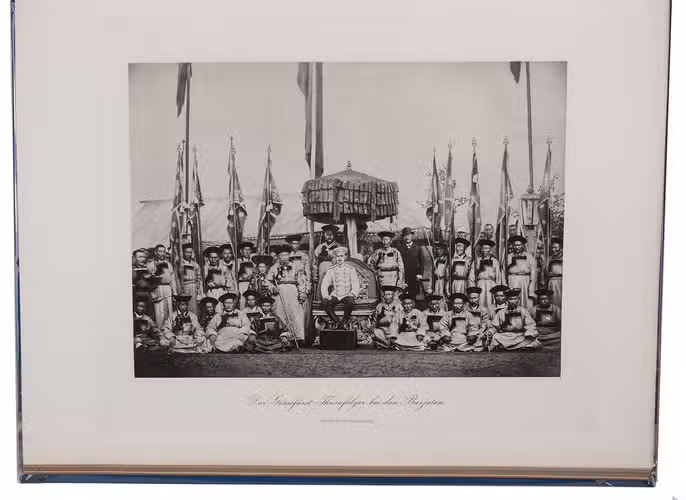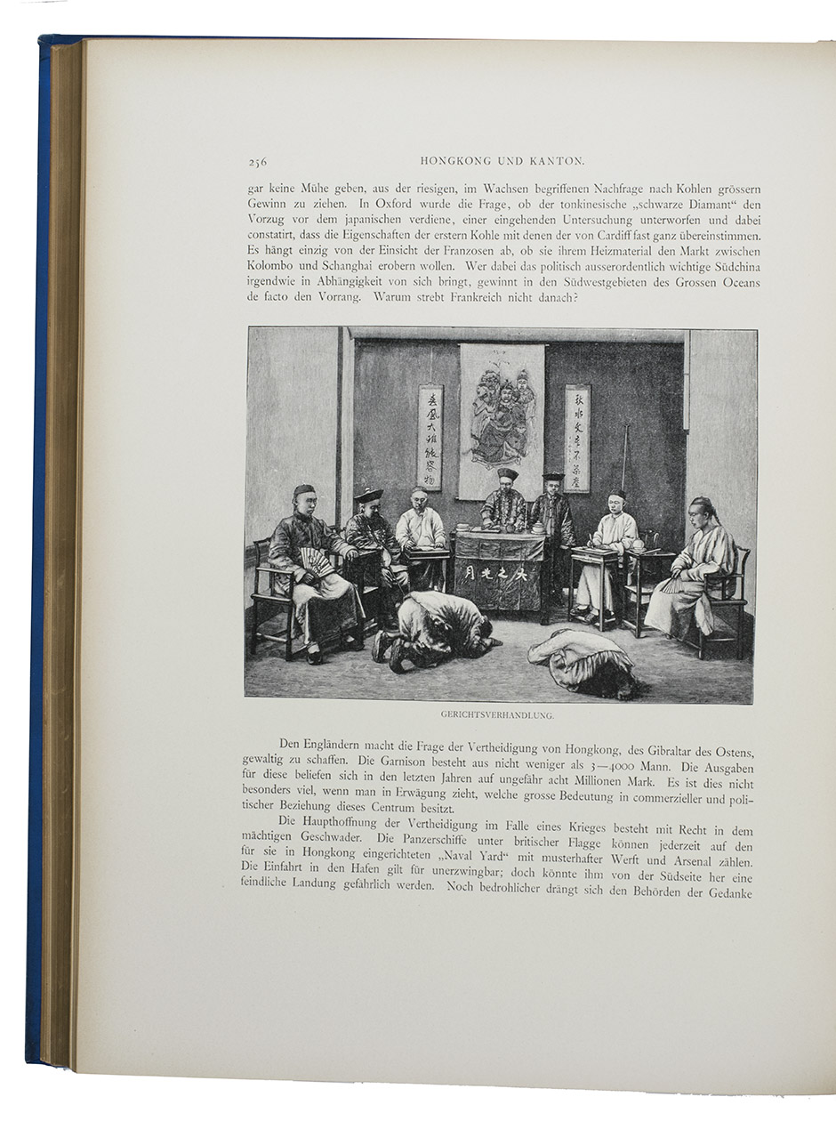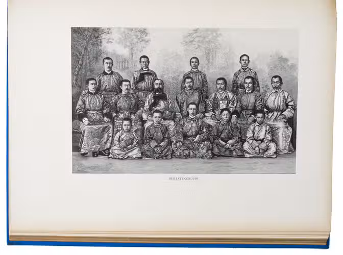 First and only edition in German of a richly illustrated travelogue of a journey around the Eurasian continent, made by the future Russian Czar Nicholas II. The journey was planned as a Grand Tour through Europe and Asia with the opening ceremony of the Trans-Siberian Railway as the final destination. After visiting Austria, Italy and Greece, Nicholas travelled to Egypt and through the Suez Canal to India. Subsequently Nicholas and his entourage visited the Dutch-East Indies, Siam and China. In Japan the future emperor had a fire breathing dragon tattooed on his arm and received a facial scar due to an assassination attempt. After the opening of the railway in Siberia, the travellers boarded the train back to St. Petersburg.