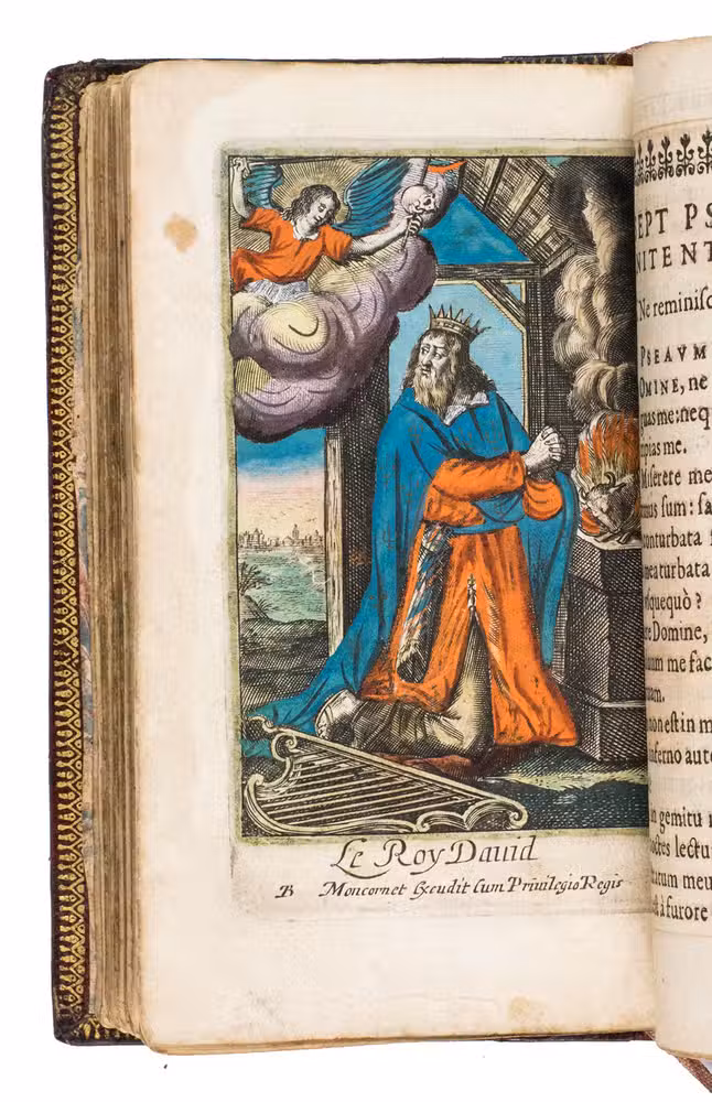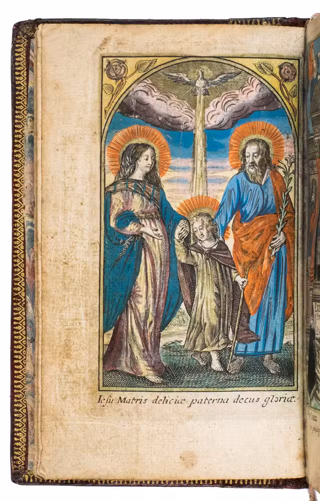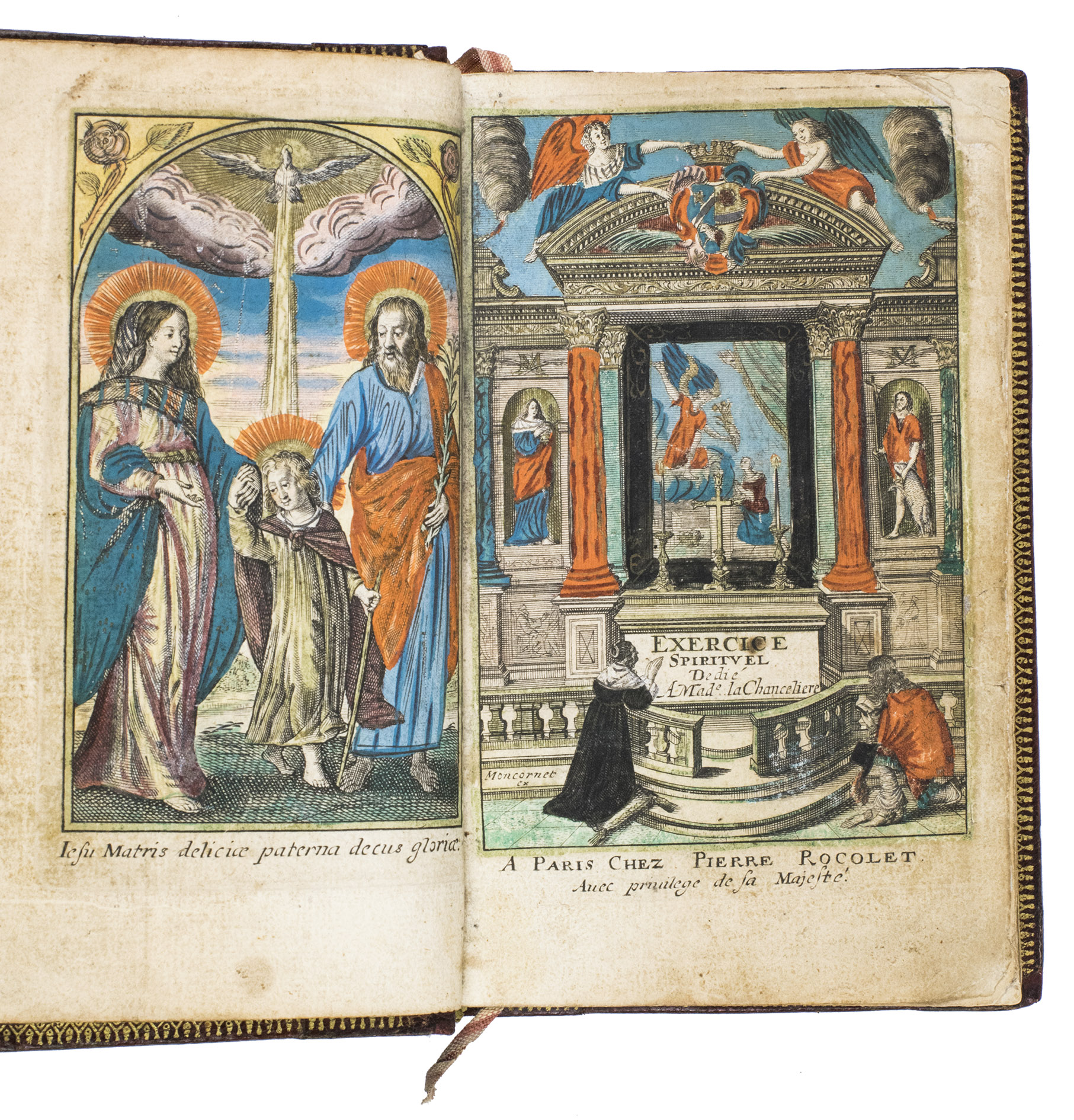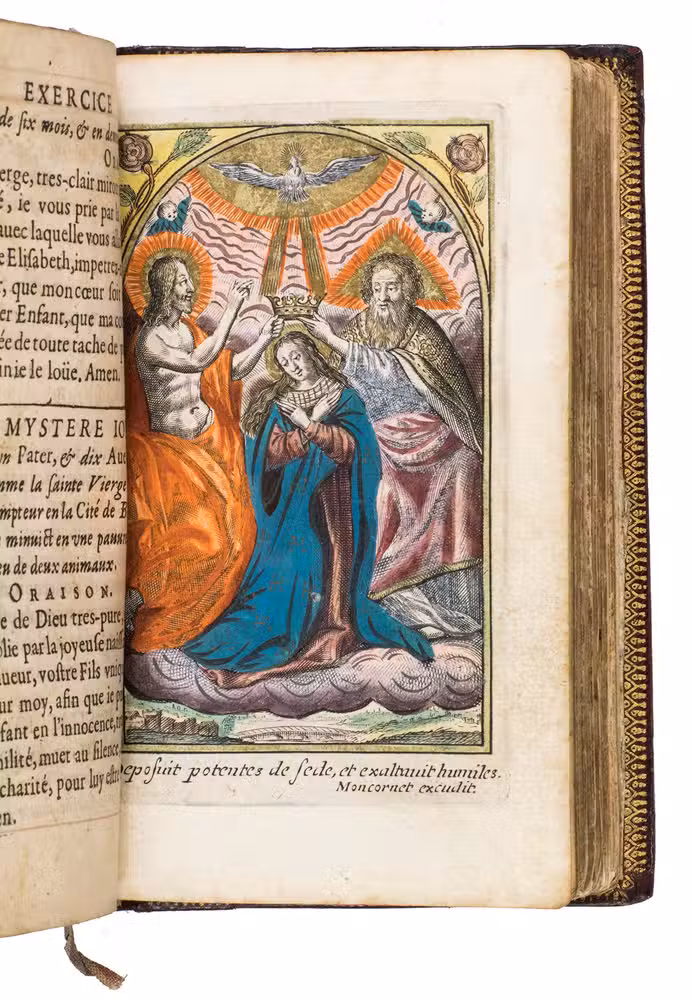 The Exercice spirituel is a devotional handbook. It contains a guide to the Sacraments, and the Hours of the Virgin. According to the title page, it was written by V.C.P., who has not yet been identified. The work is dedicated to Madame Séguier, the wife of Rocolet's patron. The present edition is most likely the second, as we have been able to trace editions of 1643, 1651, 1657, and 1658 in sales records. Each edition appears to have different illustrations. The present includes 9 hand-coloured devotional prints, made by the French artist Balthasar Moncornet (1600-1668), depicting the Holy Family, the Visitation, St. Anne, the Coronation of the Virgin, Mary with Christ, King David, and the three Holy Sacraments.