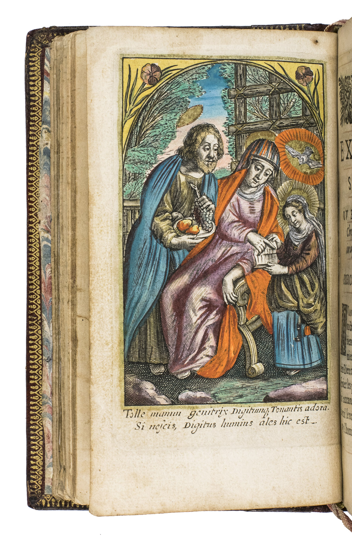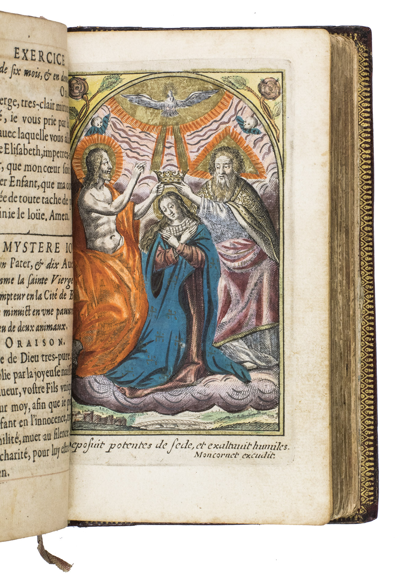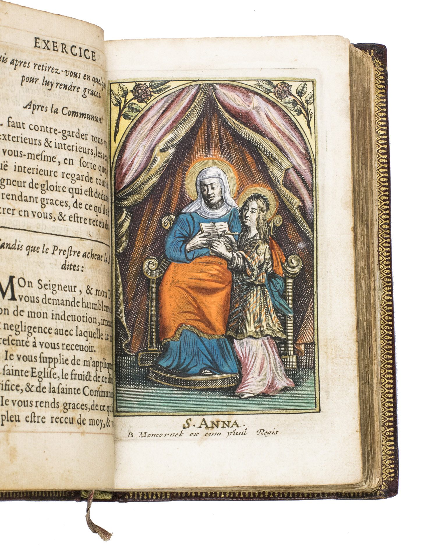The Exercice spirituel is a devotional handbook. It contains a guide to the Sacraments, and the Hours of the Virgin. According to the title page, it was written by V.C.P., who has not yet been identified. The work is dedicated to Madame Séguier, the wife of Rocolet's patron. The present edition is most likely the second, as we have been able to trace editions of 1643, 1651, 1657, and 1658 in sales records. Each edition appears to have different illustrations. The present includes 9 hand-coloured devotional prints, made by the French artist Balthasar Moncornet (1600-1668), depicting the Holy Family, the Visitation, St. Anne, the Coronation of the Virgin, Mary with Christ, King David, and the three Holy Sacraments.