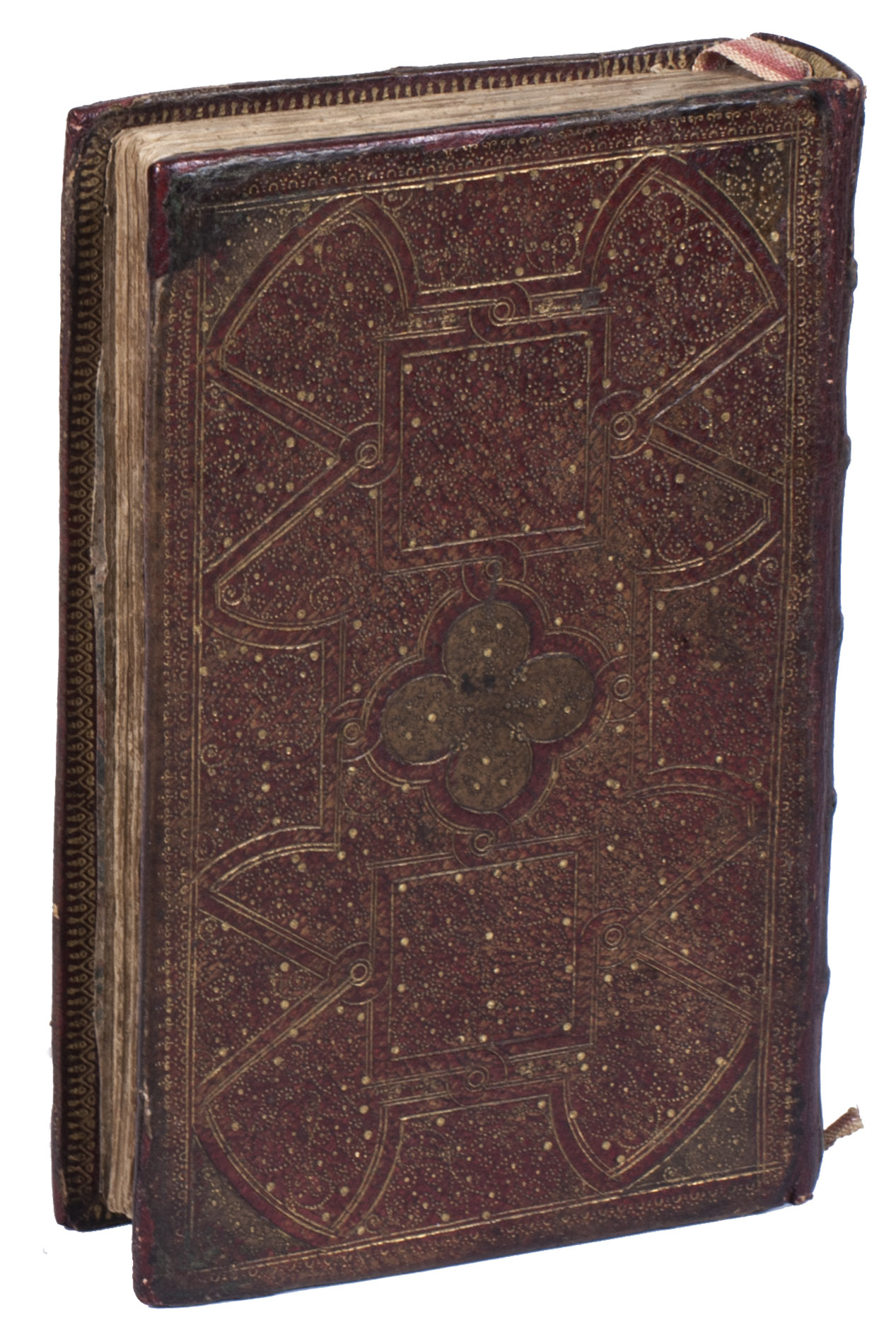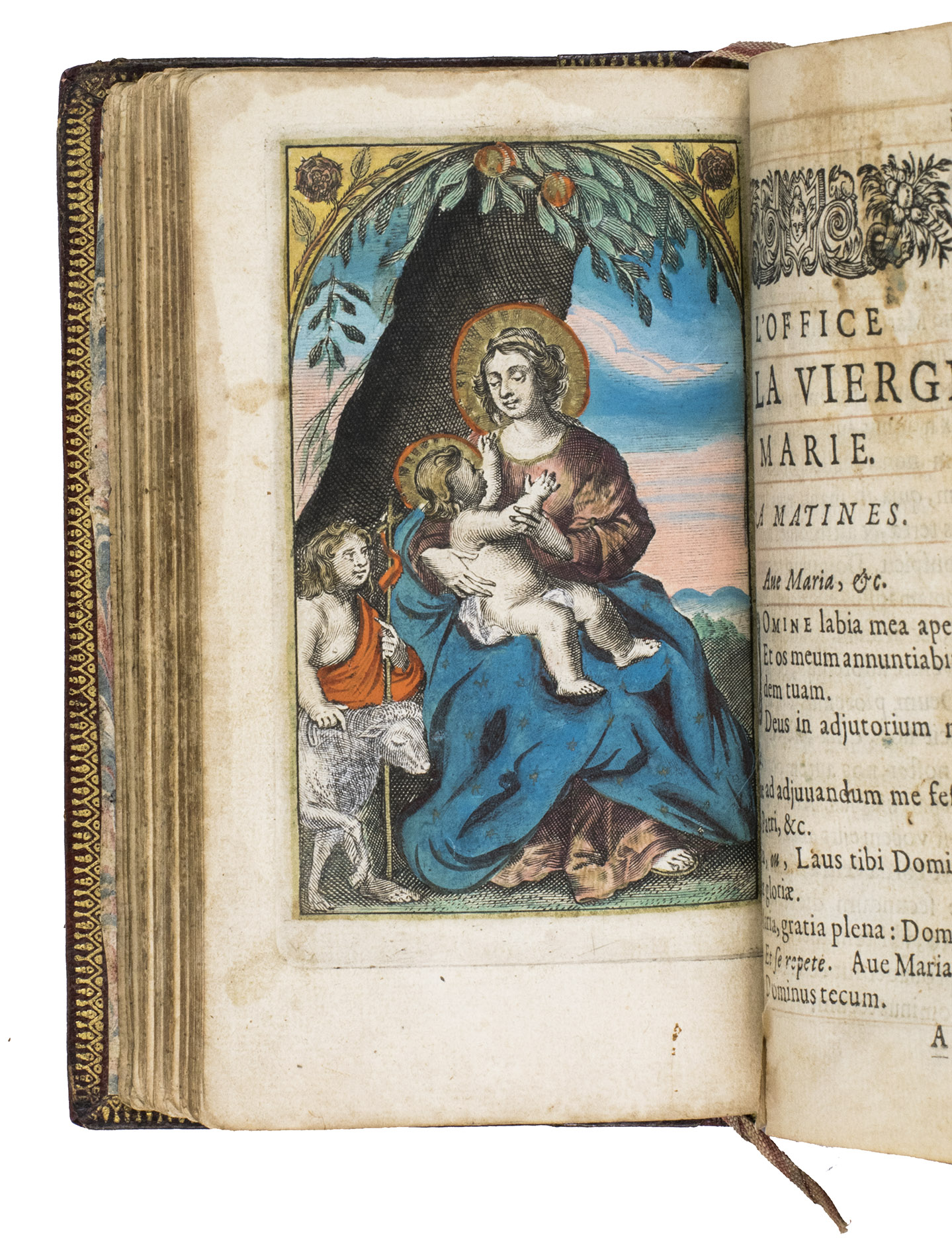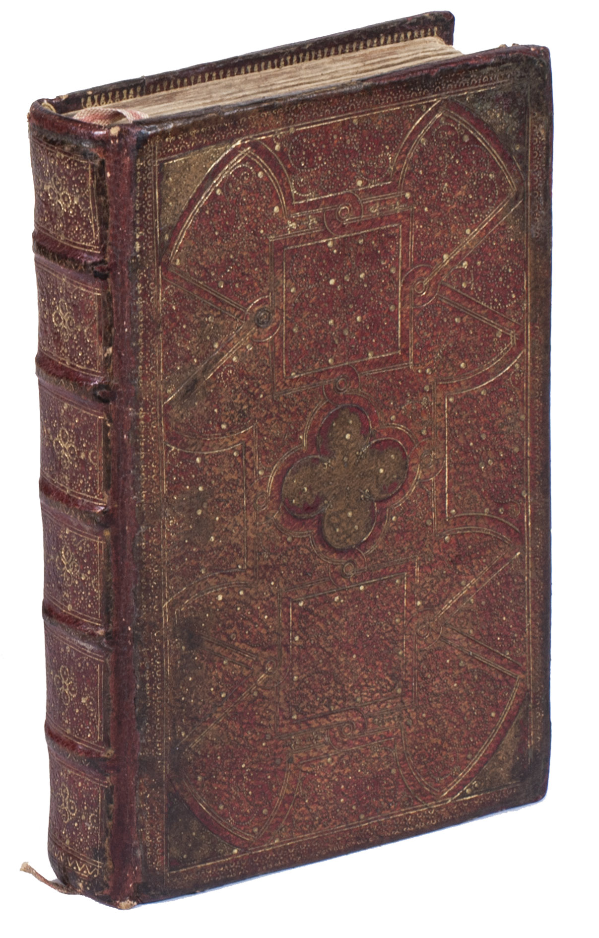 Paris, Pierre Rocolet, 1649. 2 parts in 1 volume. 12mo. With an engraved title, 9 full-page engraved plates, all hand-coloured and heightened with gold, 5 woodcut headpieces, and 5 decorated woodcut initials. Every page has been outlined in red, and some of the chapter headings have been traced with gold. Contemporary elaborately gold-tooled red morocco fanfare binding, with a central quatrefoil inlay of brown morocco on both boards, surrounded by geometric and pointillé designs, gold-tooled board edges and turn-ins, gilt pointillé edges, marbled endpapers. [1], [1 blank], [42], 172; 288 pp.