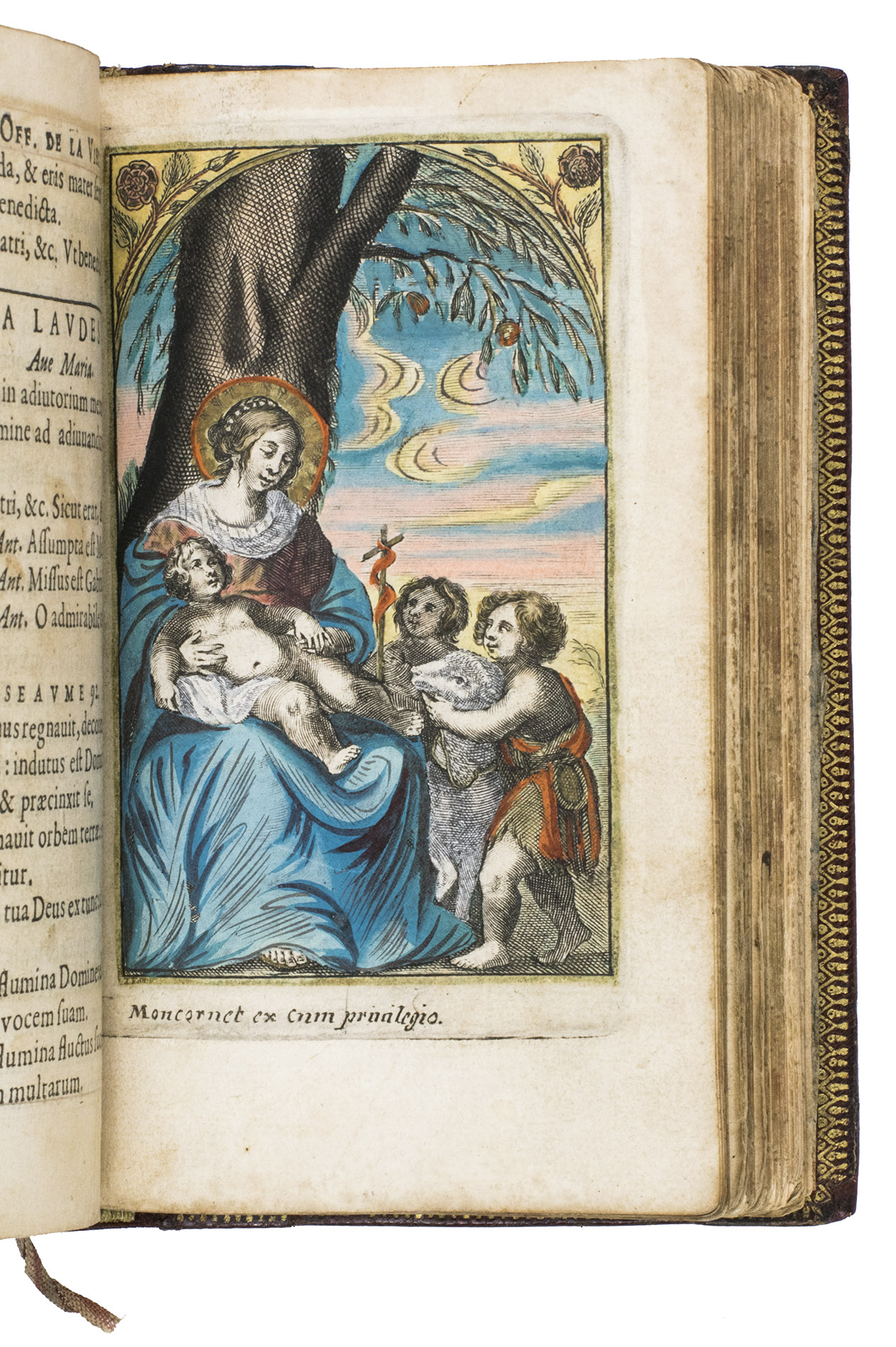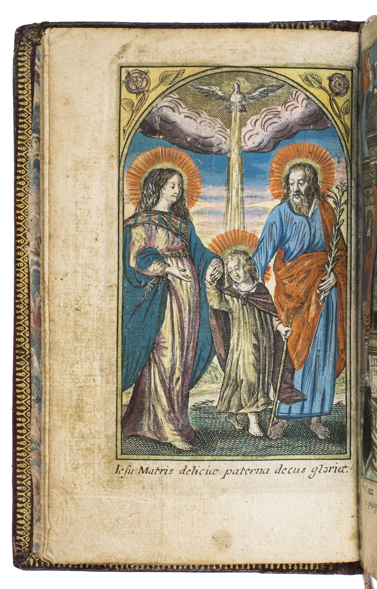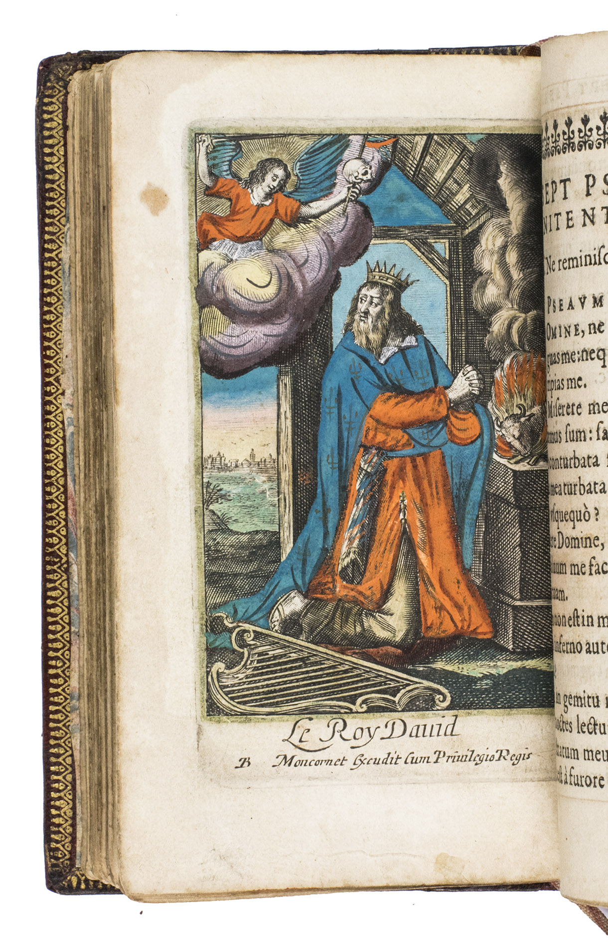 Paris, Pierre Rocolet, 1649. 2 parts in 1 volume. 12mo. With an engraved title, 9 full-page engraved plates, all hand-coloured and heightened with gold, 5 woodcut headpieces, and 5 decorated woodcut initials. Every page has been outlined in red, and some of the chapter headings have been traced with gold. Contemporary elaborately gold-tooled red morocco fanfare binding, with a central quatrefoil inlay of brown morocco on both boards, surrounded by geometric and pointillé designs, gold-tooled board edges and turn-ins, gilt pointillé edges, marbled endpapers. [1], [1 blank], [42], 172; 288 pp.