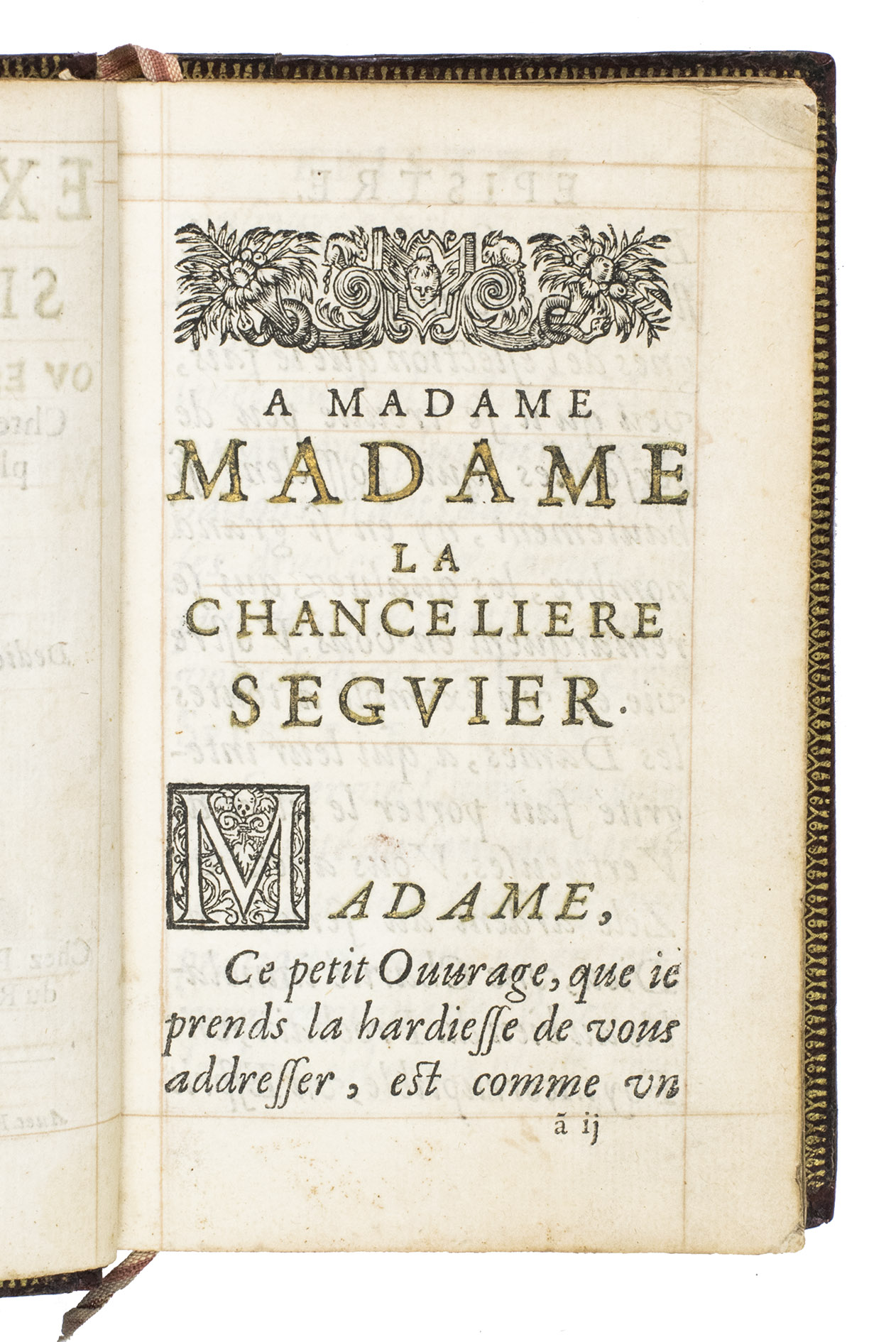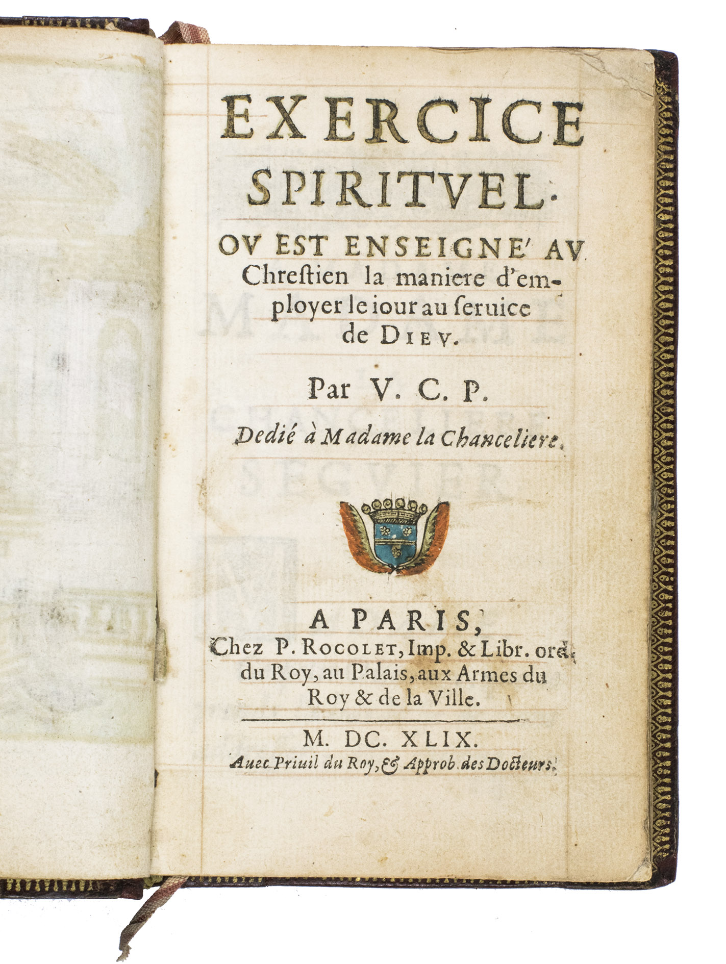 Unrecorded edition of a rare devotional work, in a fine Parisian fanfare binding. The binding is most likely produced in the workshop of the publisher, Pierre Rocolet (fl. 1638-1662), that worked for famous collectors as Marie de' Medici, Mazarin, and Chancellor Pierre Séguier. The present binding was likely made for a rich client as well. The work itself is exceptionally rare, as it has not been mentioned in any of the relevant reference works. We have also not been able to find any other copies of the present edition in either institutions or sales records.