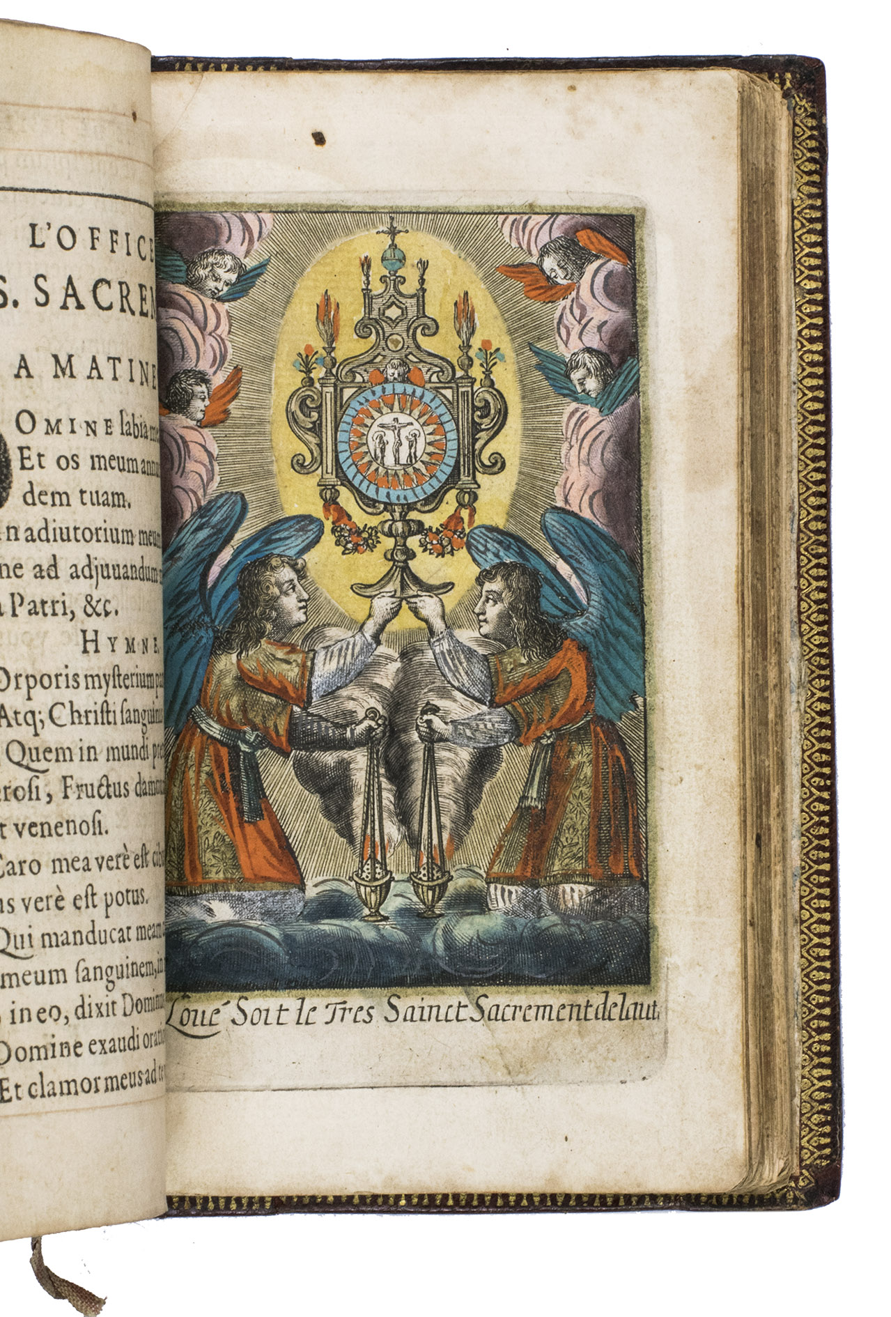 With a small devotional print inserted in the front of the work. The work has been rebacked, with the original spine laid down, the boards have been somewhat rubbed, especially around the edges. The leaves are slightly soiled, especially the title page, the upper outer corner of the title page has been torn off, not affecting the engraving, the gilt decoration on the edges, especially the fore edge, has been partly rubbed off. Otherwise in good condition. Not in Adams; STC French; USTC; cf. Esmerian II, pp. 47-53 (bookbinder); Hobson, Les reliures à la fanfare.