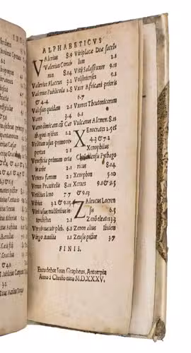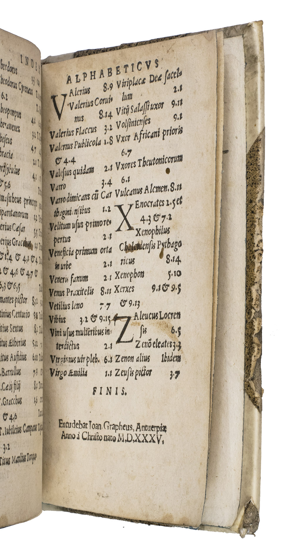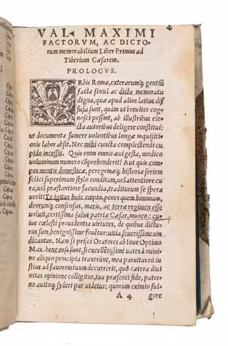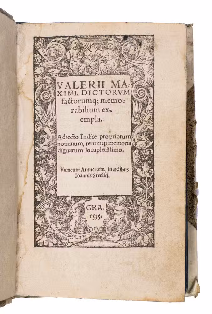Early Antwerp edition of Dictorum factorumque memorabilium exempla, it transmits one of the most influential moral and historical collections of Imperial Rome. The work was compiled by Valerius Maximus, a Latin author active in the early decades of the first century CE, and dedicated in 31 CE to the emperor Tiberius.