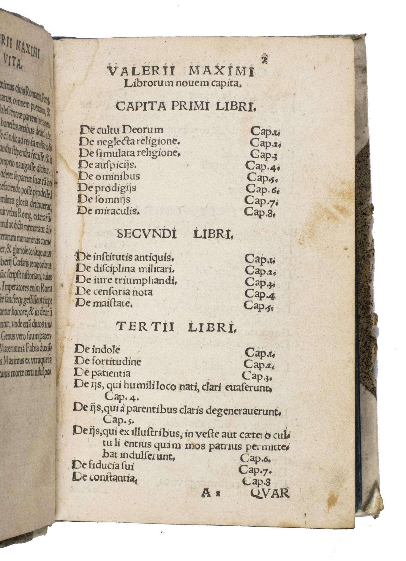In the present work the text is set in ten books. The first nine contain the authentic work of Valerius Maximus. The tenth book, however, is explicitly identified as an epitome, compiled by Gaius Titius Probus.
