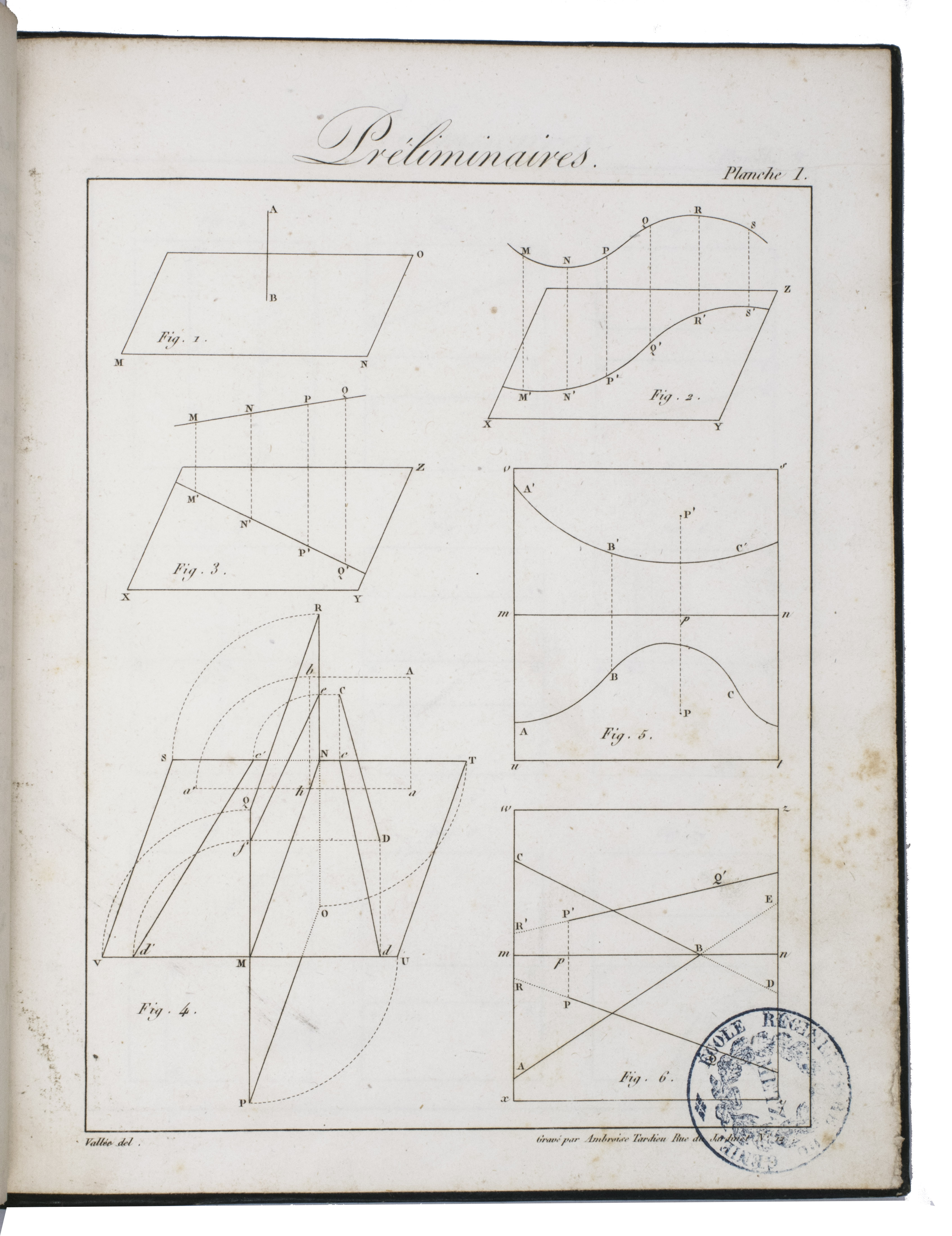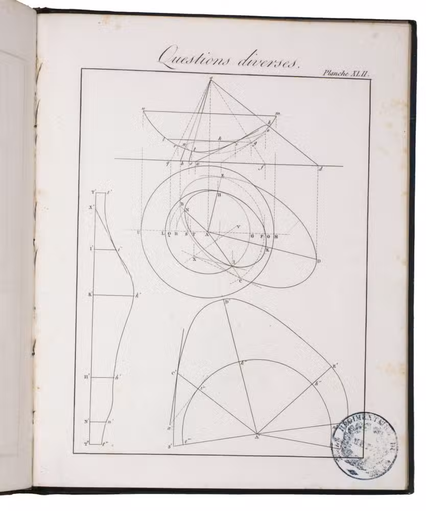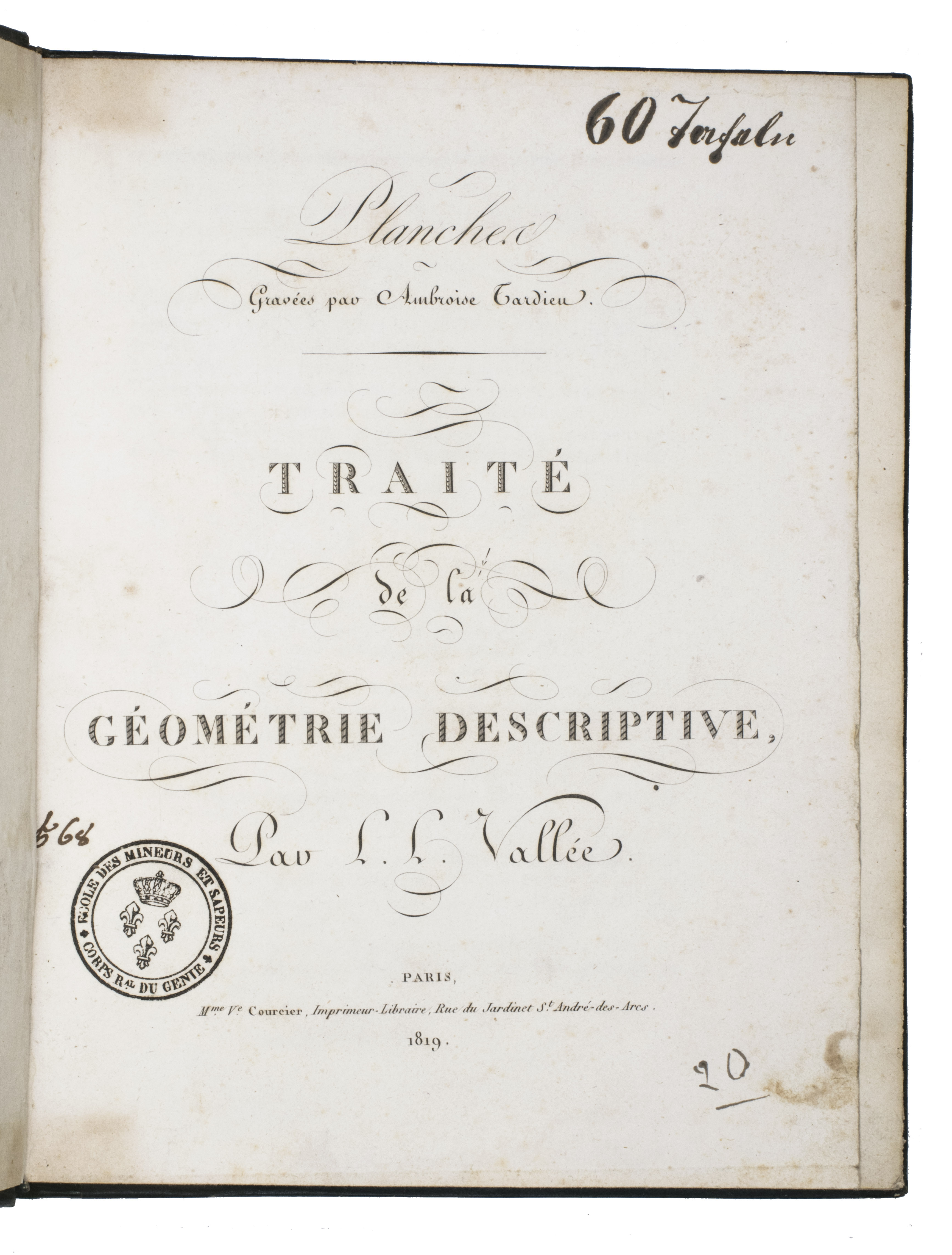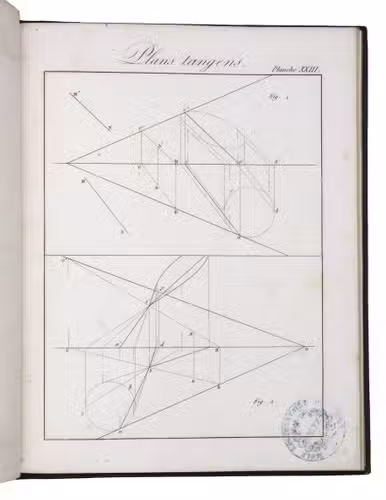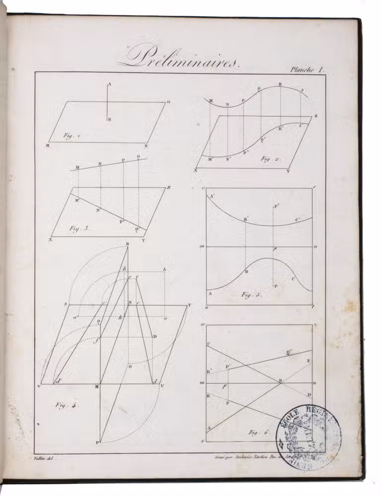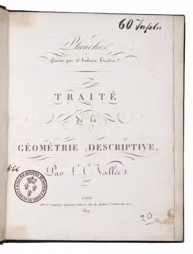 Louis Léger Vallée (1784-1864) was a student of Monge at the École Polytechnique and engineer of the Ponts et Chaussées at Paris. He continued Monge's teachings and presented the present work to the Académie Royale des Sciences. His work, and especially his set of plates was approved by the Royal Academy, and the report, signed among others by Arago, the accepted authority on the subject within the Academy, is added to the preliminaries. It explains that "experience had led early on to the methods by which architects, stonemasons, and carpenters construct their drawings; but these methods have only recently been codified into a body of doctrine and freed from all empiricism. This is thanks to Mr. Monge." Monge's classes were nevertheless unsatisfactory for artists unfamiliar with mathematical methods, and the present work seeks to remedy this deficiency, notably through the use of perfectly drawn plates offering "in the smallest detail, all the constructions that must be executed to arrive at the final solution."