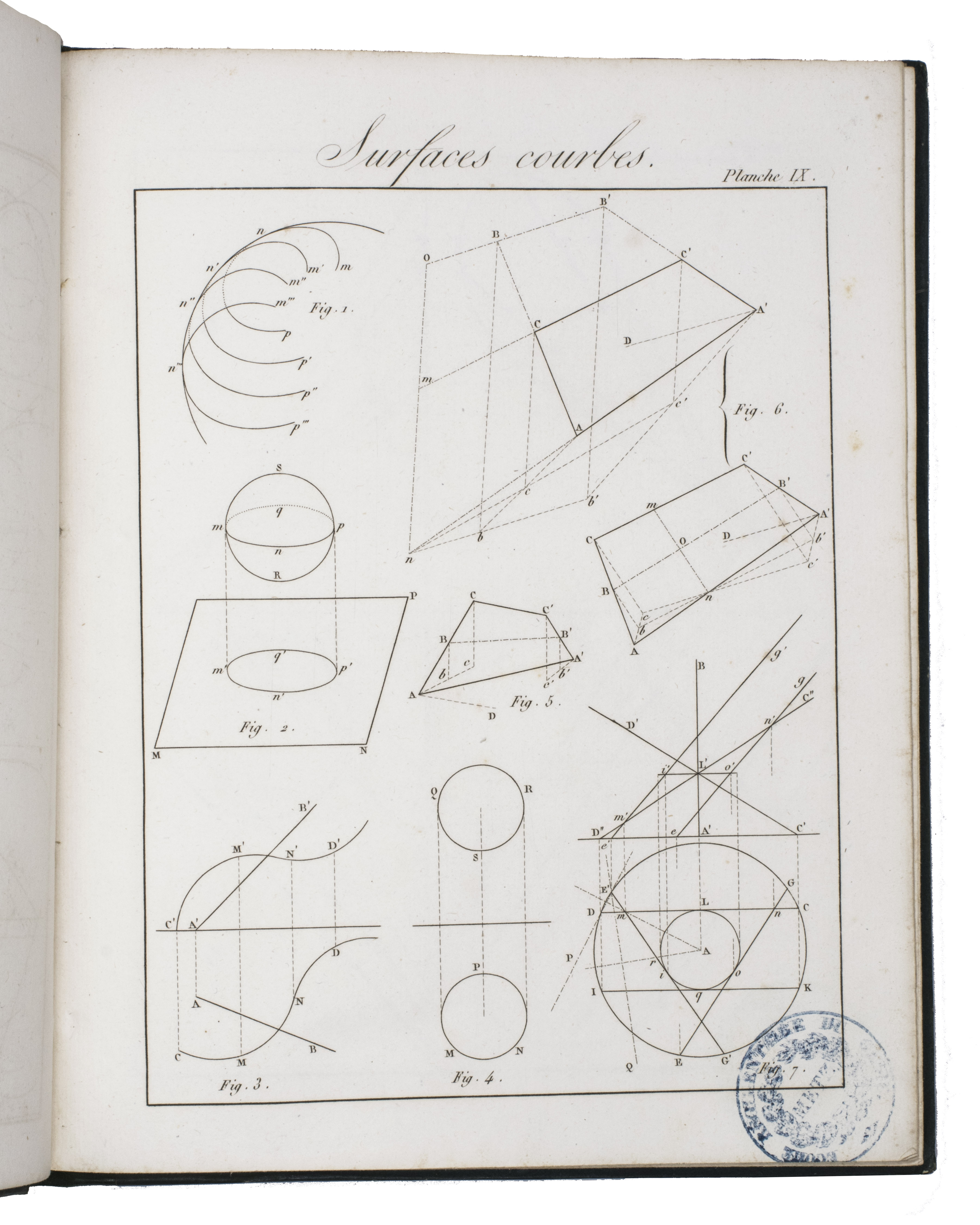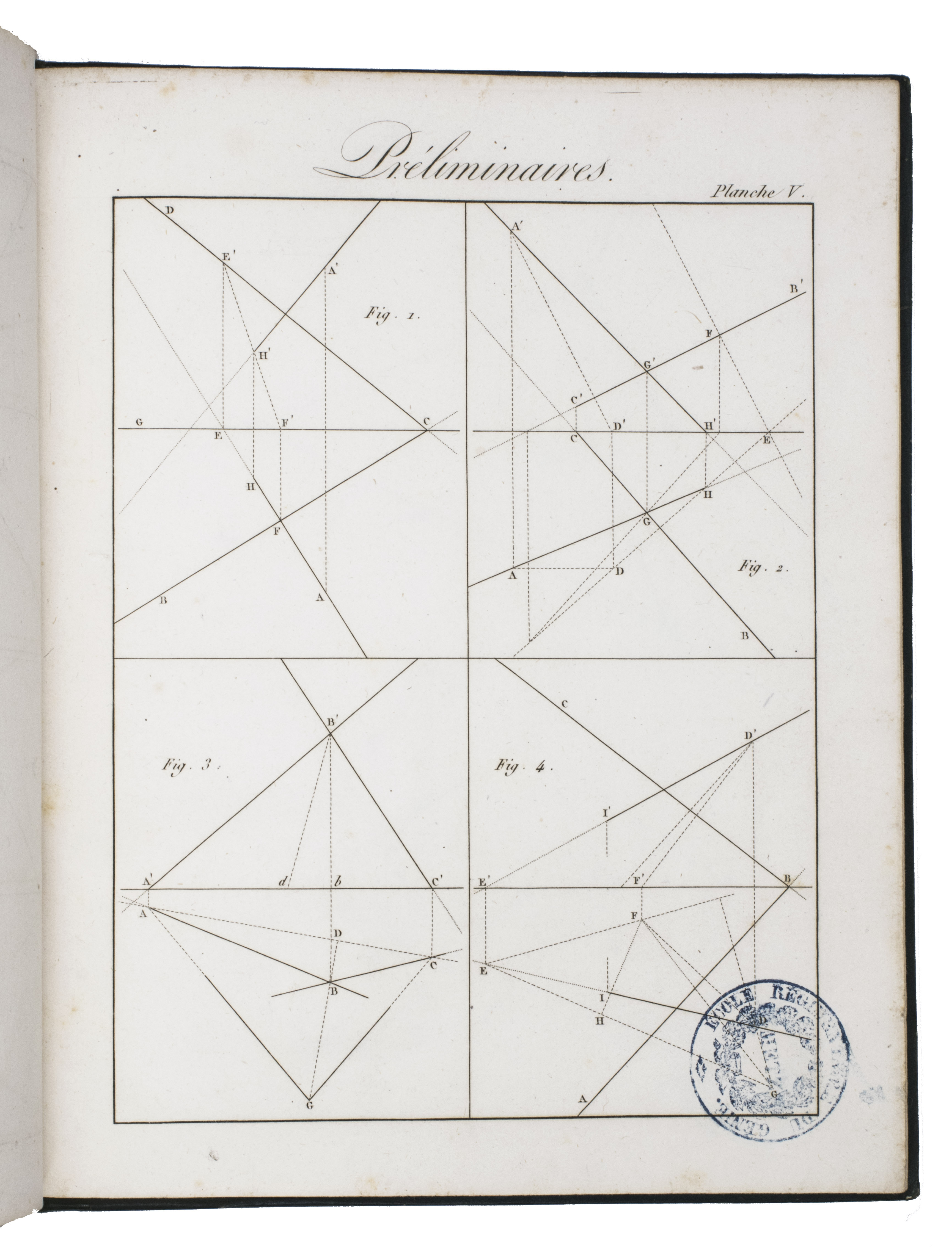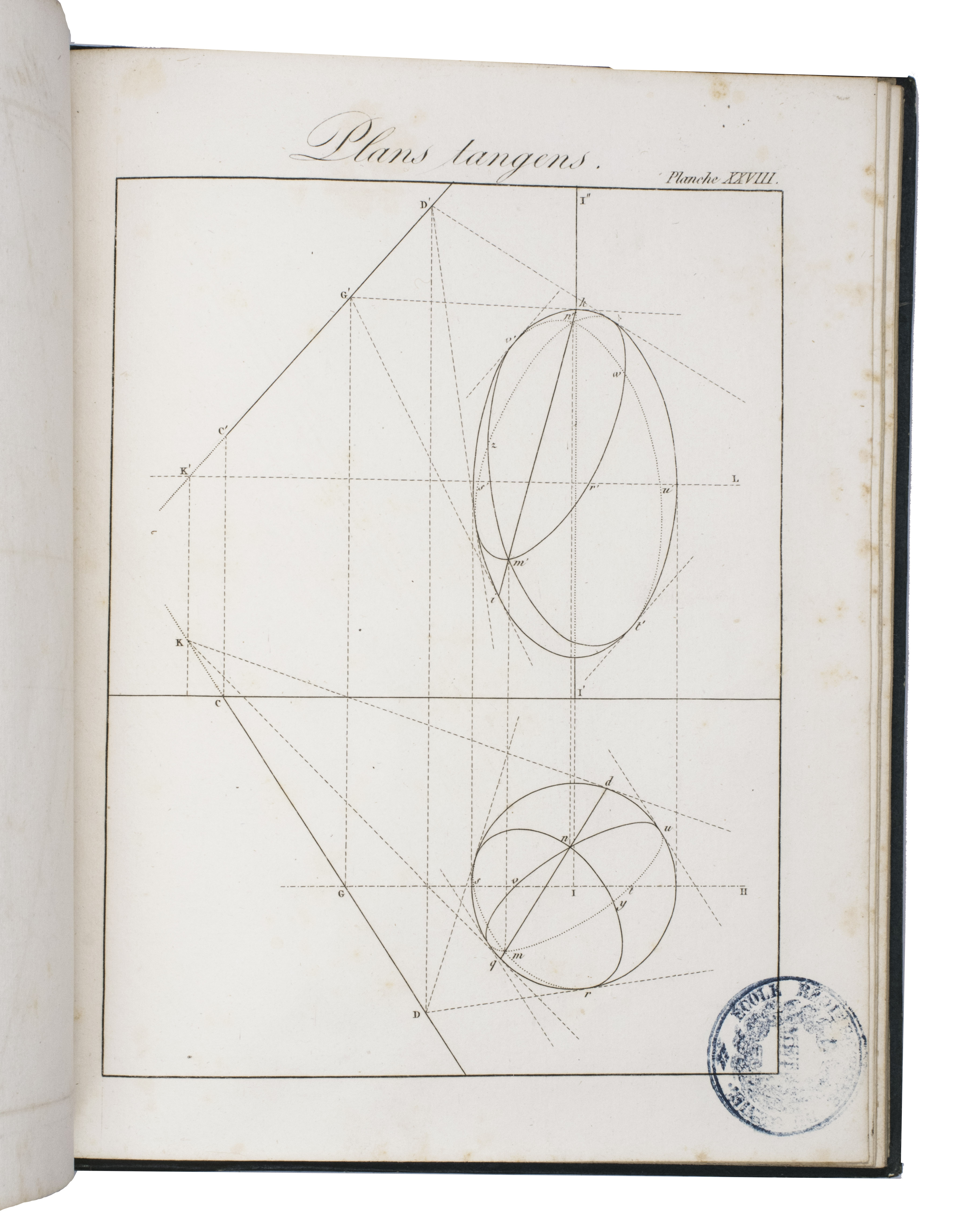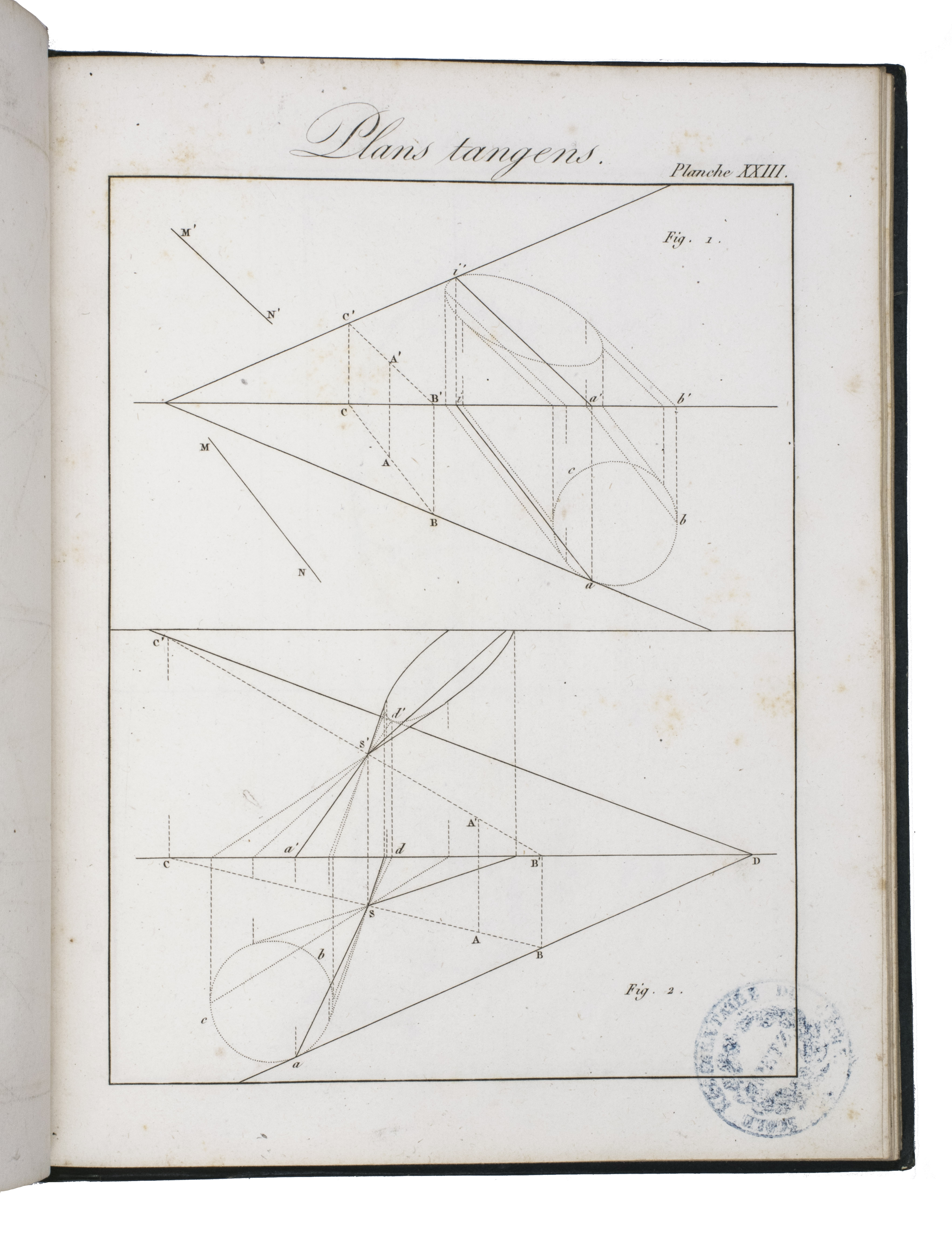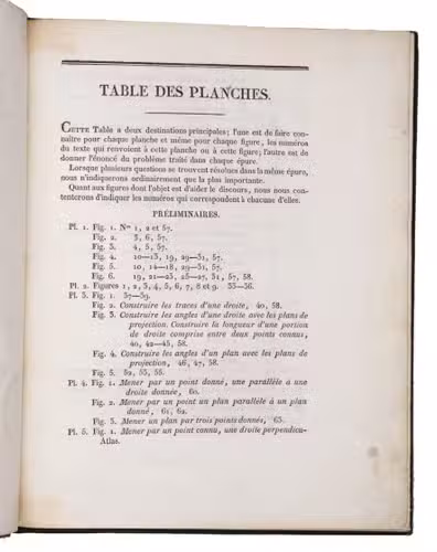 Rare first edition of a treatise on descriptive geometry, perspective, and the mechanism of vision, complete with the atlas volume. The work is dedictated to Gaspar Monge (1746-1818), the inventor of descriptive geometry, and is the first to adapt his ideas for artists. It explains how to use descriptive geometry to draw perspective, projections, and shadows, without the help of mathematical analysis. The concepts are illustrated in the atlas volume on 60 engraved plates.