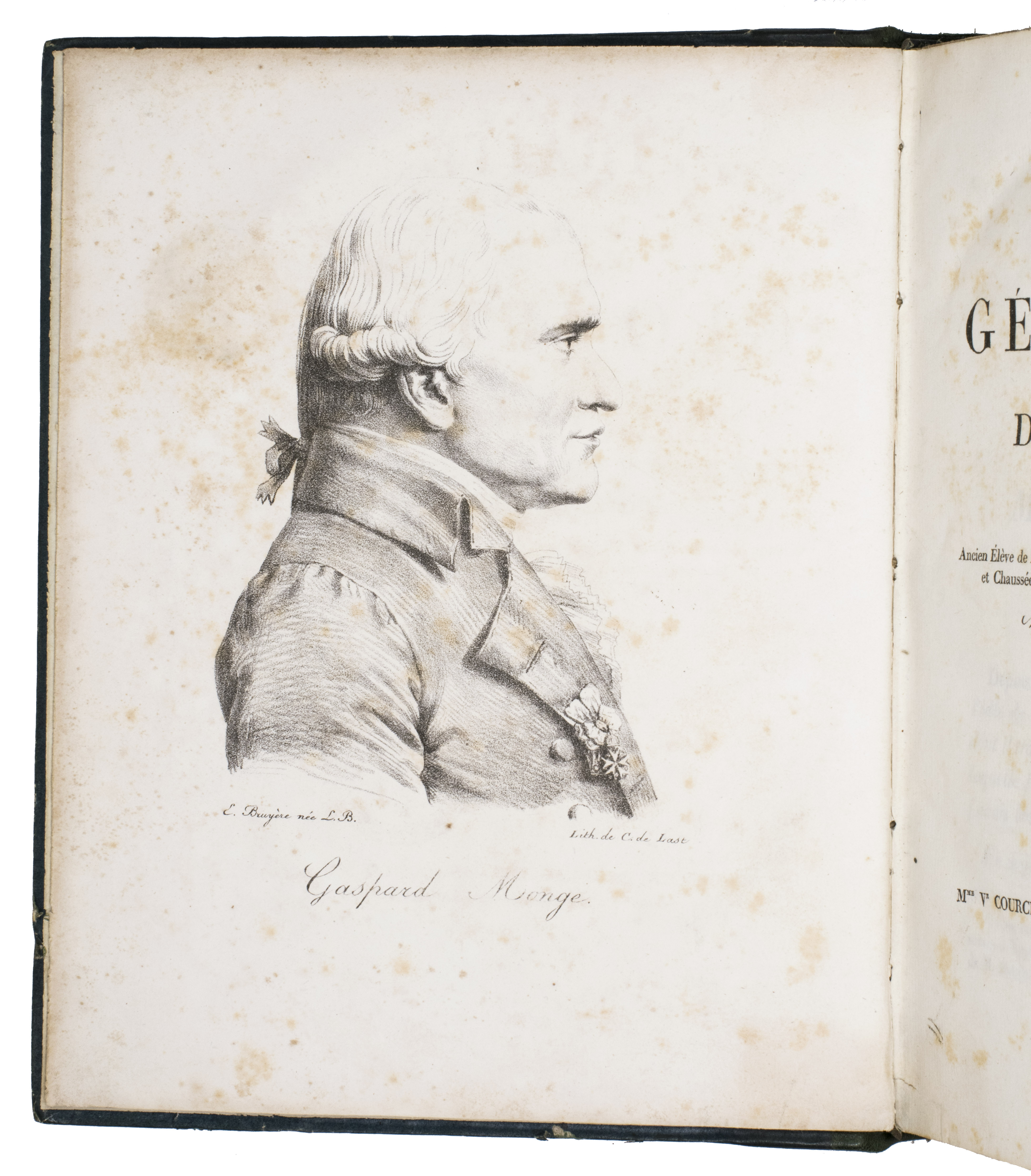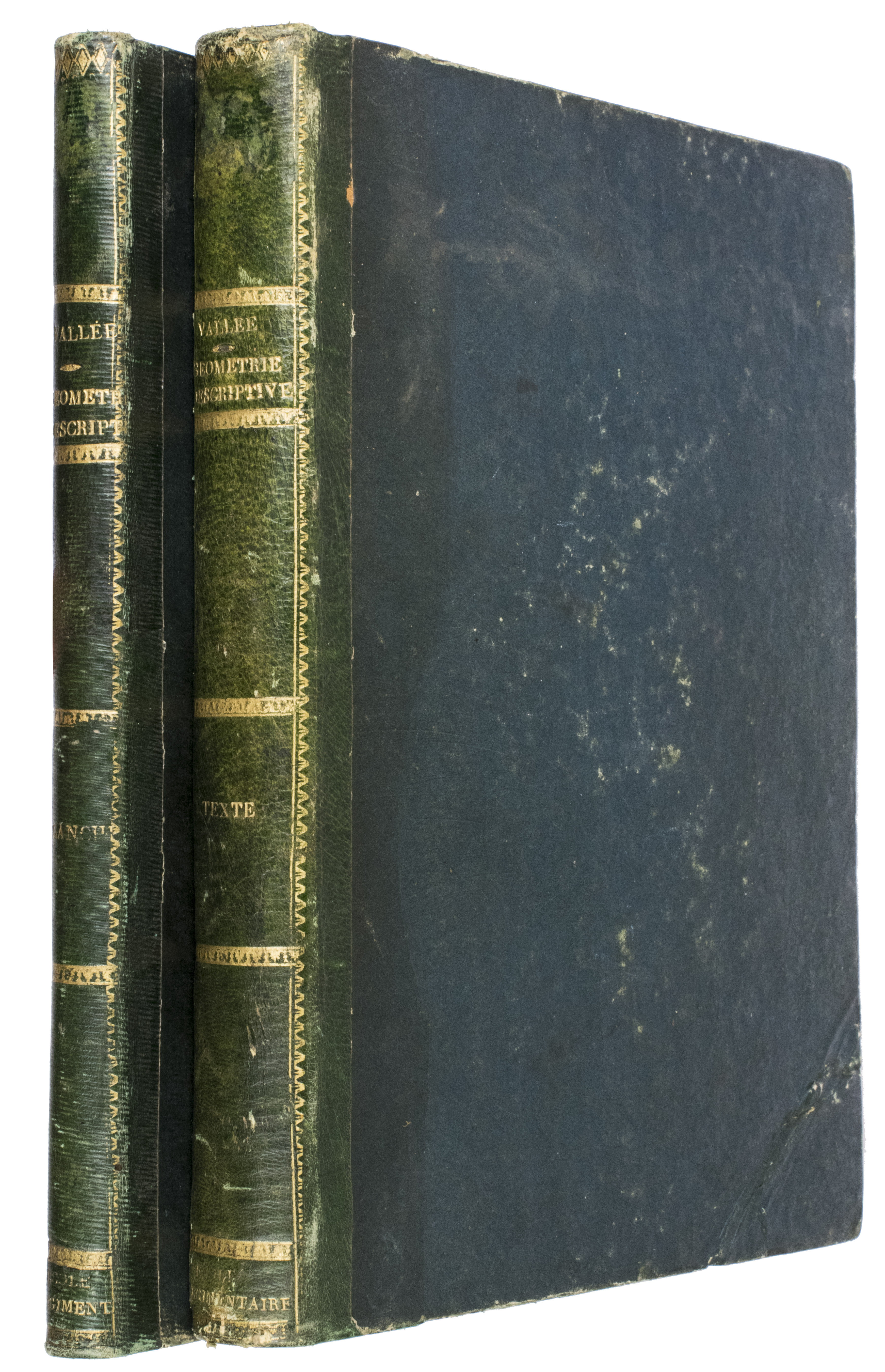 Paris, Mme Ve Courcier, 1819. 2 volumes (a text and an atlas volume). Large 4to. With a lithographed portrait of Gaspard Monge in the text volume, an engraved title to the atlas volume, and 60 engraved plates (3 double-page, 57 full-page) with illustrations of perspectival projections by Ambroise Tardieu after designs by the author. Contemporary gold-tooled quarter green morocco. XX, 355, [1 blank]; 8 pp. + 60 engraved plates.
