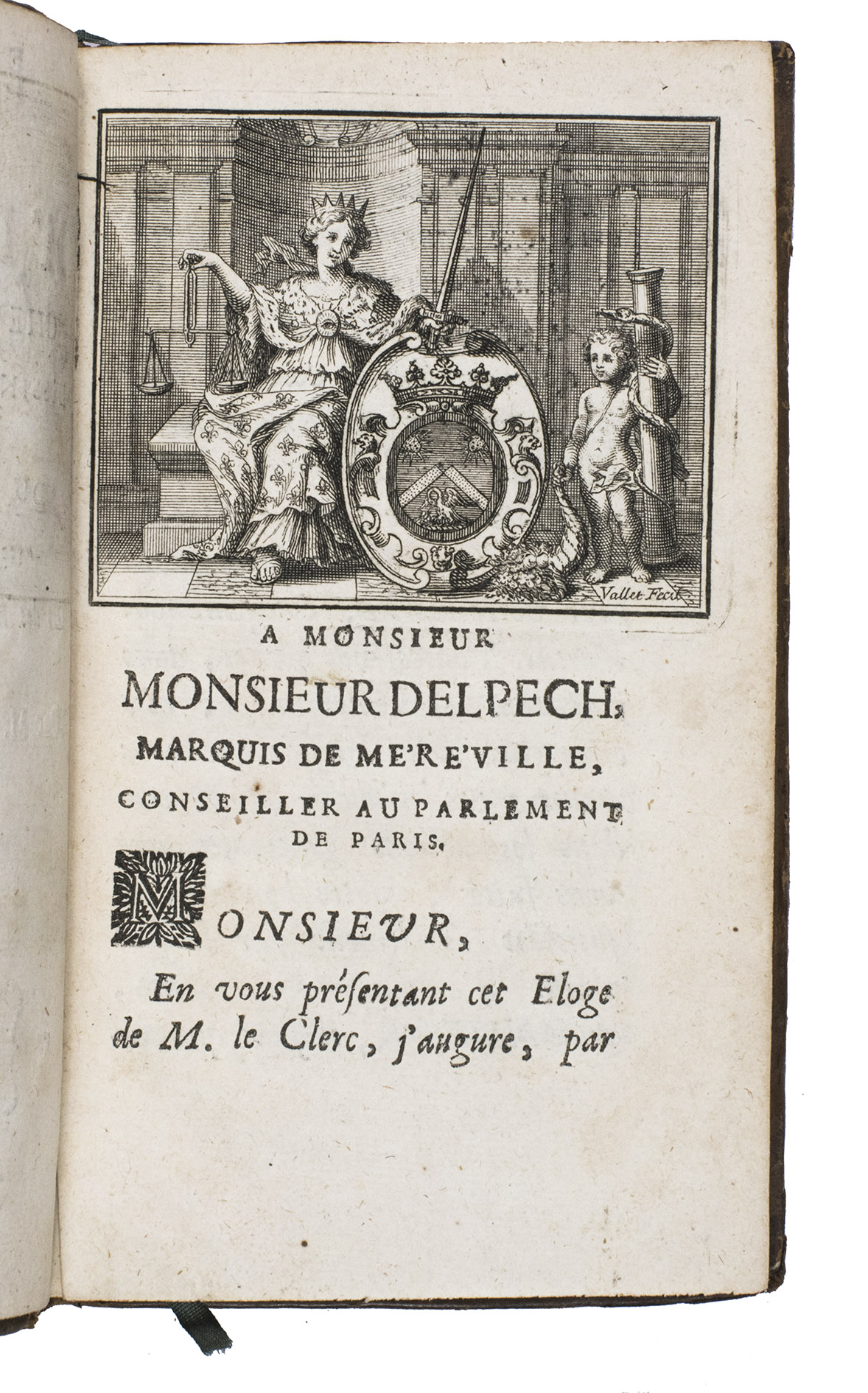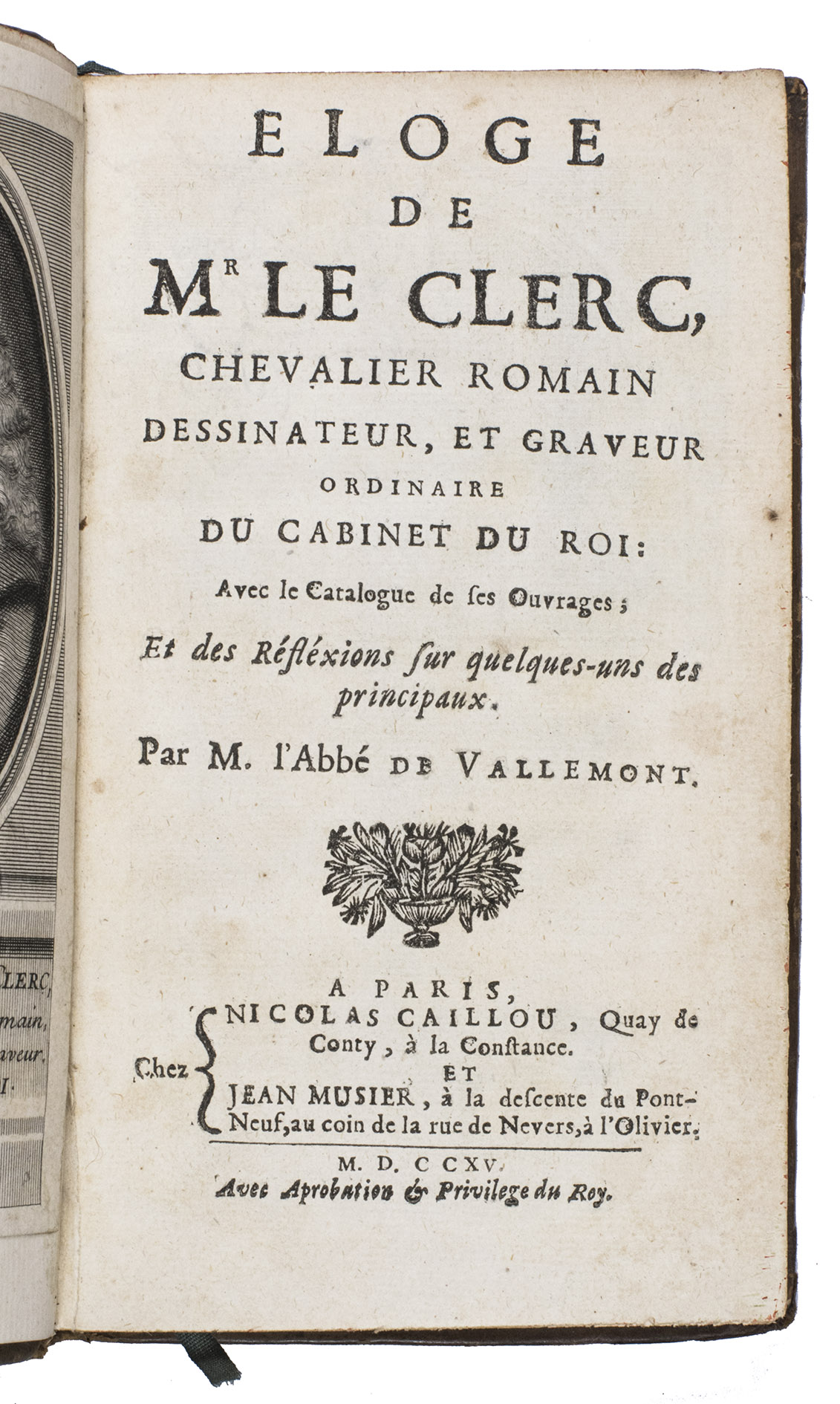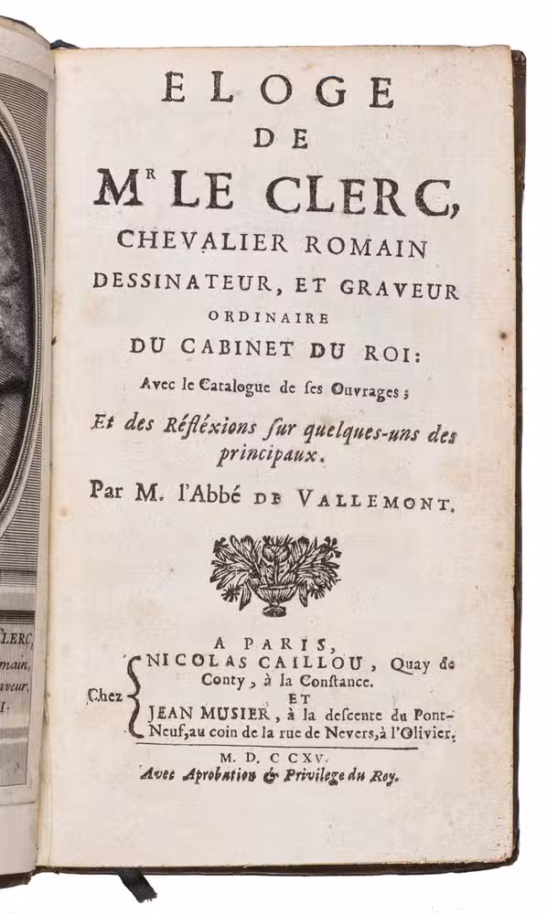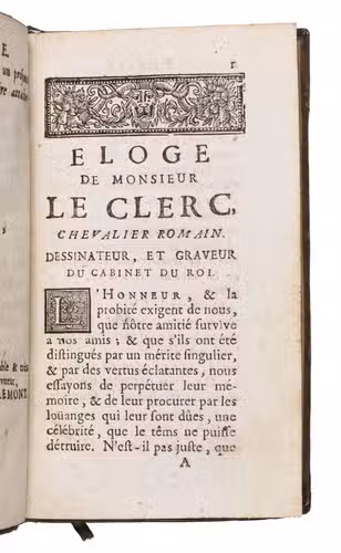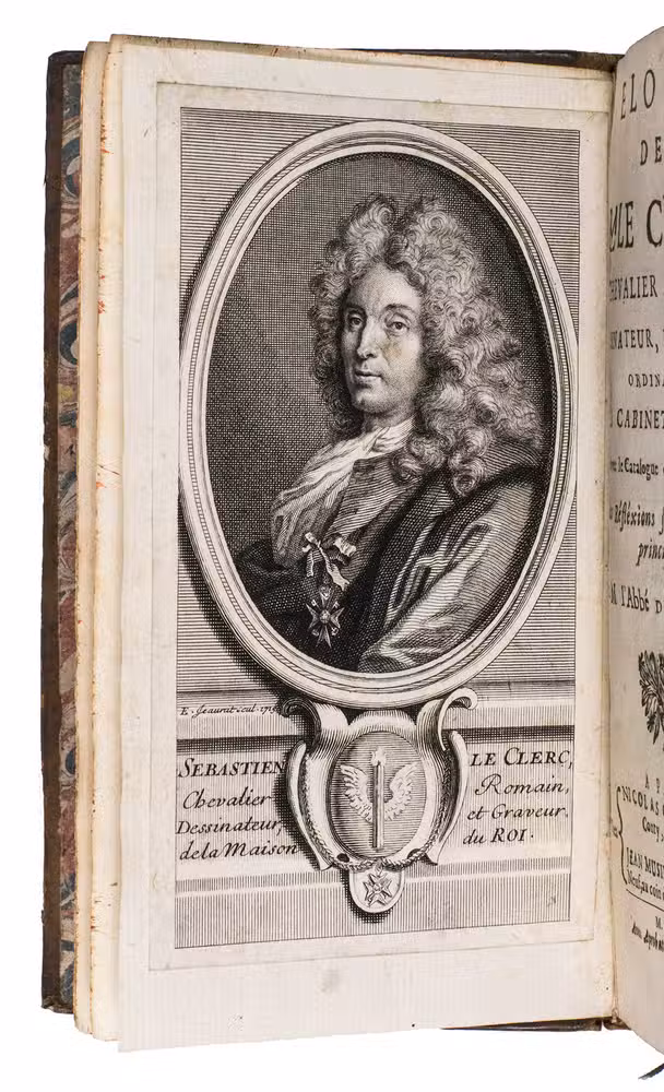 First edition of the first biography and catalogue of the work of the Lorraine artist Sebastien Le Clerc (1637-1714). Le Clerc was a draftsman, engraver and military engineer, born in Metz. He published numerous books on geometry and perspective, as well as on architecture. He had a great eye for composition, and is still considered one of France's best engravers because of it. He initially worked as an engineer, but his artistic talents were soon recognised by Charles le Brun (1619-1690), a painter who worked directly for King Louis XIV and painted several murals in Versailles. Le Brun advised him to abandon his engineering work and devote himself exclusively to engraving and drawing, which he did very successfully. He was sought after by publishers and his engravings were already collected in his own time. The present work was published shortly after his death. The portrait of Le Clerc, especially made for this work, is often lacking, but has here been added as a frontispiece at a later date.