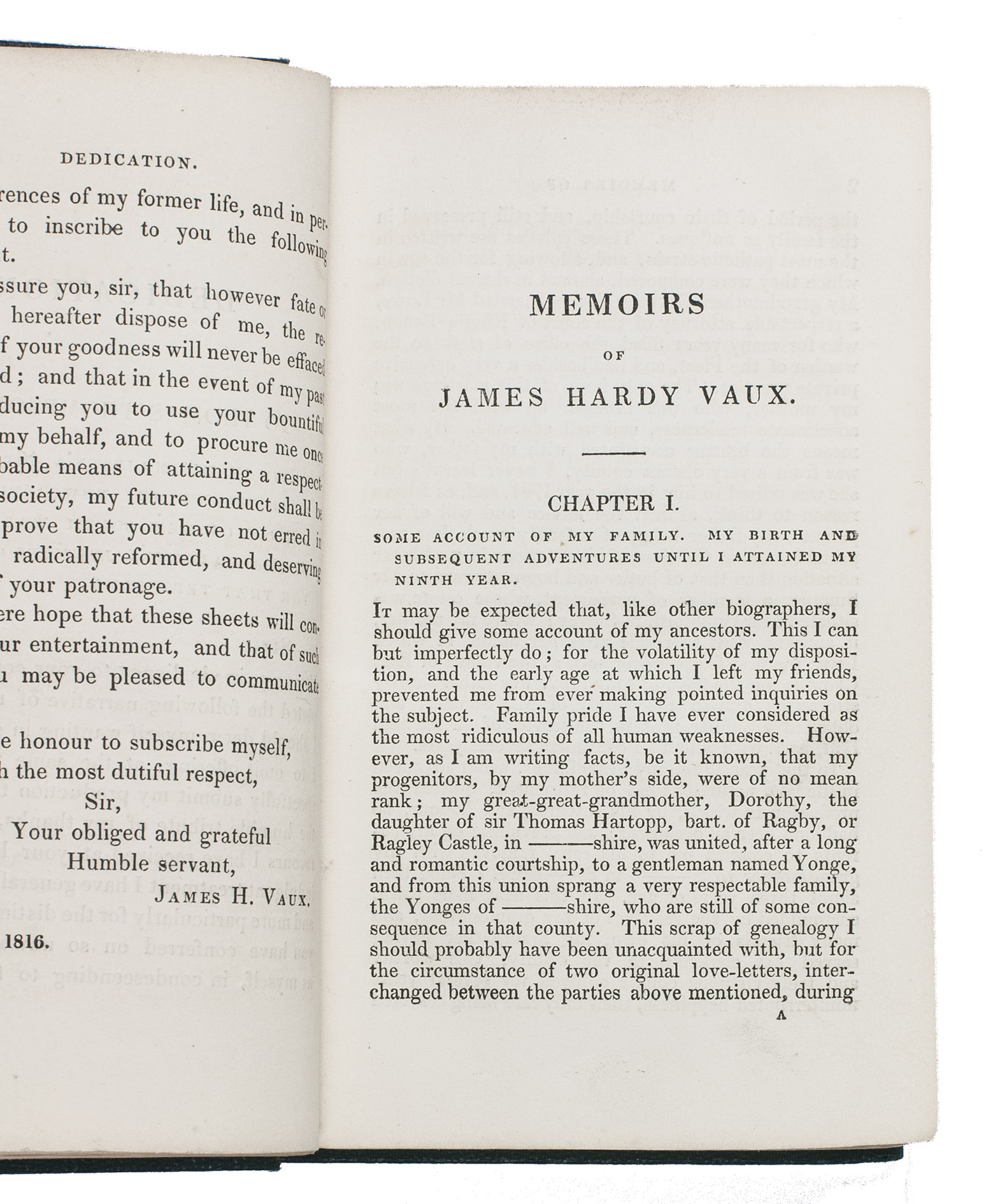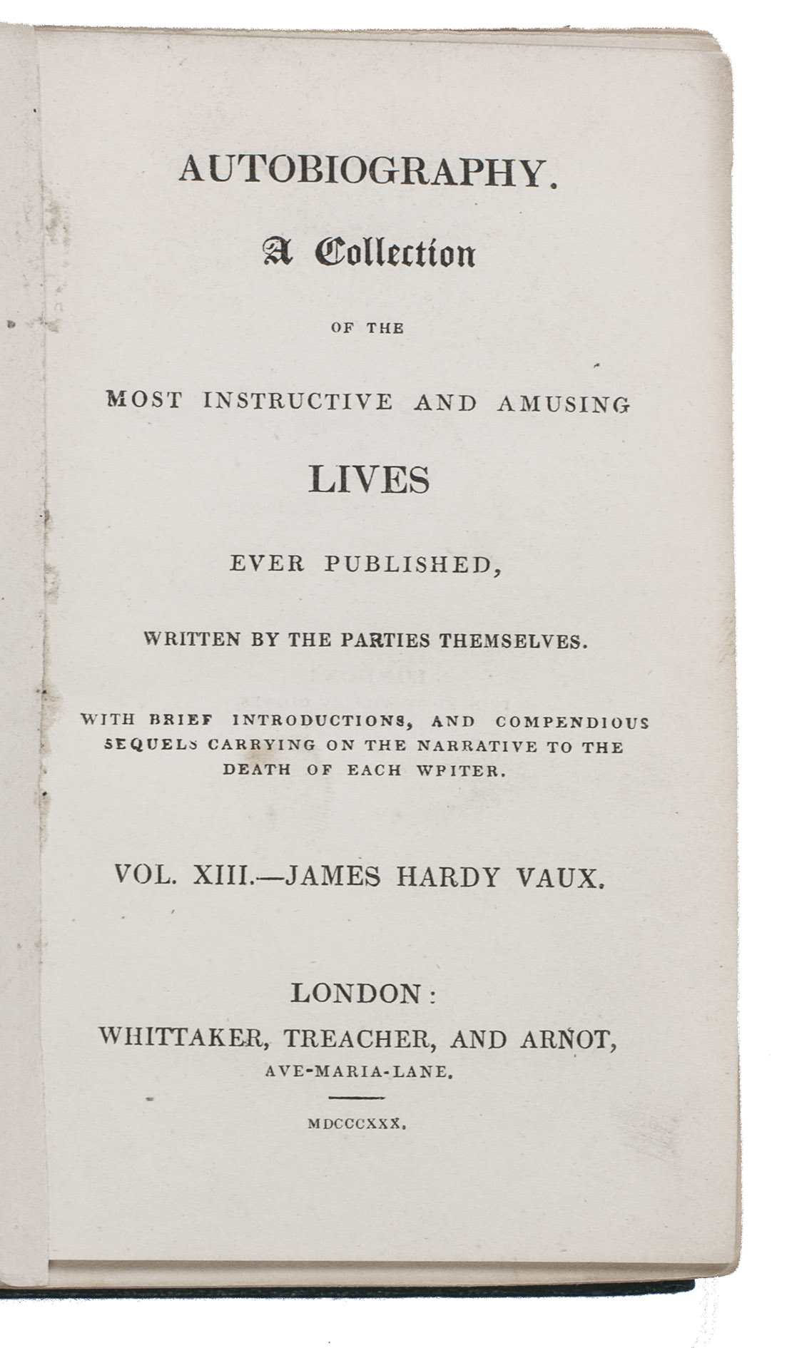 "Fourth" edition, as part of a series of notable autobiographies, of the first full-length autobiography written in Australia. In his memoirs, James Hardy Vaux (1782-after 1841) describes the first 32 years of his life, during which he was twice transported to Australia for petty theft. A professional thief by the age of 18 he was sentenced to transportation for seven years for stealing a handkerchief and worked as a clerk at the Hawkesbury, in Sydney and in Parramatta from 1801 to 1807, after he which he returned to London. Two years later he was sentenced to transportation for life for stealing from a jeweller's shop. Vaux had already written a slag dictionary for use of the magistrates and was encouraged to write his memoirs, by which he hoped to gain the patronage of the commandant of the settlement of Newcastle. The manuscript came into the hands of Barron Field, who arranged to have it published in London in 1819. A second edition appeared in 1827, which was reprinted in 1829 and 1830. By that time Vaux had been pardoned, but once again sentenced to transportation for seven years for forging banknotes. In 1837 he returned to Sydney but in 1839 was sentenced to two years imprisonment for assaulting a young girl. After his release in 1841, Vaux disappeared.