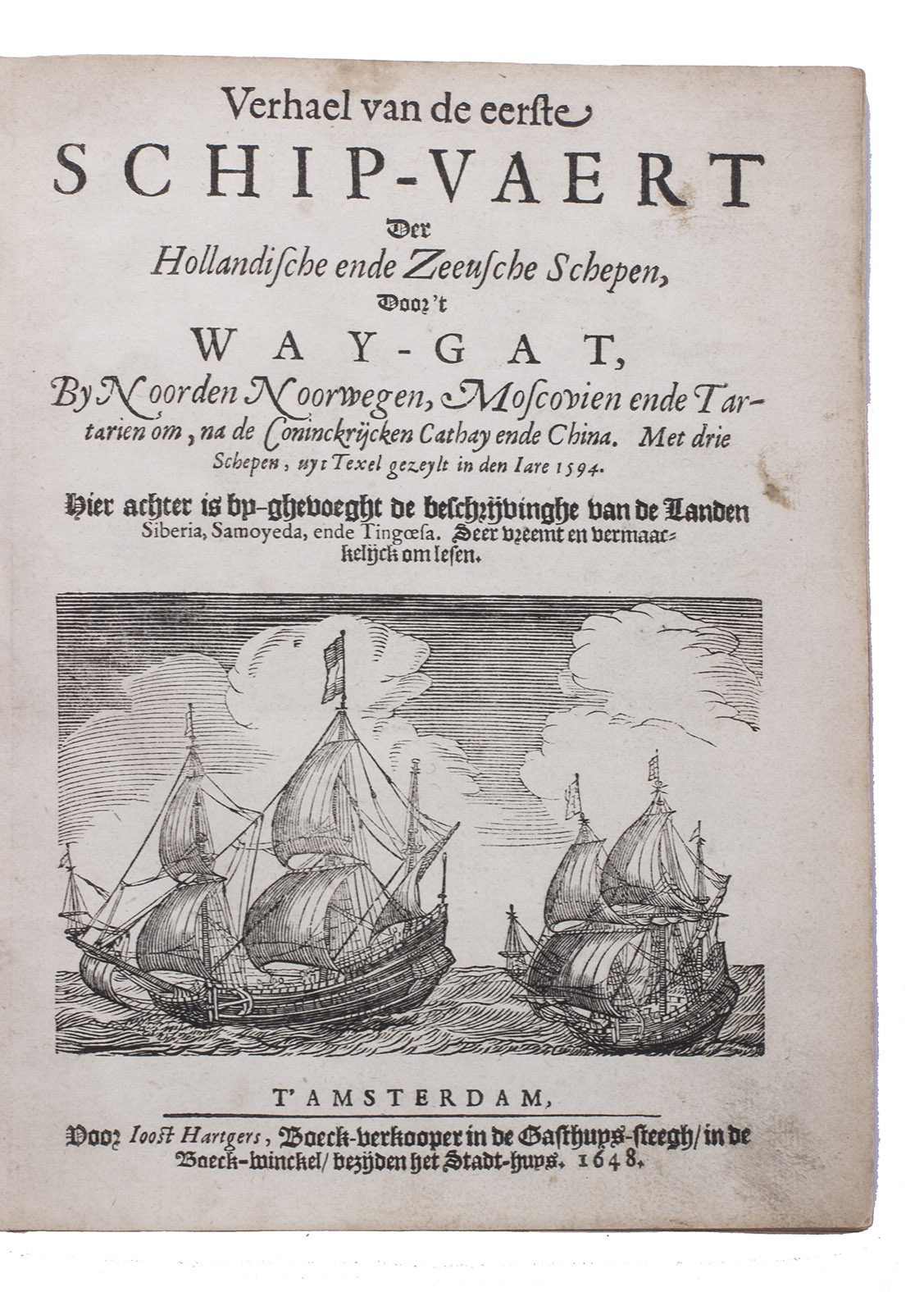 Verhael van de eerste schip-vaert der Hollandische ende Zeeusche schepen door 't Way-gat, by Noorden Noorwegen, Moscovien ende Tartarien, na de coninckrijcken Cathay ende China. Met drie schepen, uyt Texel gezeylt in den jare 1594. Hier achter is by-ghevoeght de beschrijvinghe van de landen Siberien, Samoyeda, ende Tingoesa. Seer vreemt en vermaackelijck om lesen.