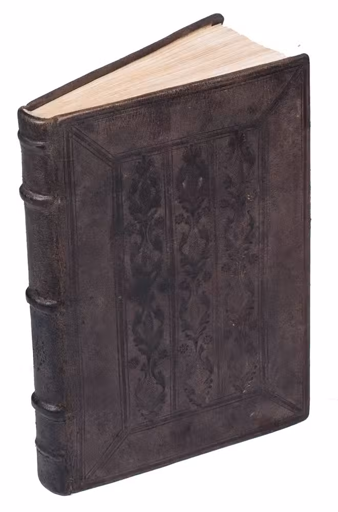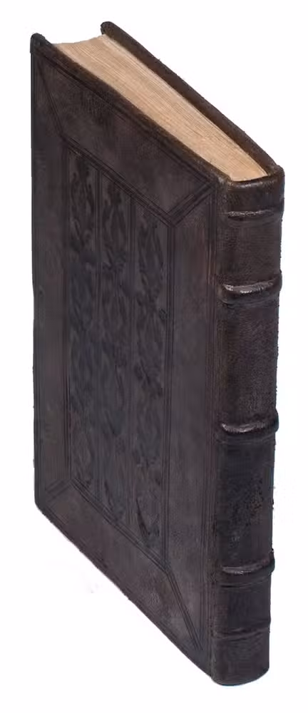 (Colophon: Paris, "apud Gourmontios" [= the brothers Robert, Gilles and Jean de Gourmont], 1508). Small 4to (19 x 13 cm). With numerous printed so-called Lombardic initials, but also with 2 spaces (with guide letters) left for manuscript initials (not filled in). Set in a roman type with the beginning of the title and one heading in a large rotunda gothic type with decorated capitals. Blind-tooled calf (19th century? in a "Medieval" style). CXXVIII, [6] ll.