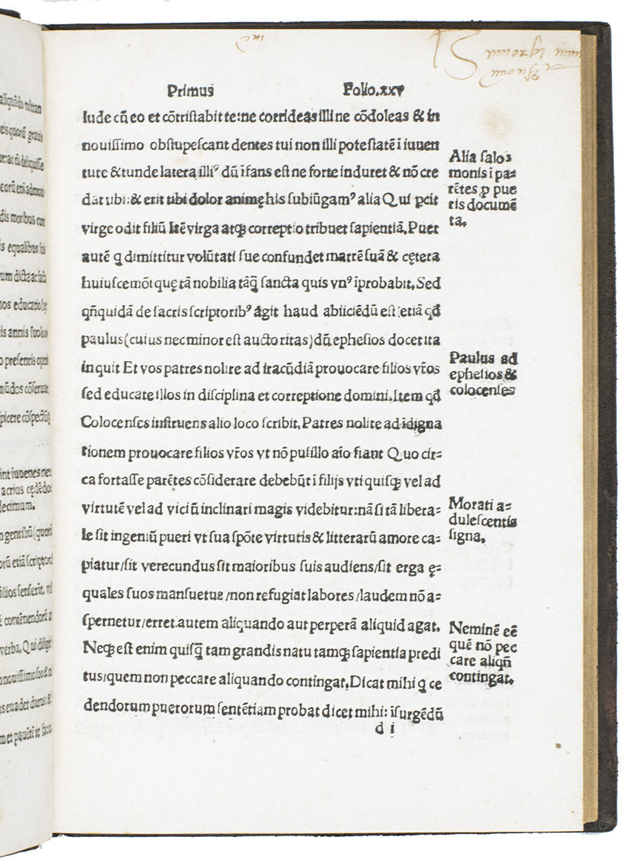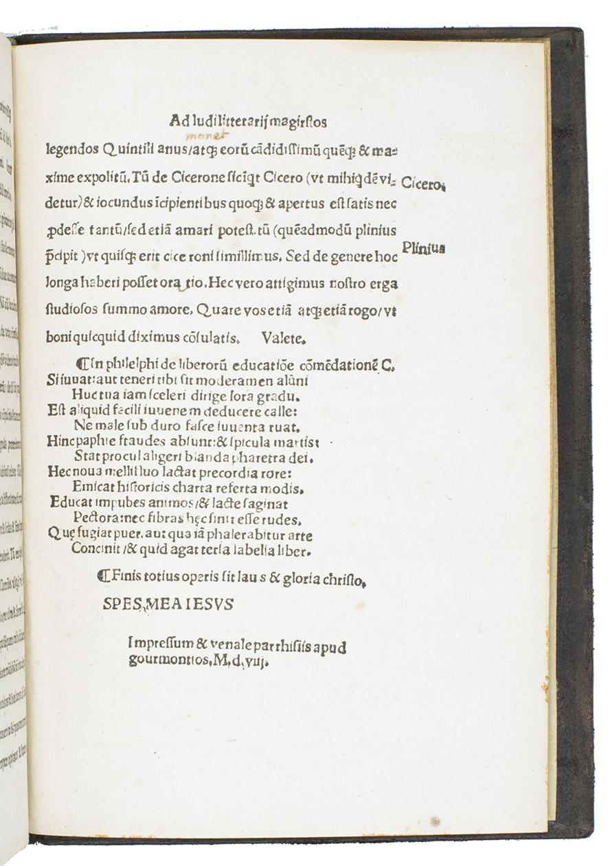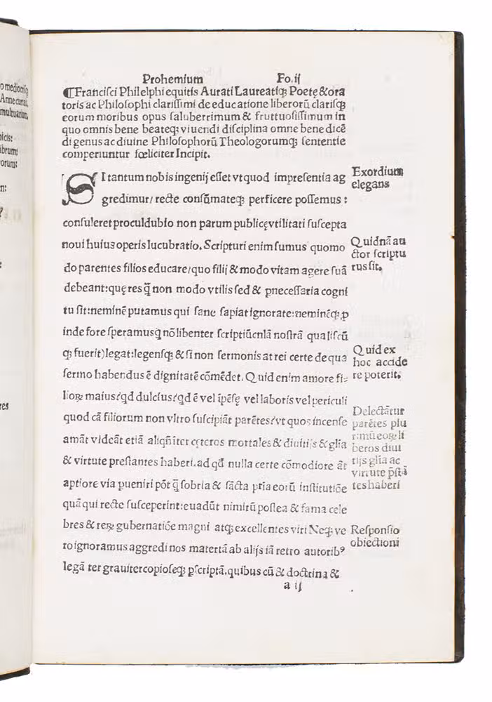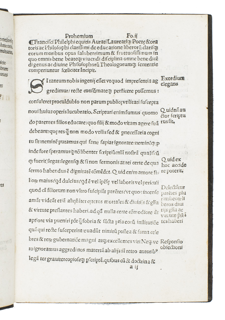 Rare fourth edition, in the original Latin (the first dated edition published in France), of an important and influential pedagogical work by Maffeo Vegio (1406/07-1458), who is regarded by many as the finest Latin poet of the fifteenth-century, here edited by Nicolas Dupuy (under the pseudonym Bonaspes) and (as in the second and third editions) incorrectly attributed to Francesco Filelfo. It is Vegio's most important and well-known treatise, discussing the education of children and their moral foundation, composed in six books, each with numerous numbered chapters. The first three books cover the duties of parents and teachers in education; the last three cover the duties of children to God, other people and themselves, as well as the several virtues, good manners, the use of time, etc. "The most Christian in spirit of all humanistic educational treatises" (Catholic encyclopedia), it approves the study of pagan literature only in conjunction with sacred learning, the study of the Scriptures and the Church Fathers, makes provision for the education of girls and considers the formation of a sound moral and Christian character to be the supreme end of education.