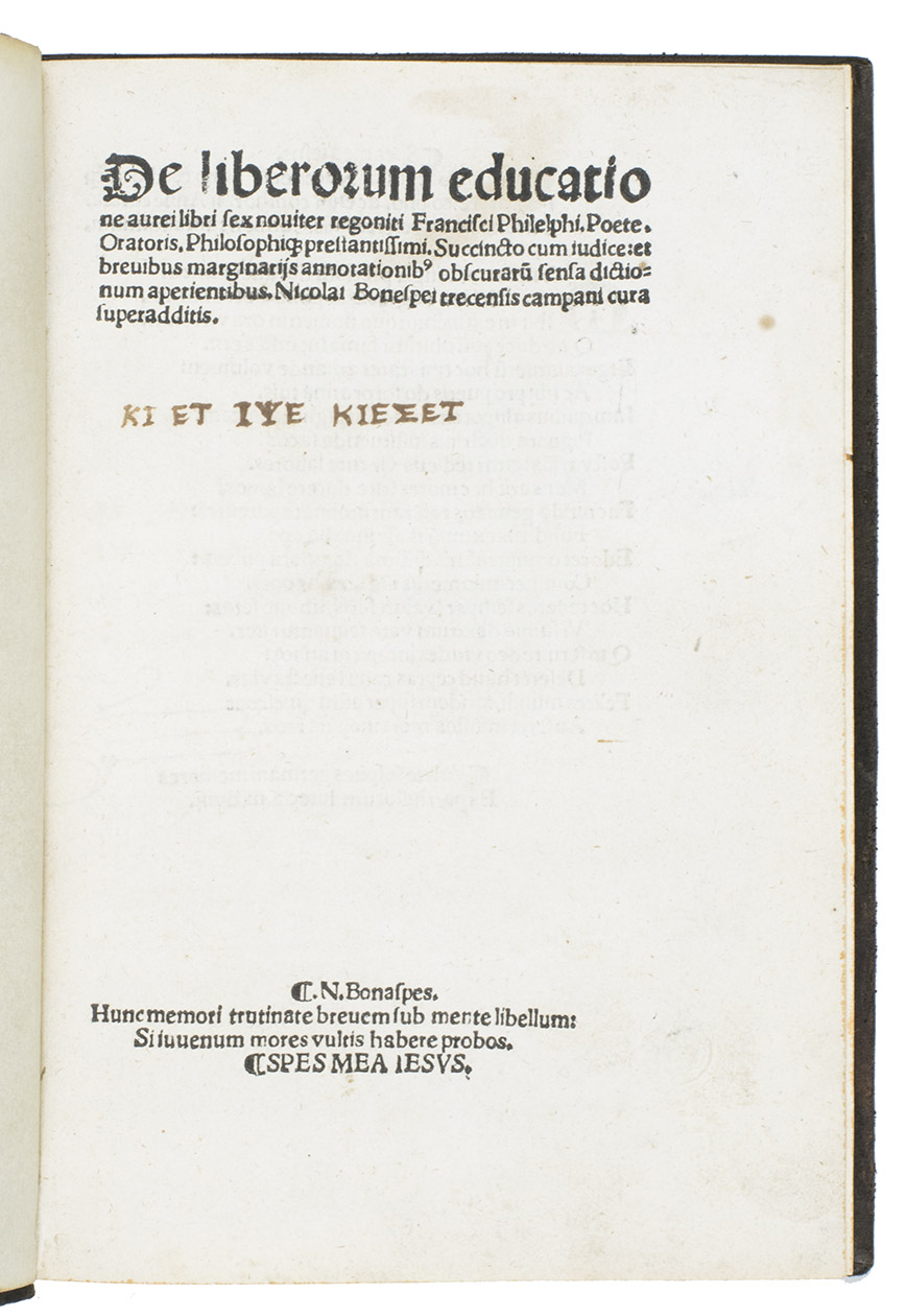 De liberorum educatione aurei libri sex noviter recogniti Francisci Philelphi. poete. Oratoris. philosophique prestantissimi. Succincto cum iudice [recté indice]: et brevibus marginariis annotationibus obscurarum sensa dictionum aperientibus. Nicolai Bonespei trecensis campani cura superadditis.