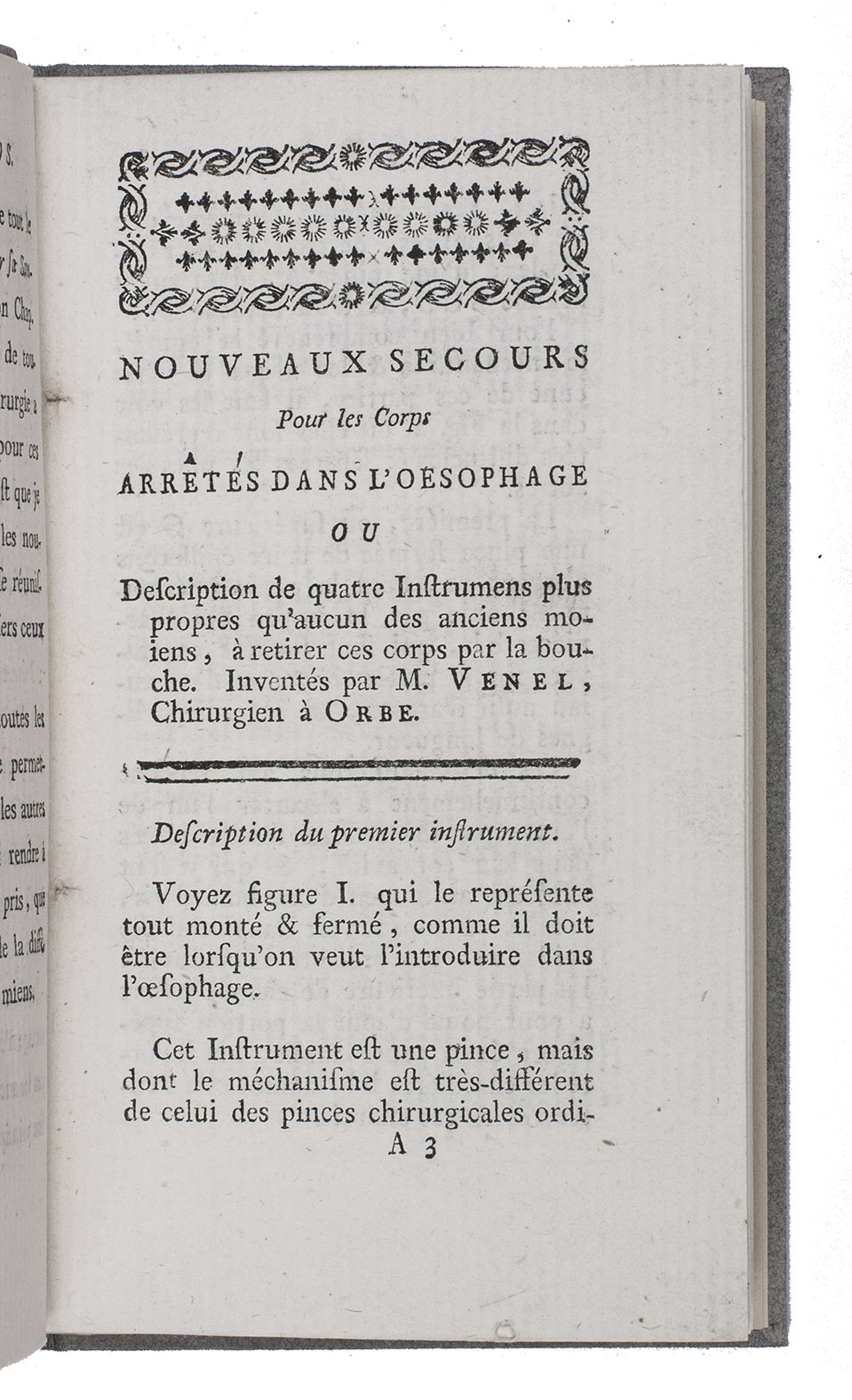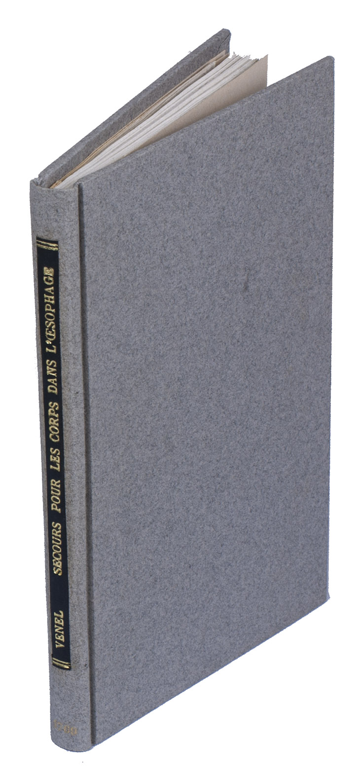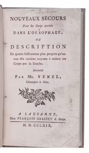 First edition of a medical treatise dealing with problems of the human oesophagus (gullet) by the Swiss doctor Jean-André Venel (1740-1791). He describes the use of some new instruments, designed by Venel himself, for removing (via the mouth) any odd pieces of food or other things stuck in a person's gullet. These new instruments are clearly shown on the engraved plate.