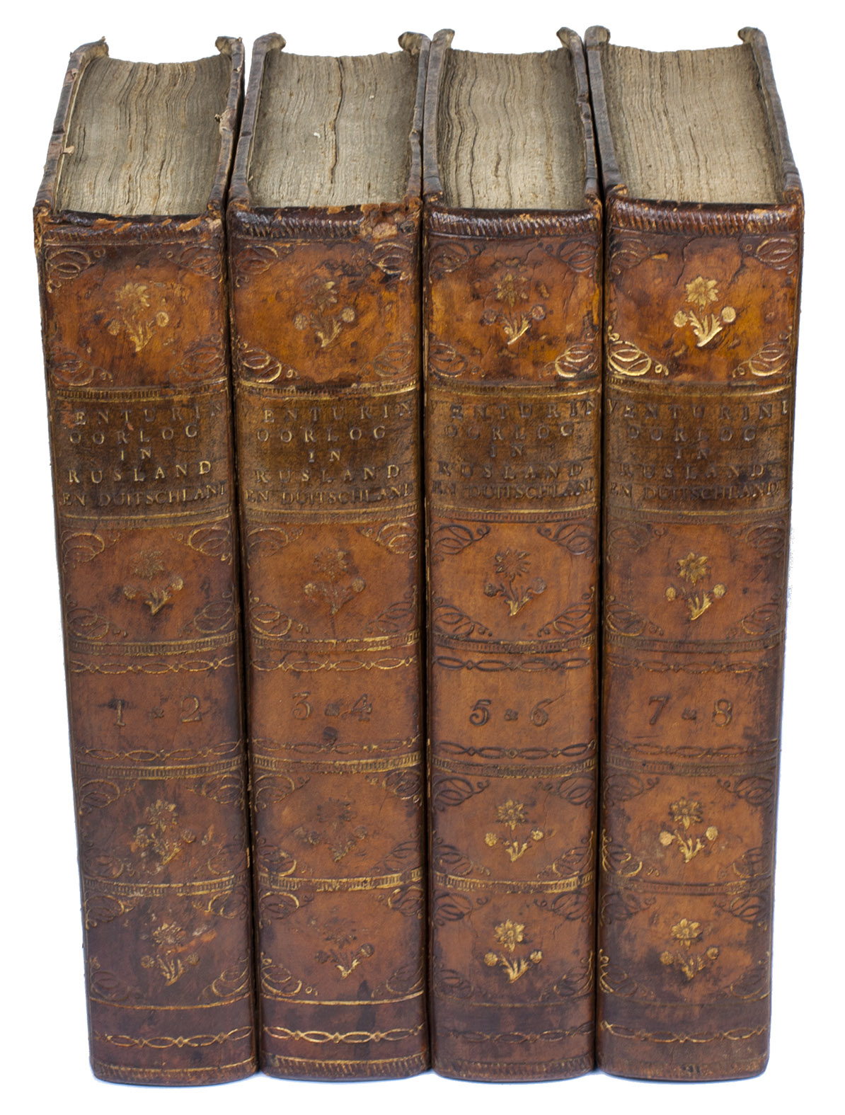 Amsterdam, C. & H. Timmer, 1816-1819. 8 parts in 4 volumes. 8vo. Each volume with an engraved vignette showing a different scene from the Northern Liberation War, by P. Velijn. Contemporary half calf. [2], IV, 313; [4], 310; [2], 342; [4], 346; [2], 312; [4], 318; [2], 334; [4], 333 pp.