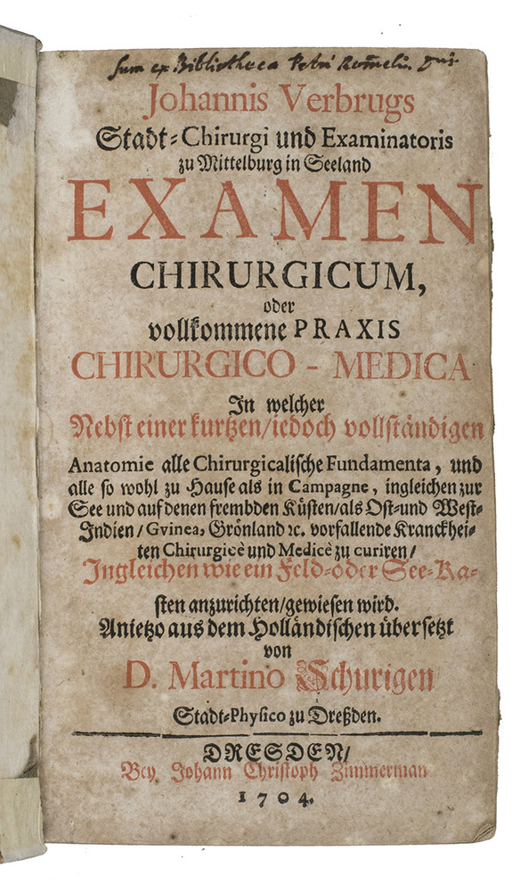 First edition in German of a surgical work by the Dutch surgeon Johannes Verbrugge (ca. 1633-1681). The work covers surgical procedures both on land and at sea, starting with the more basic information: where to find specific organs and what surgical tools are available. It also deals with more practical matters: how to fix things like broken ribs or a broken nose, and how to cure specific diseases. The text was used by the VOC and the WIC on their voyages, and includes diseases that could be found on "foreign coasts", like Greenland and New Guinea. The original Dutch edition, entitled Examen van land- en zeechirurgie..., was first printed at Amsterdam in 1674, and was reprinted many times during the following era. The Dresden based physician Martin Schurig (1656-1733) translated it into German.