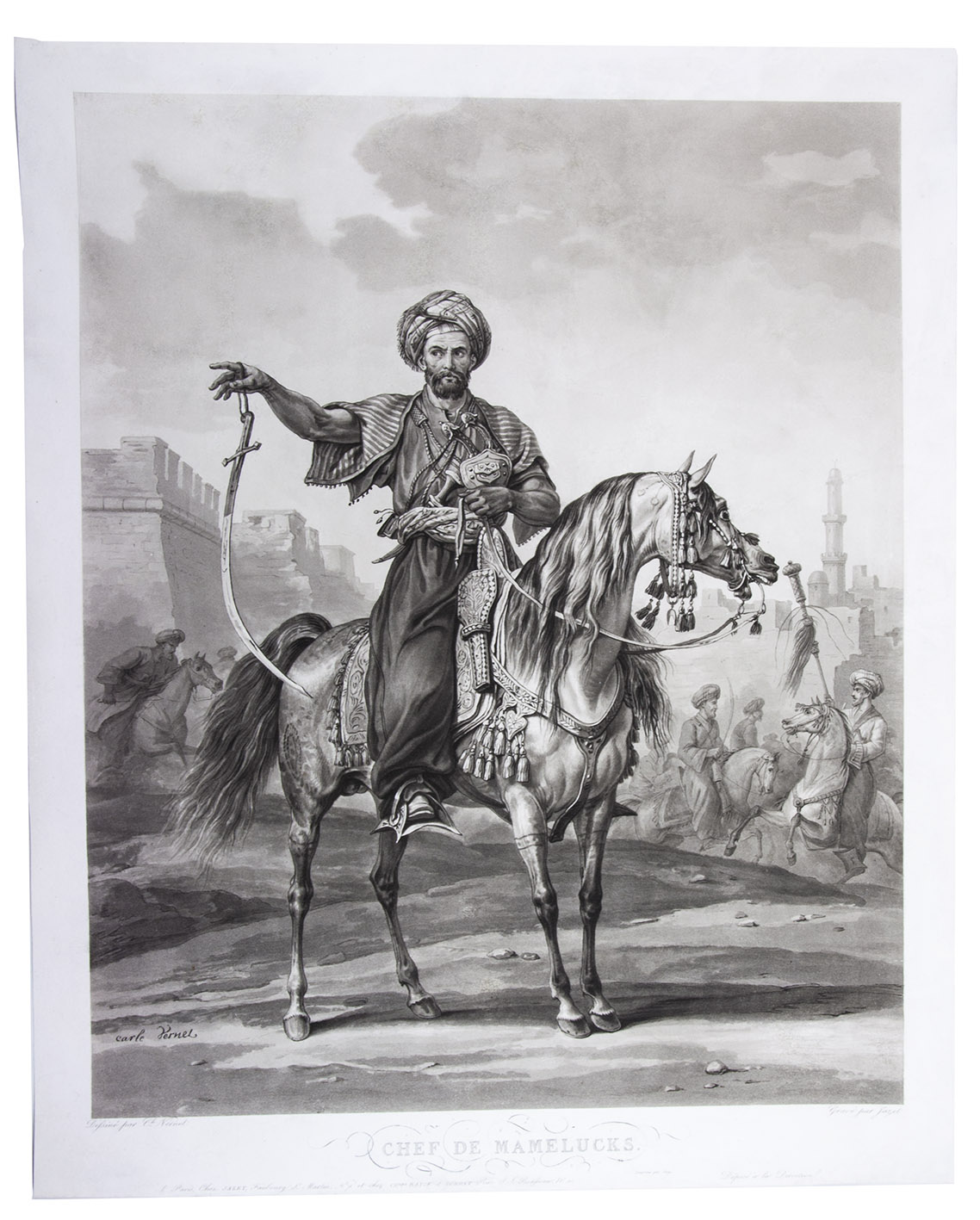 Striking aquatint of a Mamluk leader by the acclaimed French artist Carle Vernet (1758-1836), best known for his depiction of horses and war scenes. The Mamluk leader is depicted in traditional garb with a scimitar dangling from a robe in his hand, on a horse, with a fighting scene in the background in front of a Middle Eastern town. The engraver, Jean Pierre Jazet ( 1788-1871), must have been a skilled artist himself.