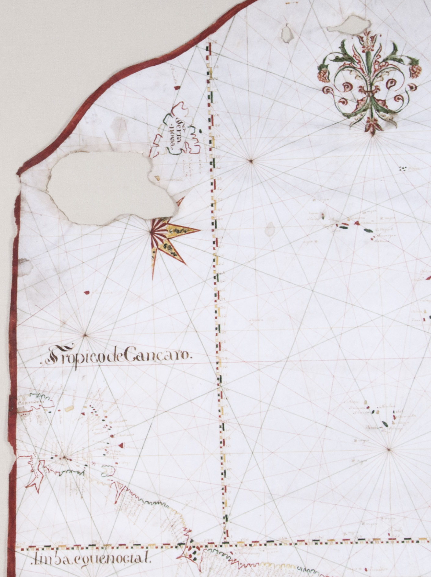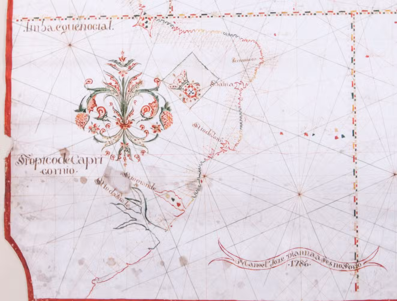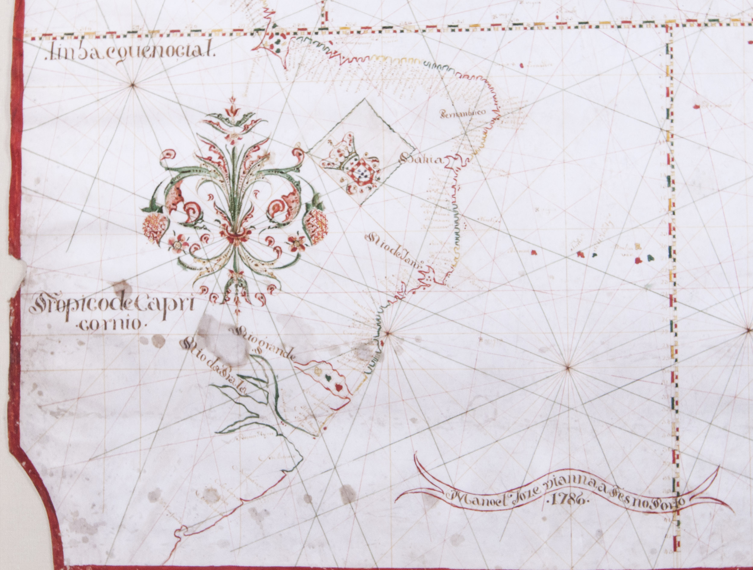 The name of the draughtsman, "Manoel Joze Vianna" (or Manuel José Vianna, dates unknown), is written in a banderole at the bottom of this chart together with the year of its production "1786". Although already archaic in its concept at the time of its creation, this chart is a statement of Portuguese interests in the world, particularly in Brazil. The draughtsmanship is skilled and accomplished, and the chart was probably commissioned by a prominent trader or noble family.