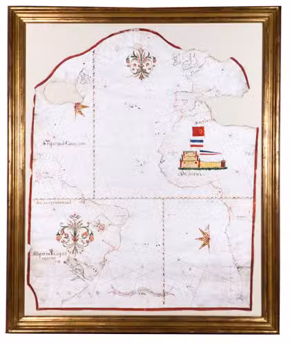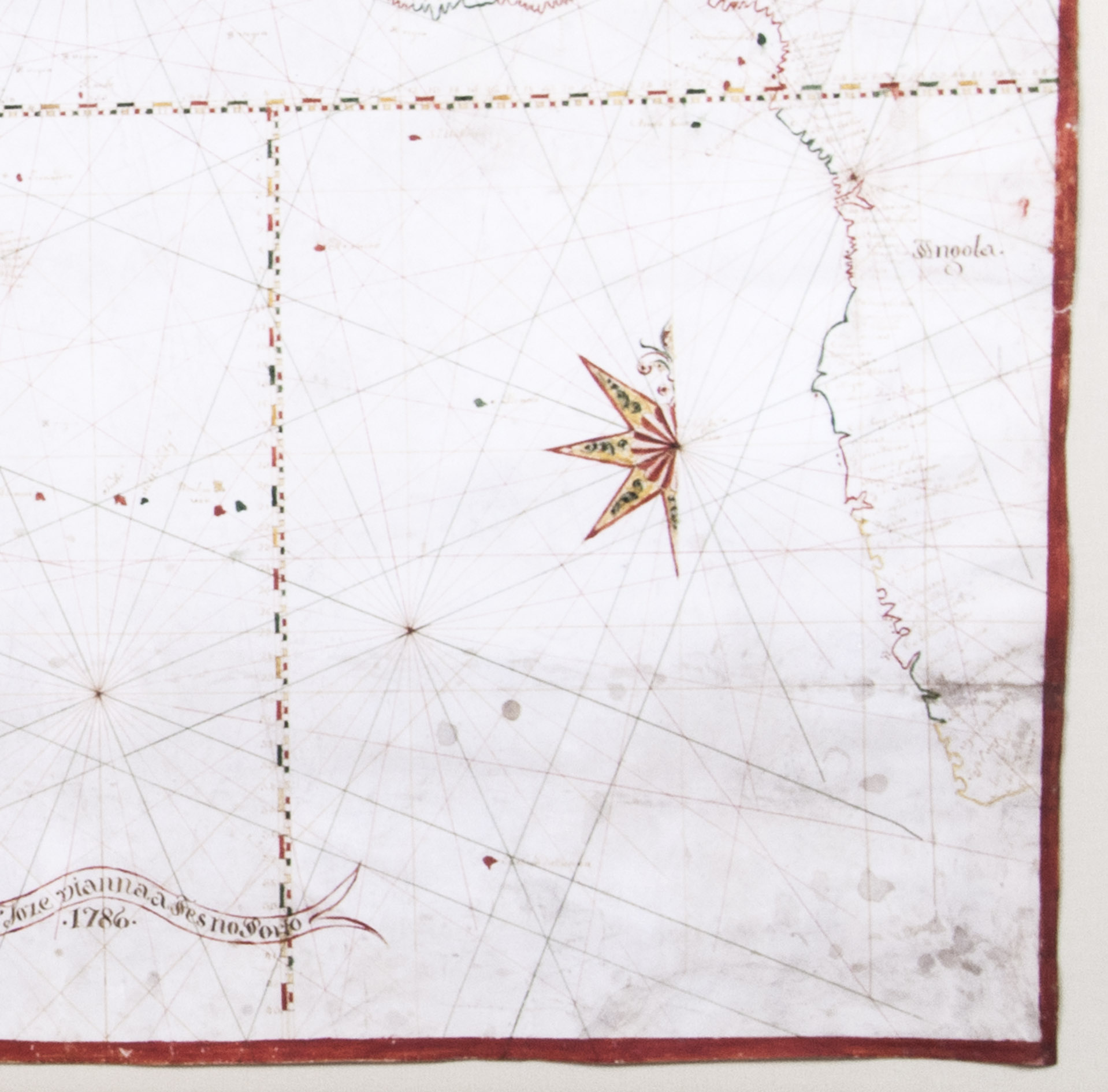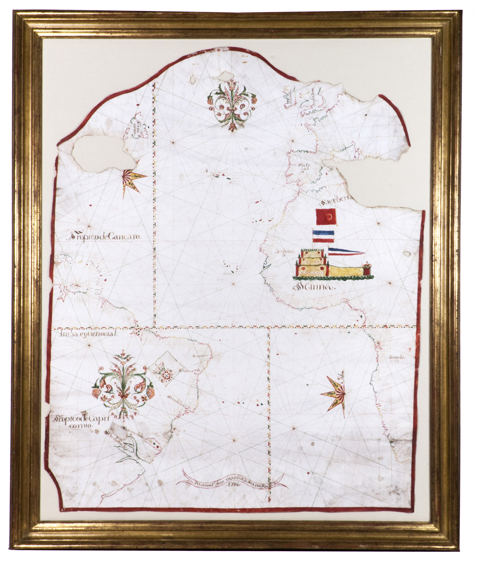 Porto, 1786. Chart ca. 86 x 68 cm; frame ca. 101 x 83.5 cm. Detailed manuscript portolan chart in ink and paint and/or ink wash in green, yellow, red, and brown on vellum. The chart is drawn within a red washed border and shows the detailed coastlines of the east coast of South America, the west coast of Africa, and the west coast of northwest Europe up to the Netherlands and including Great Britain and Ireland. The coasts are drawn in sections alternatingly in yellow, green, and red ink. Principal regions are added in large decorative script, coastal towns, cities, and capes are added in a small cursive hand. Also depicted are a detailed split graticule indicating longitude and latitude, intricate rhumb lines, islands, dangerous rocky outcrops (marked vegia (= vigia, meaning lookouts)), and inshore shoals. Further decorative elements in the chart are the flags in Brazil (Portuguese coat-of-arms), Algeria (Ottoman Empire?), and West Africa (Dutch flag, upside down); the side view of Elmina Castle in west Africa, two half wind roses, elaborate rococo floral (fleur-de-lis) ornaments at the head of the chart and in South America. The banderole at the bottom of the chart contains the following text: "Manoel Joze Vianna a Fes no Porto" and below the year of production "1786". Framed in a gold-coloured frame and mounted on a cream cloth covered backboard.