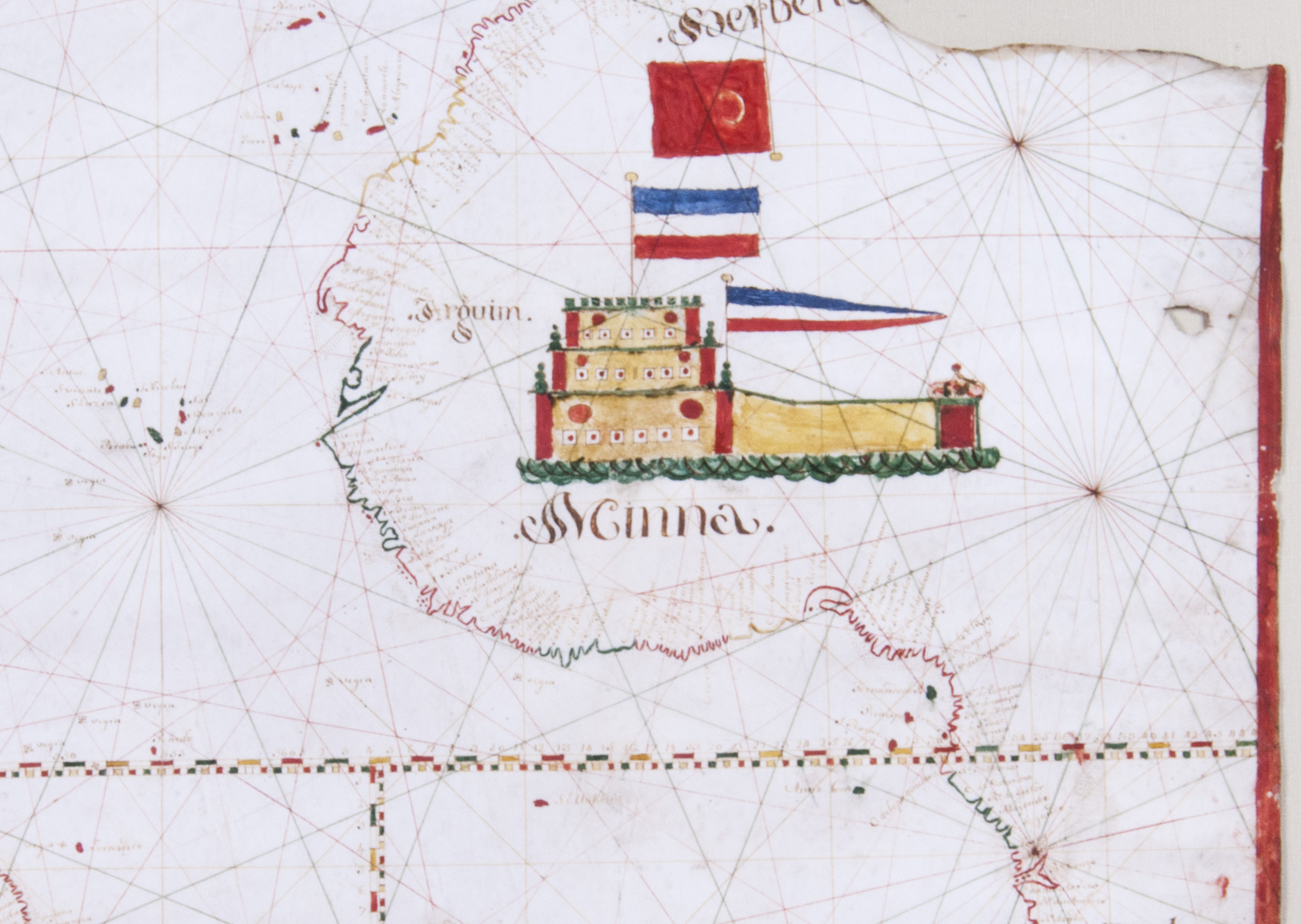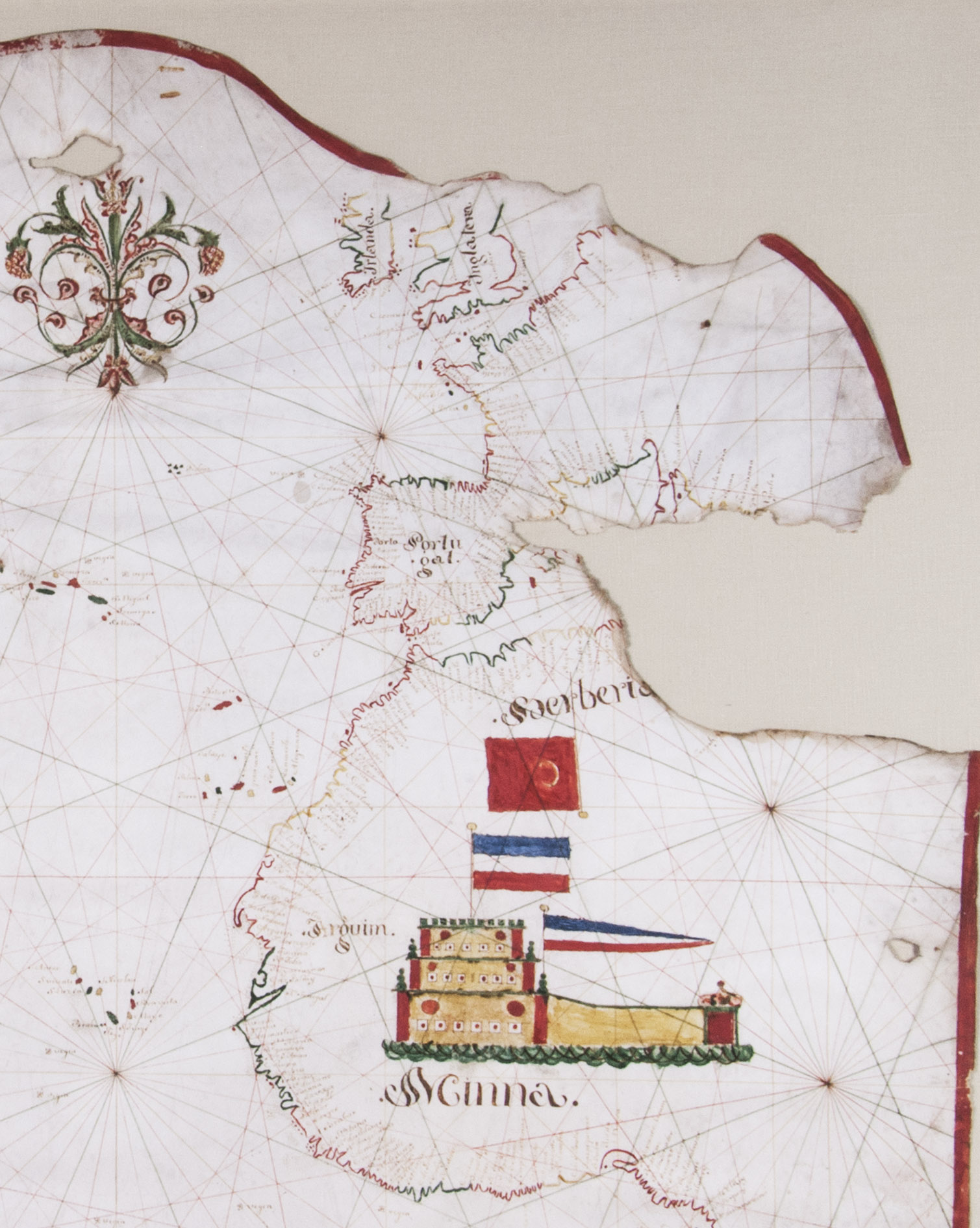A very unusual and highly decorative late 18th century Portuguese manuscript chart, showing the Portuguese Empire on both sides of the Atlantic. On the left is colonial Brazil, the map listing more than 100 places along the Brazilian coast up to the Caribbean, including the following prominently marked places: Pernambuco, Bahia, Rio de Janeiro, Rio Grande (do Sul) and "Rio da Prata" (Rio de la Plata). On the right side of the map Western Europe can be found, with the Iberian Peninsula, marked "Portugal", and the western coast of Africa. Here, more than 270 places are listed, including the following prominently marked places: "Arguim" (Arguin in Mauritania) and "Minna" (Elmina Castle in Ghana), the latter drawn on a large scale in Western Africa and adorned with two Dutch flags (both shown upside down). This fortress, known as Castelo de São Jorge da Mina (St. George of the Mine Castle), was built in 1482 by the Portuguese as a trading post for the Guinea trade. It was captured by the Dutch in 1637 and they reconstructed the castle in 1770-1775. It became one of the most important stops along the main routes of the Atlantic slave trade, continued under the Dutch until ca. 1814. Above the Dutch flags, a red flag with a white crescent moon (most likely of the Ottoman Empire) is shown upside down for compositional reasons, placing its flagpole in "Berberia" (Barbary). This coastal region of central and western North Africa played a main role in the Barbary slave trade, which lasted until the end of the 19th century.