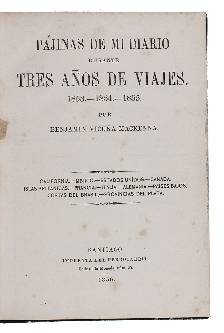 First edition of the memoires of Benjamín Vicuña Mackenna (1831-1886), primarily during his voyages through North America and Europe. Vicuña started his voyages in California, where he visited San Francisco. His went on to Mexico, New Orleans, Ohio, New York, Boston, Washington, Canada, Liverpool, Paris (covered here in 3 chapters), London, Ireland, Scotland, Lyon, Rome, Tuscany, Lombardy, Dresden and Amsterdam. From Paris he returned to South America, where he visited Buenos Aires and other cities. His observations emphasize cultural and political aspects of the countries he visited; he elaborately discusses the cities' monuments and theatre, as well as the countries' political situations, in relation both to each other and to Chili.