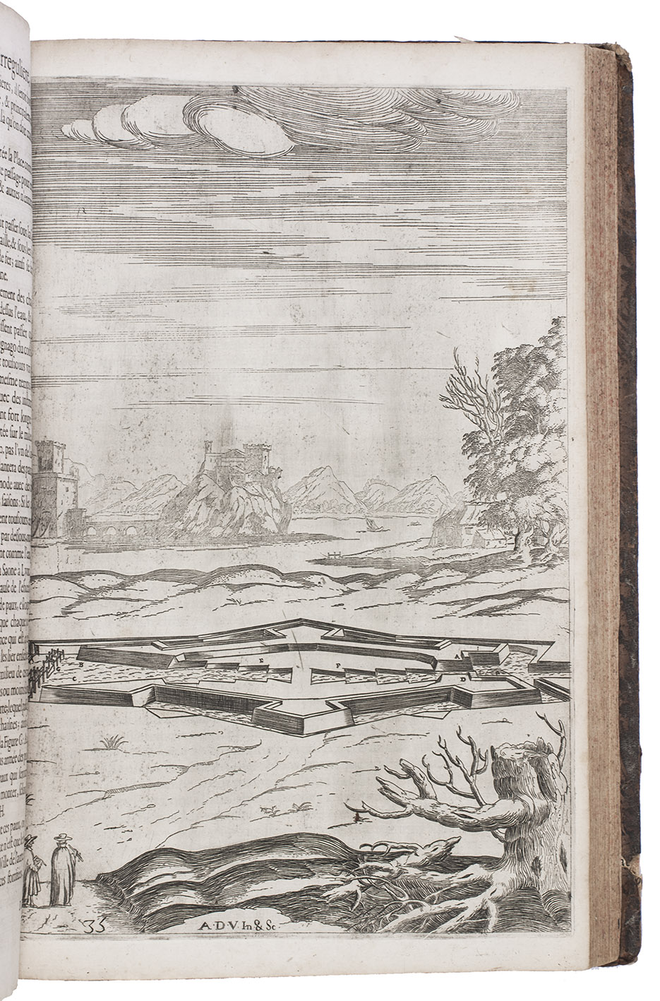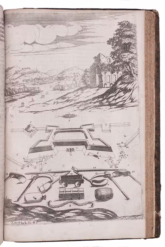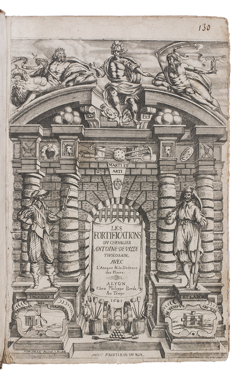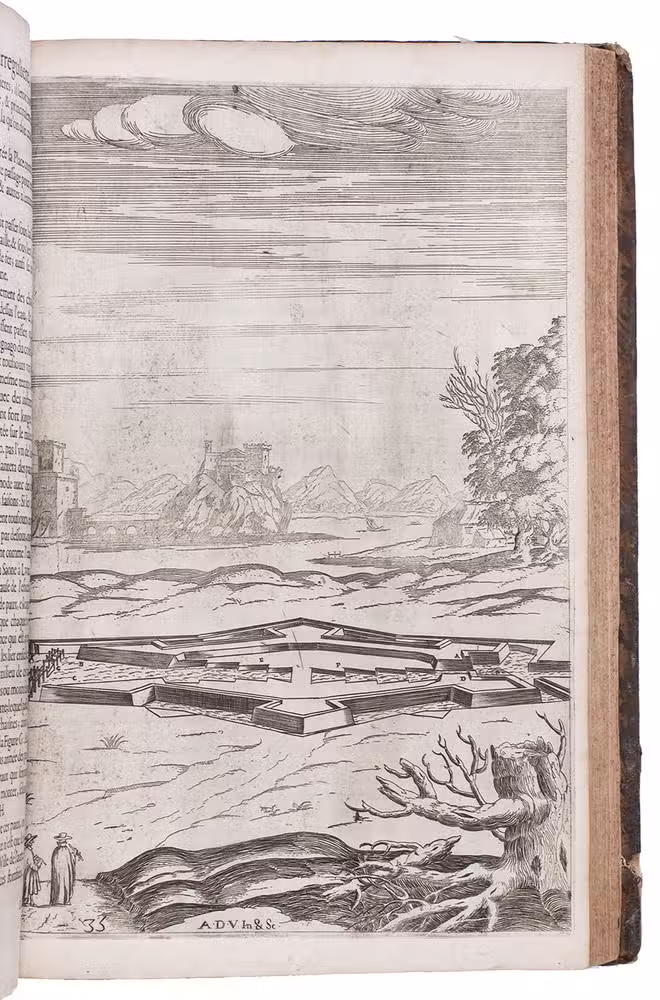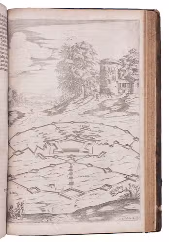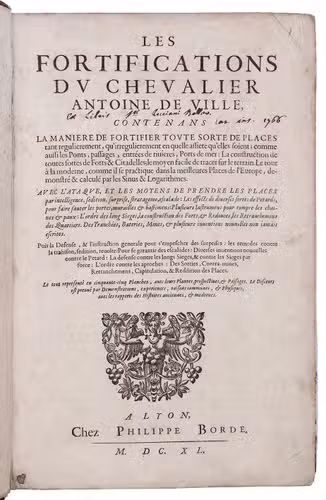 Second Lyons edition of the most comprehensive and most important French fortification manual before Vauban, especially noteworthy for the 53 engravings (plus the engraved title-page), here printed from the plates of the first edition, which were not only drawn but also executed by the author himself. Besides the fortification plans, profiles, perspective views, etc., and often as background to them, De Ville includes many scenes with buildings, landscapes and people, giving his manual a pictorial richness unmatched by the other great fortification manuals of the 17th century. The three main parts of the manual cover the fortifications themselves (both regular and irregular), offense, and defence. Antoine de Ville (1596-1656) first published his manual at Lyon in 1628, when the Dutch were the leading innovators in the art of fortification. It contained little that was new, but gave a more comprehensive account of traditional fortification than any manual of its time. When Vauban usurped the Dutch as the most important proponent of the art of fortification, he was strongly influenced by De Ville's conservative approach.