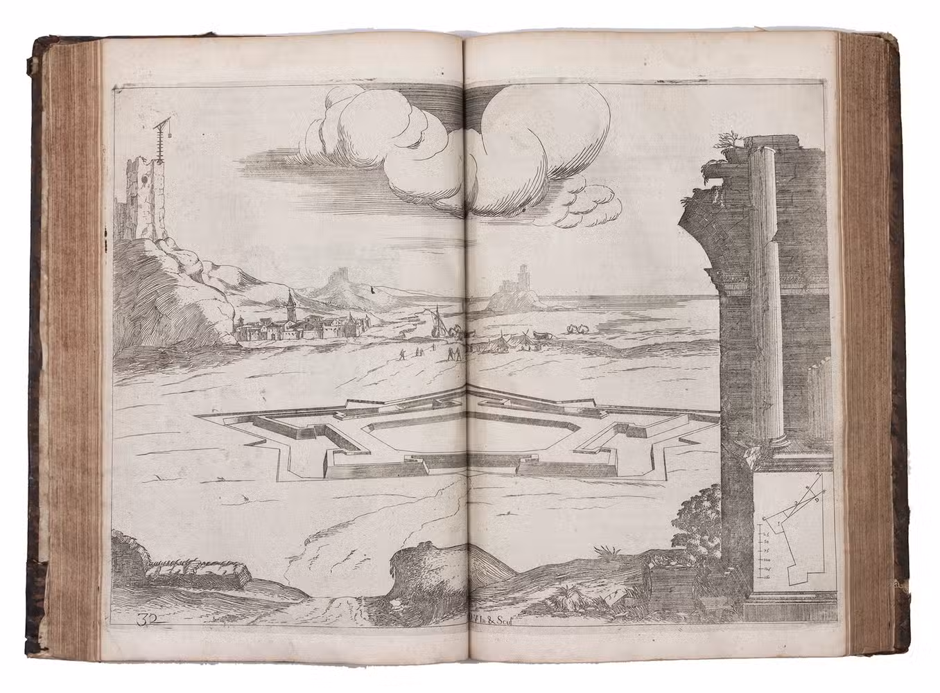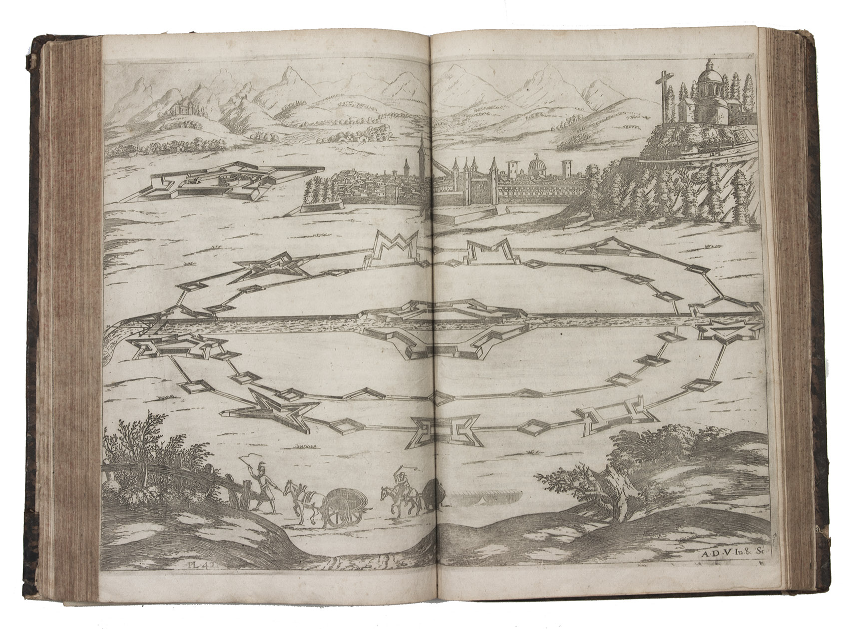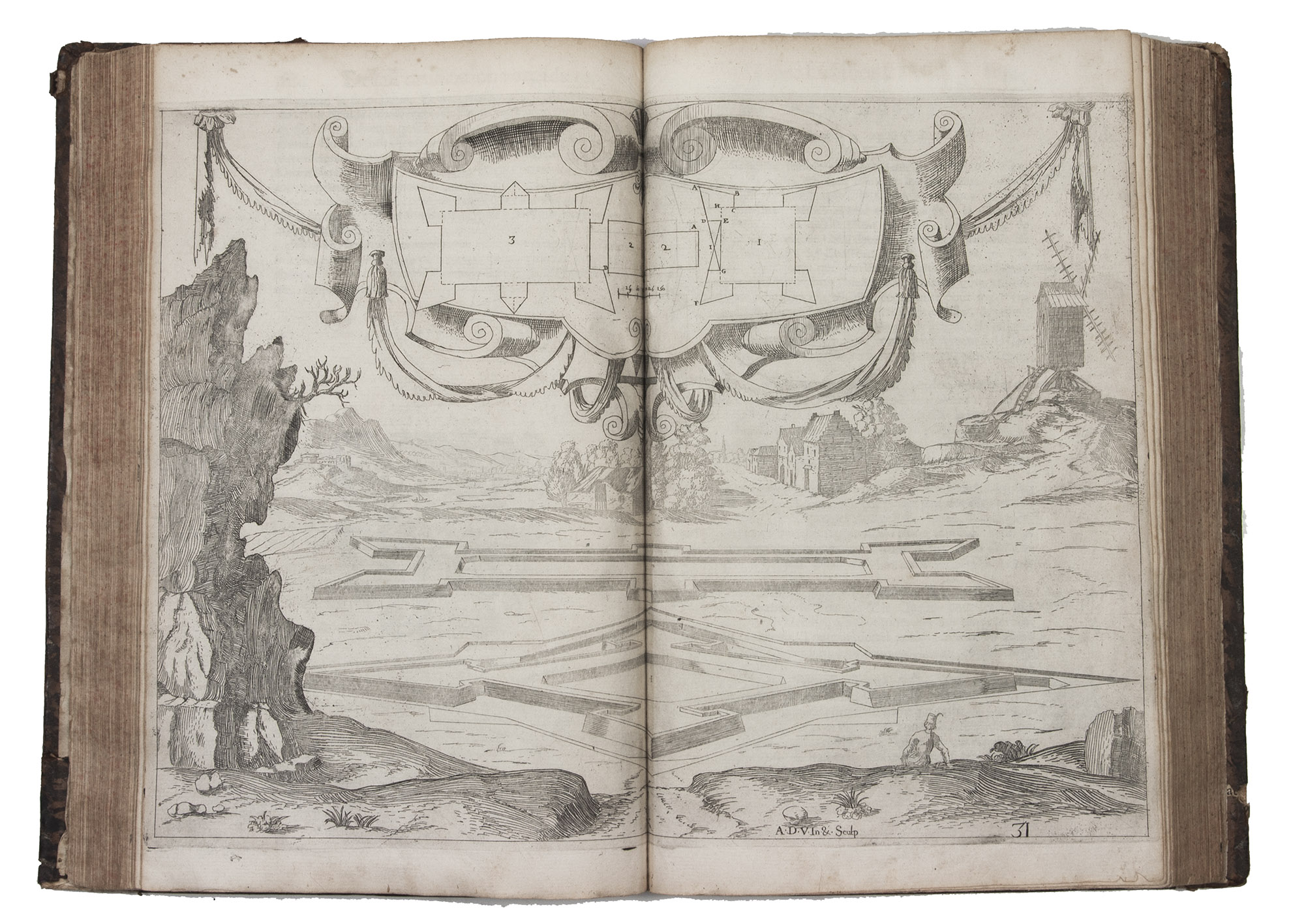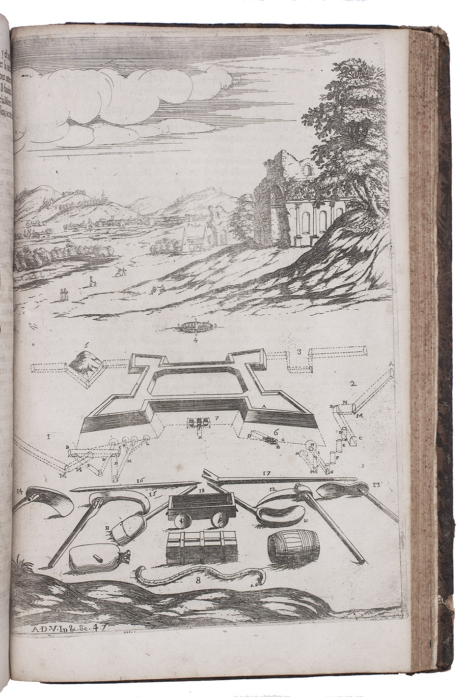 Second Lyons edition of the most comprehensive and most important French fortification manual before Vauban, especially noteworthy for the 53 engravings (plus the engraved title-page), here printed from the plates of the first edition, which were not only drawn but also executed by the author himself. Besides the fortification plans, profiles, perspective views, etc., and often as background to them, De Ville includes many scenes with buildings, landscapes and people, giving his manual a pictorial richness unmatched by the other great fortification manuals of the 17th century. The three main parts of the manual cover the fortifications themselves (both regular and irregular), offense, and defence. Antoine de Ville (1596-1656) first published his manual at Lyon in 1628, when the Dutch were the leading innovators in the art of fortification. It contained little that was new, but gave a more comprehensive account of traditional fortification than any manual of its time. When Vauban usurped the Dutch as the most important proponent of the art of fortification, he was strongly influenced by De Ville's conservative approach.