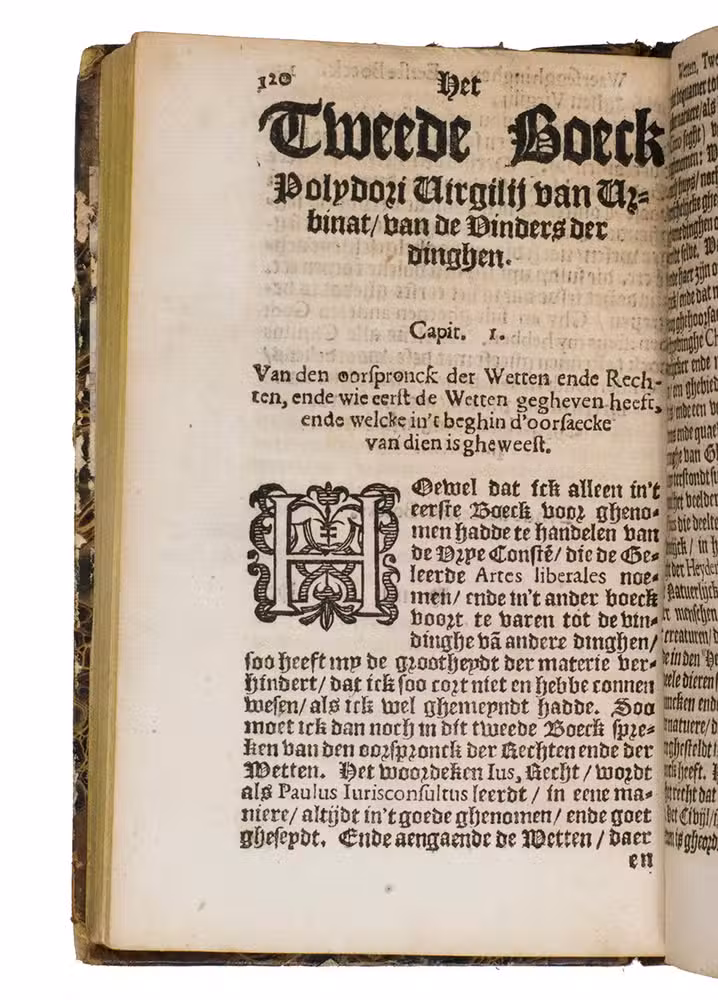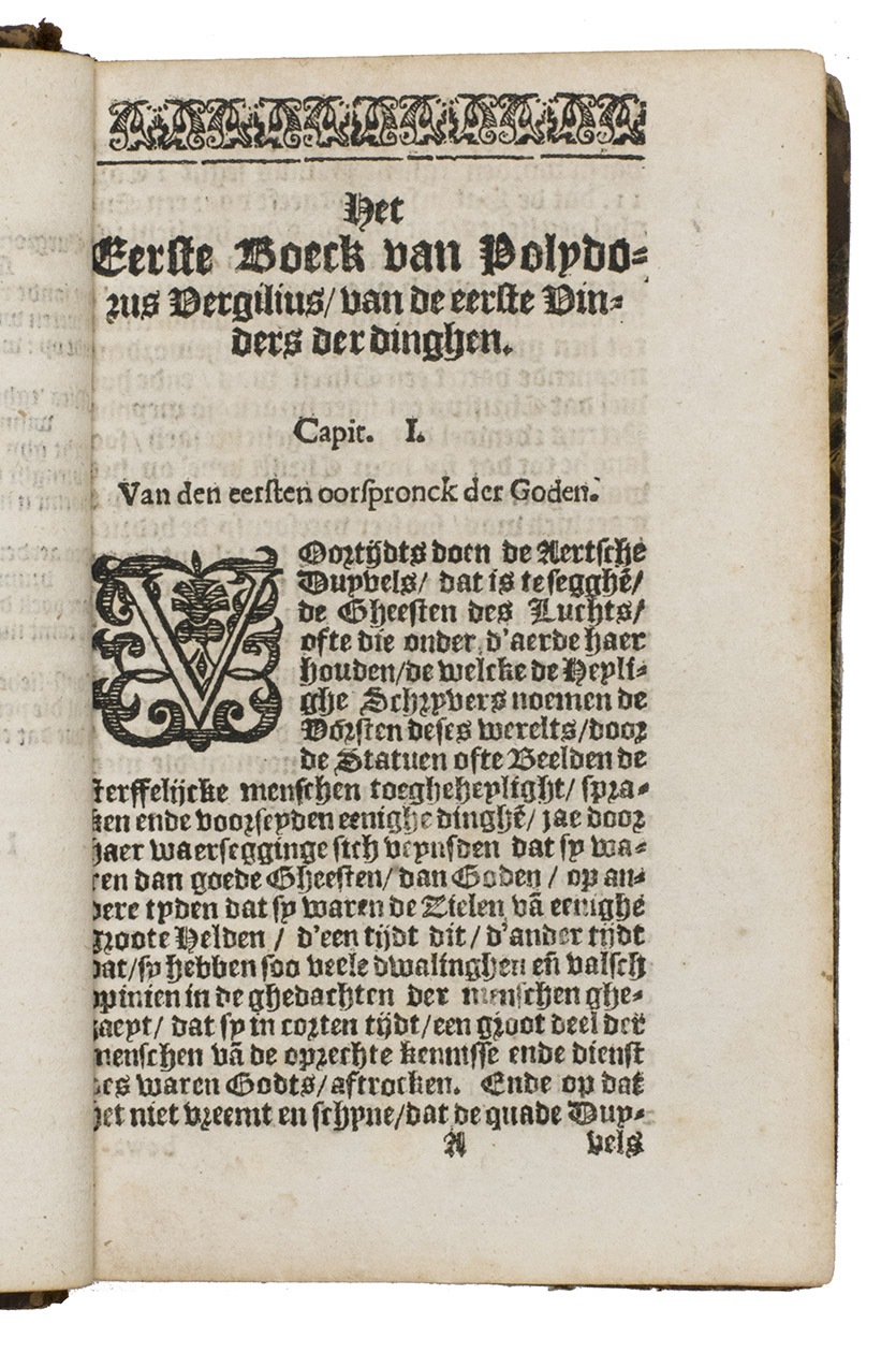 Rare first edition of the translation of the famous work by Italian humanist Polydore Virgil (ca.1470-1555, commonly Latinized as Polydorus Vergilius). He was born in Urbino but spent most of his life in early Tudor England. His most popular work, De inventoribus rerum (The invention of things; 1499), here in its original translation into Dutch, was the first comprehensive account of discoveries and inventions written since antiquity. A re-print appeared in 1663 (Amsterdam, Baltus de Wild for Arent van den Heuvel, 1663. 12mo). Thirty Latin editions of this work were published in Polydore's lifetime, and by the eighteenth century more than a hundred editions had appeared in eight languages.