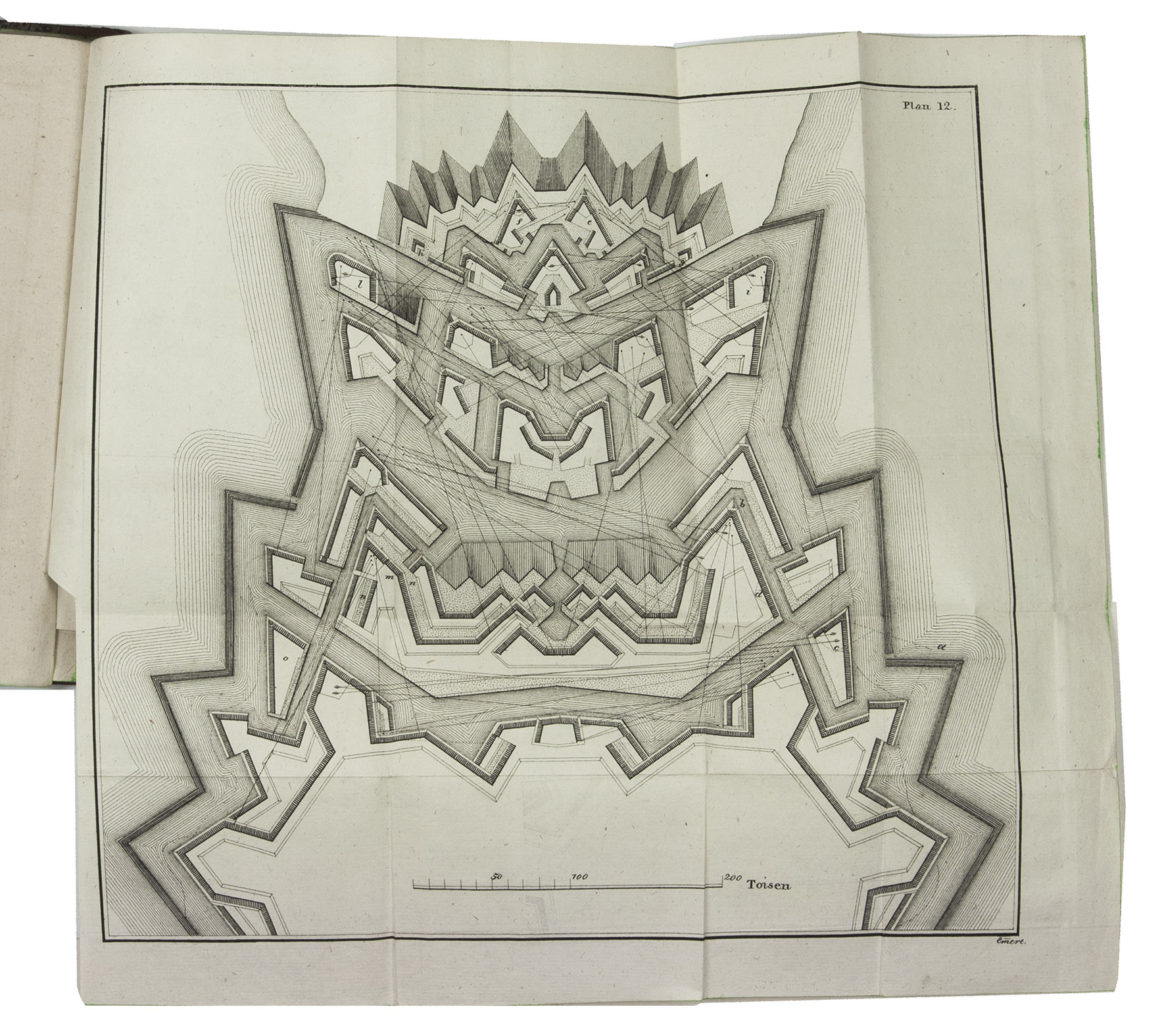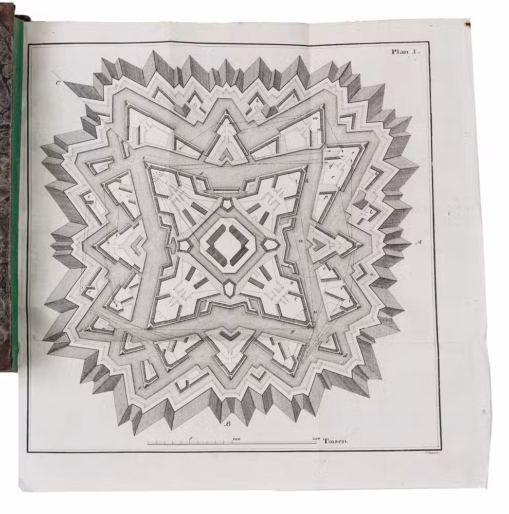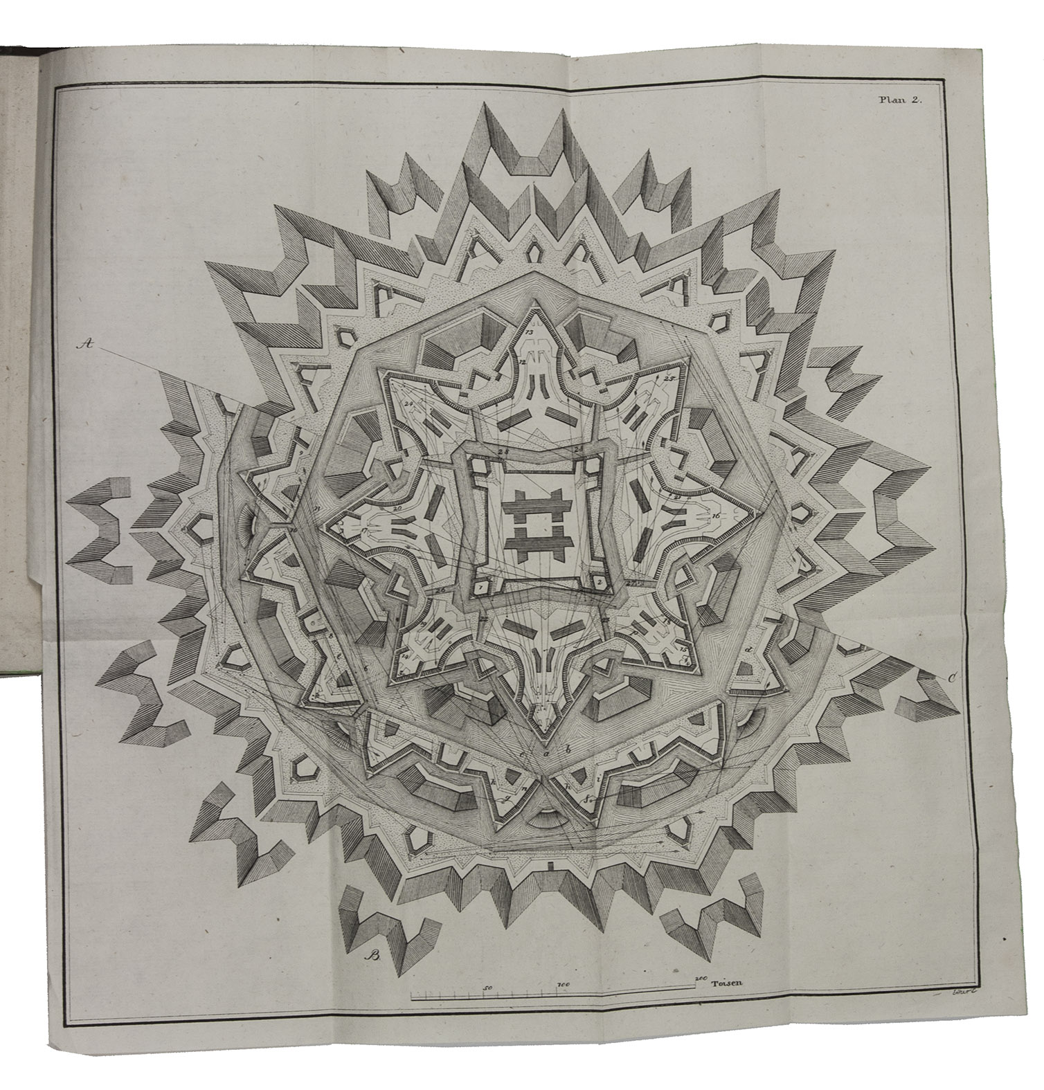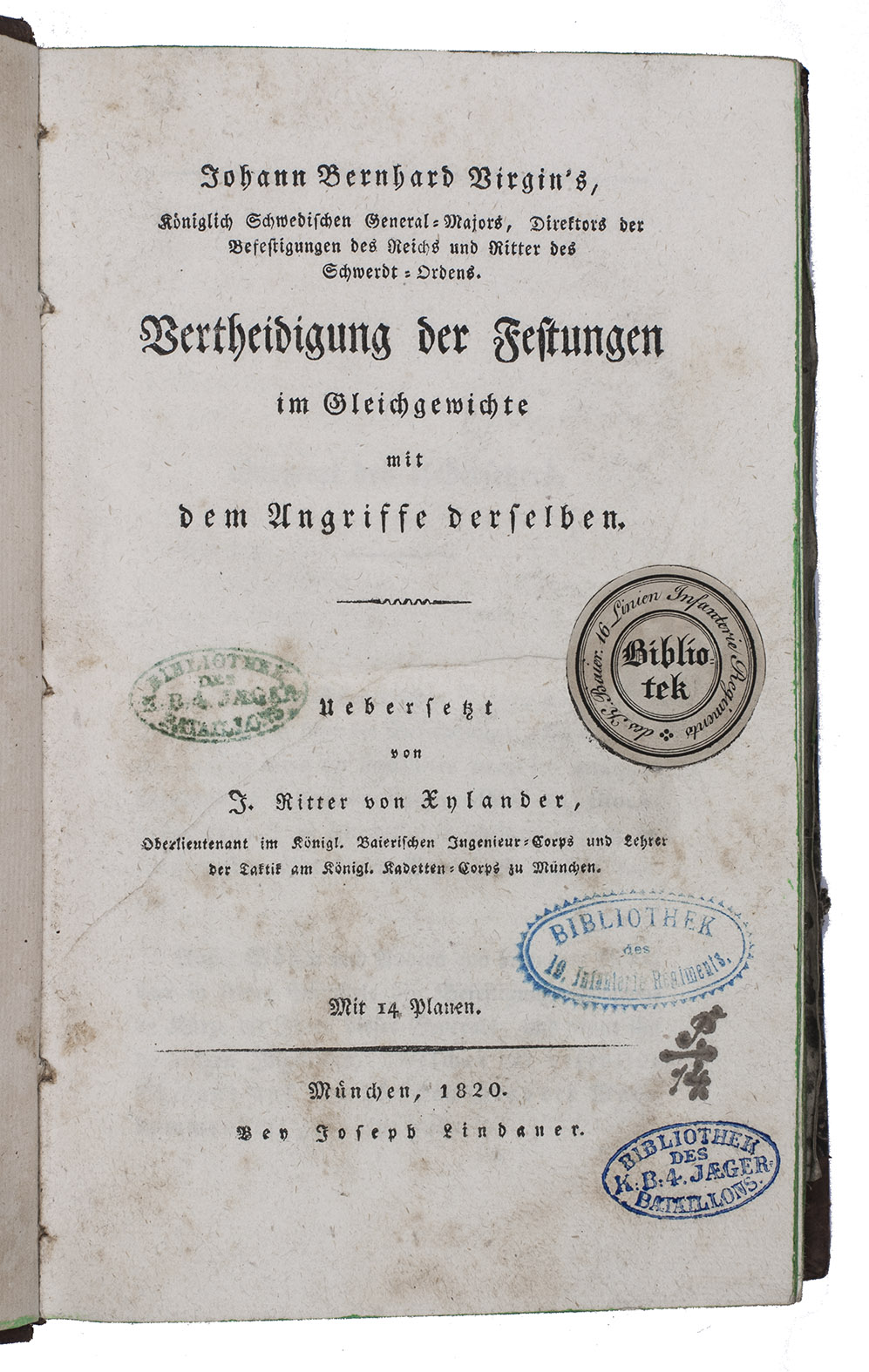 First and only edition of the German translation of a work on attacking and defending fortresses, by the Swedish major general Johan Bernhard Virgin. The work is divided into two parts, the first dealing with the faults in the existing forts, particularly in Sweden, with remarks on how to make them more sufficient. Virgin describes, for example, new and improved ways for placing cannons and mortars. The second section notes new fortification systems and explains how to attack and defend them. The 14 very detailed plates show different types and shapes of fortifications, and can be folded out to be viewed while reading.