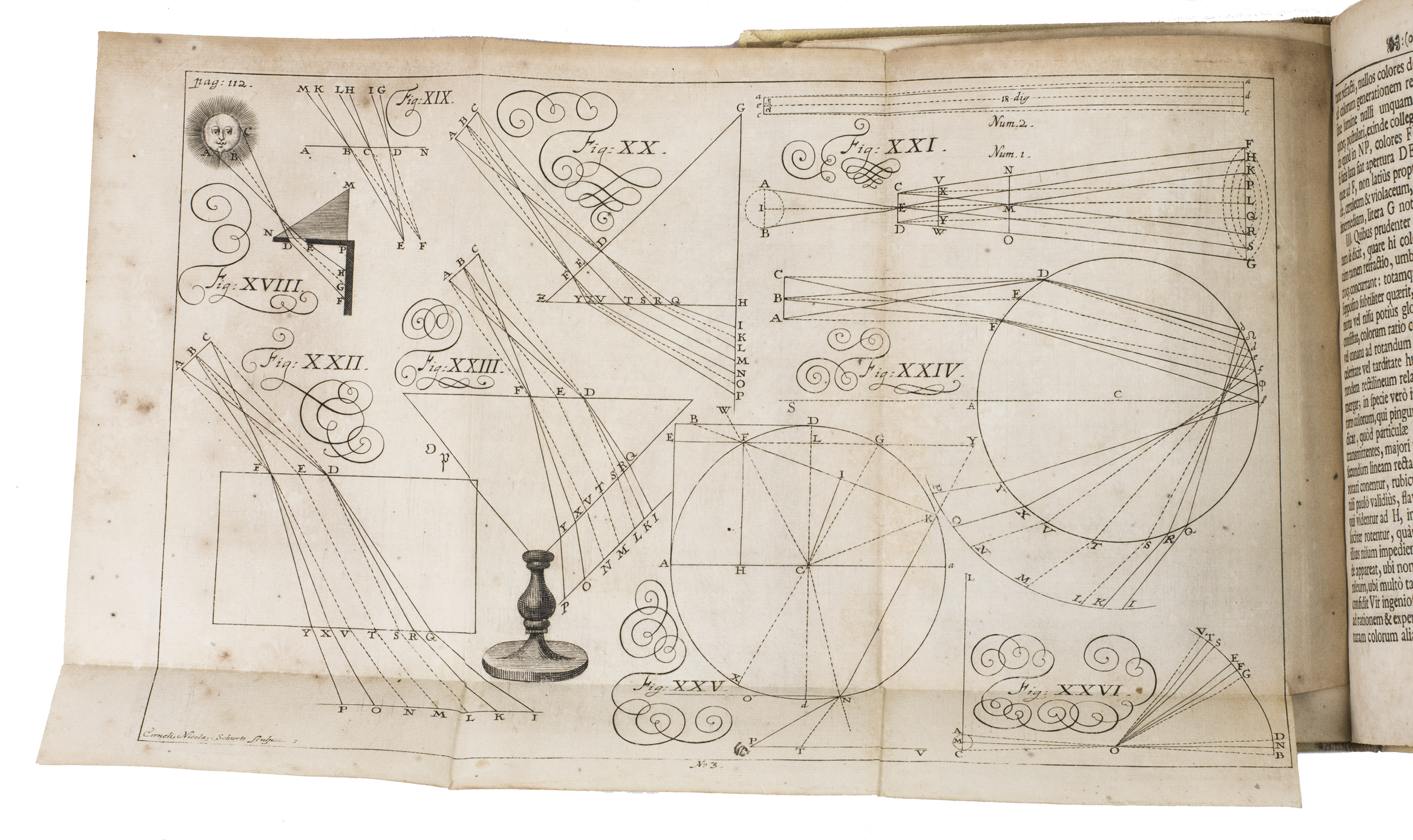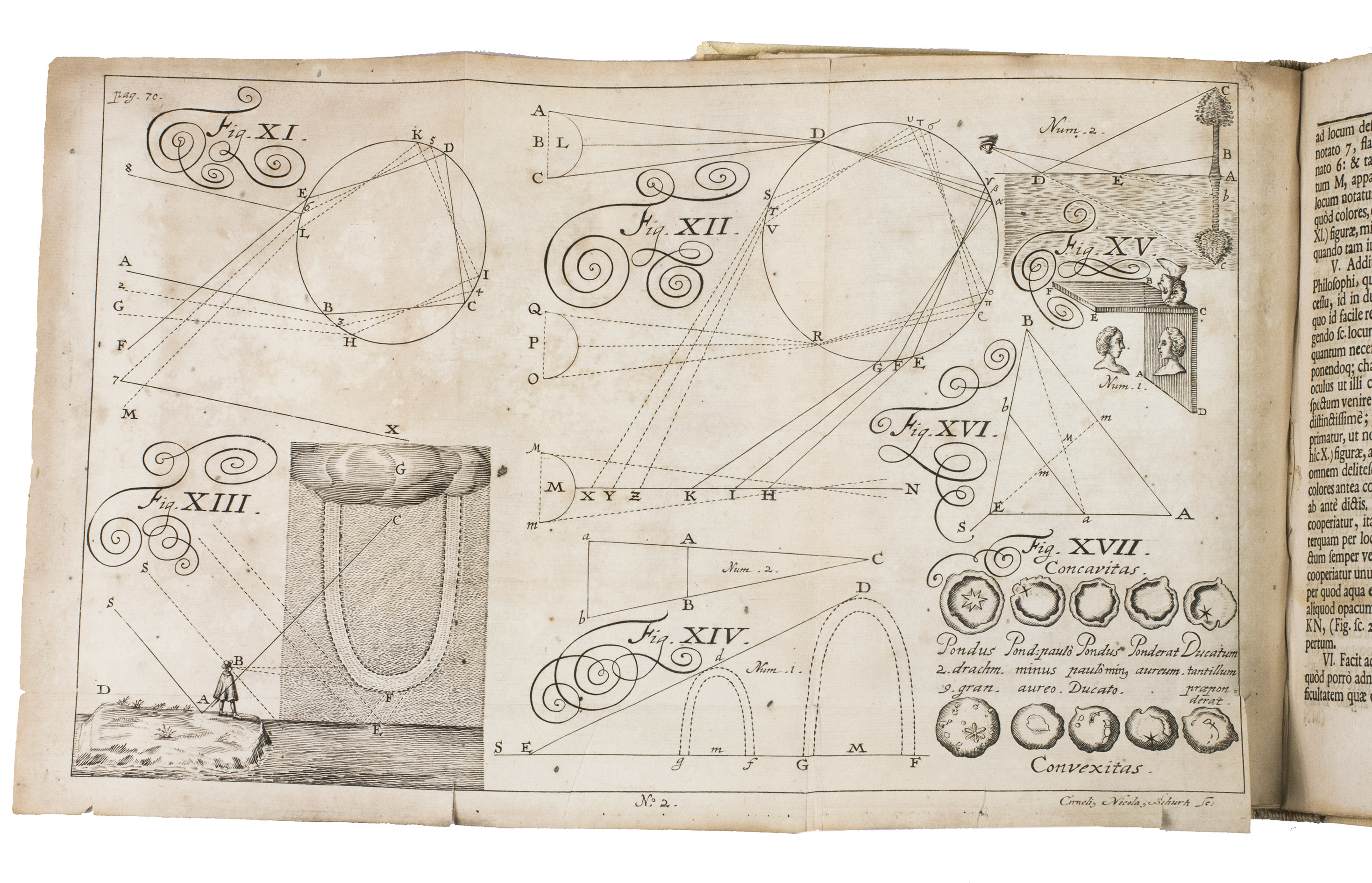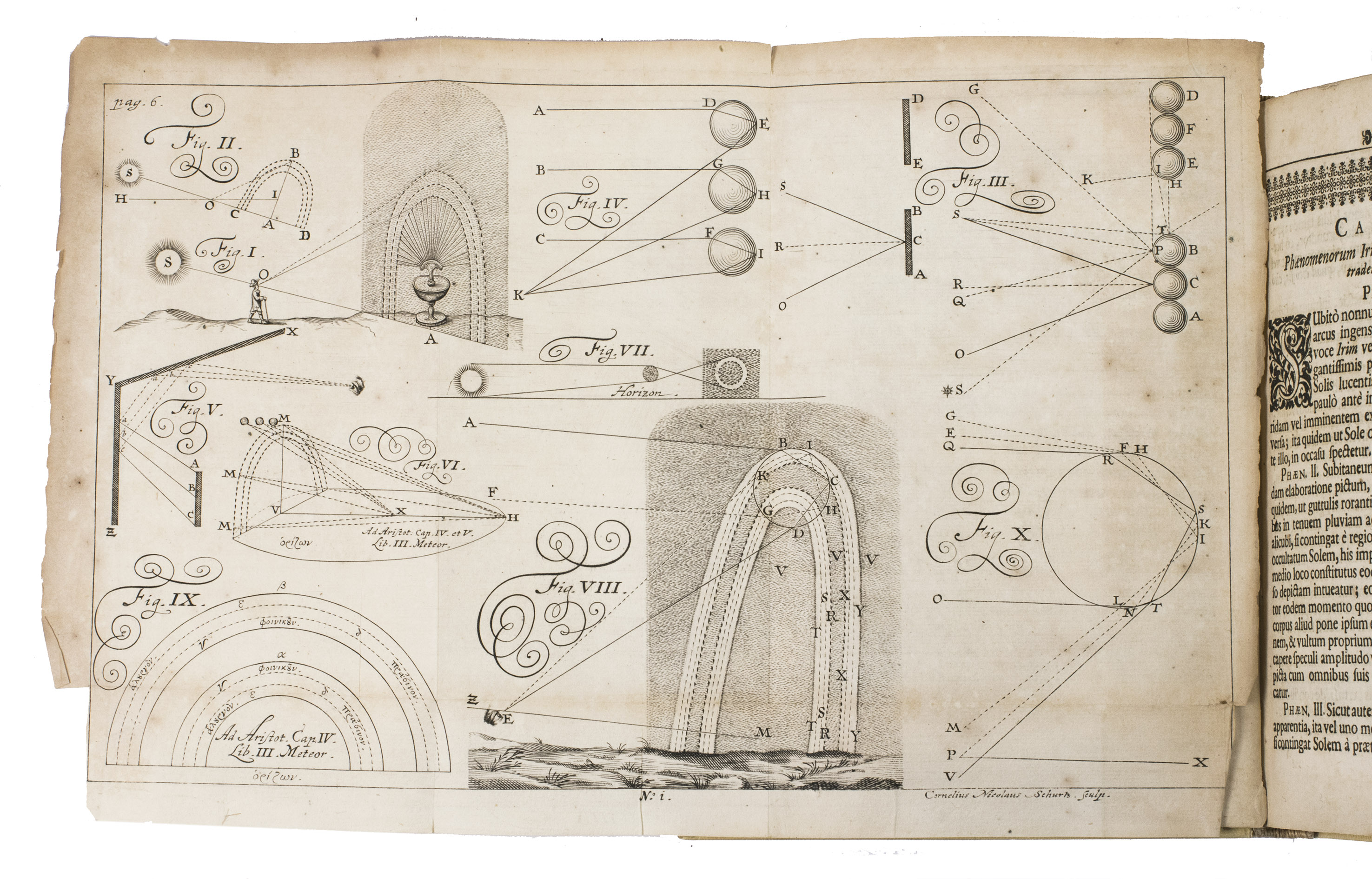 First edition of a doctoral thesis on the perspective and colours of the rainbow, read at the University of Altdorff in Germany, and written under the supervision of mathematician and astronomer Johann Christoph Sturm (1635-1703). The work starts with a discussion on the classical views on the subject, especially those of Aristotle, continues with essays on the views of the Renaissance perspective scientists, like Maurolico, Vitellio, Hamelius, etc., and ends with the latest views on the perspective and colours of the rainbow, based on the philosophy of Descartes and the works of Eckard. The large illustrations on the engraved plates clearly and attractively illustrate the ideas and problems discussed.