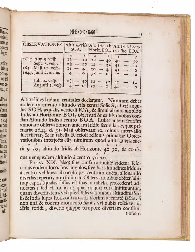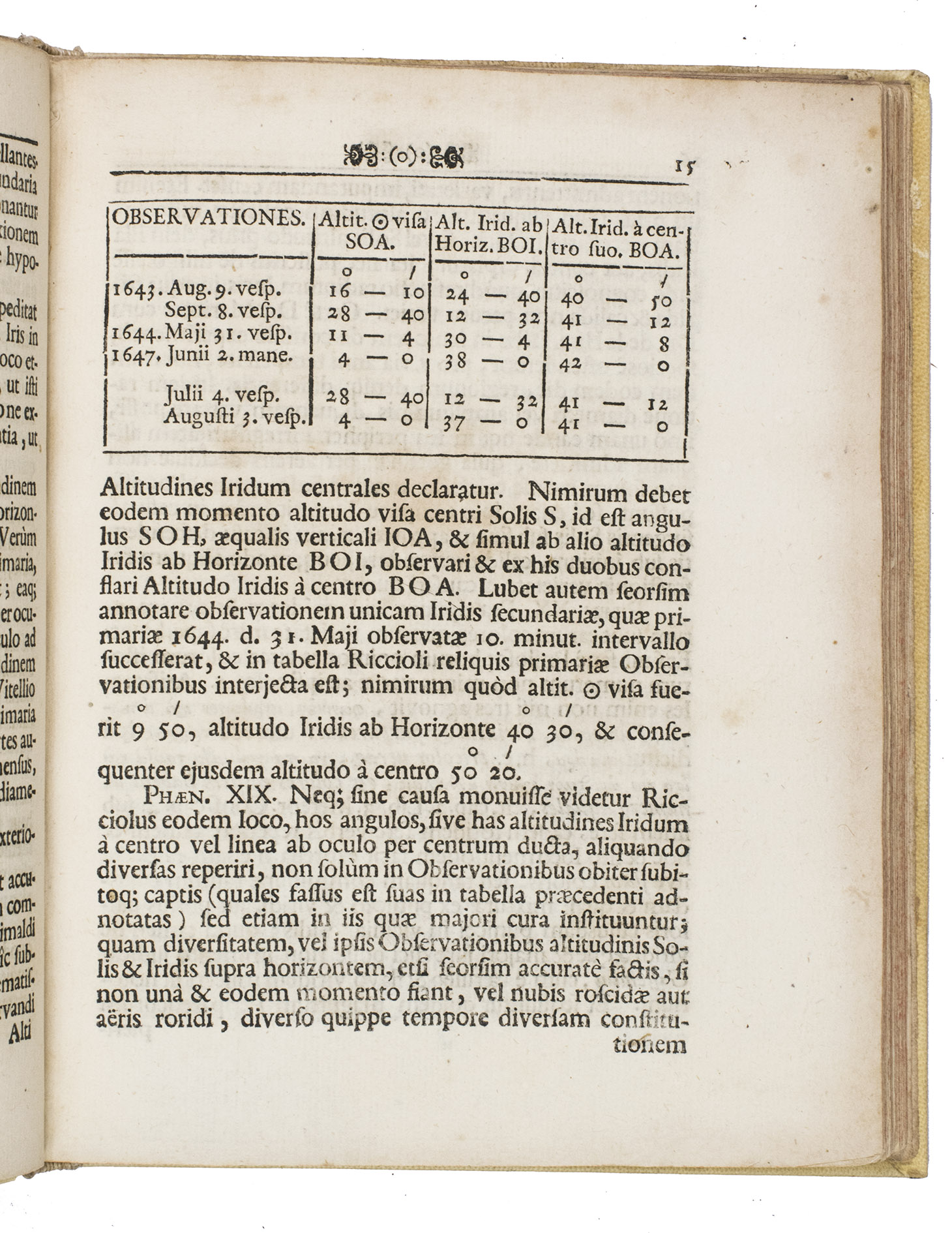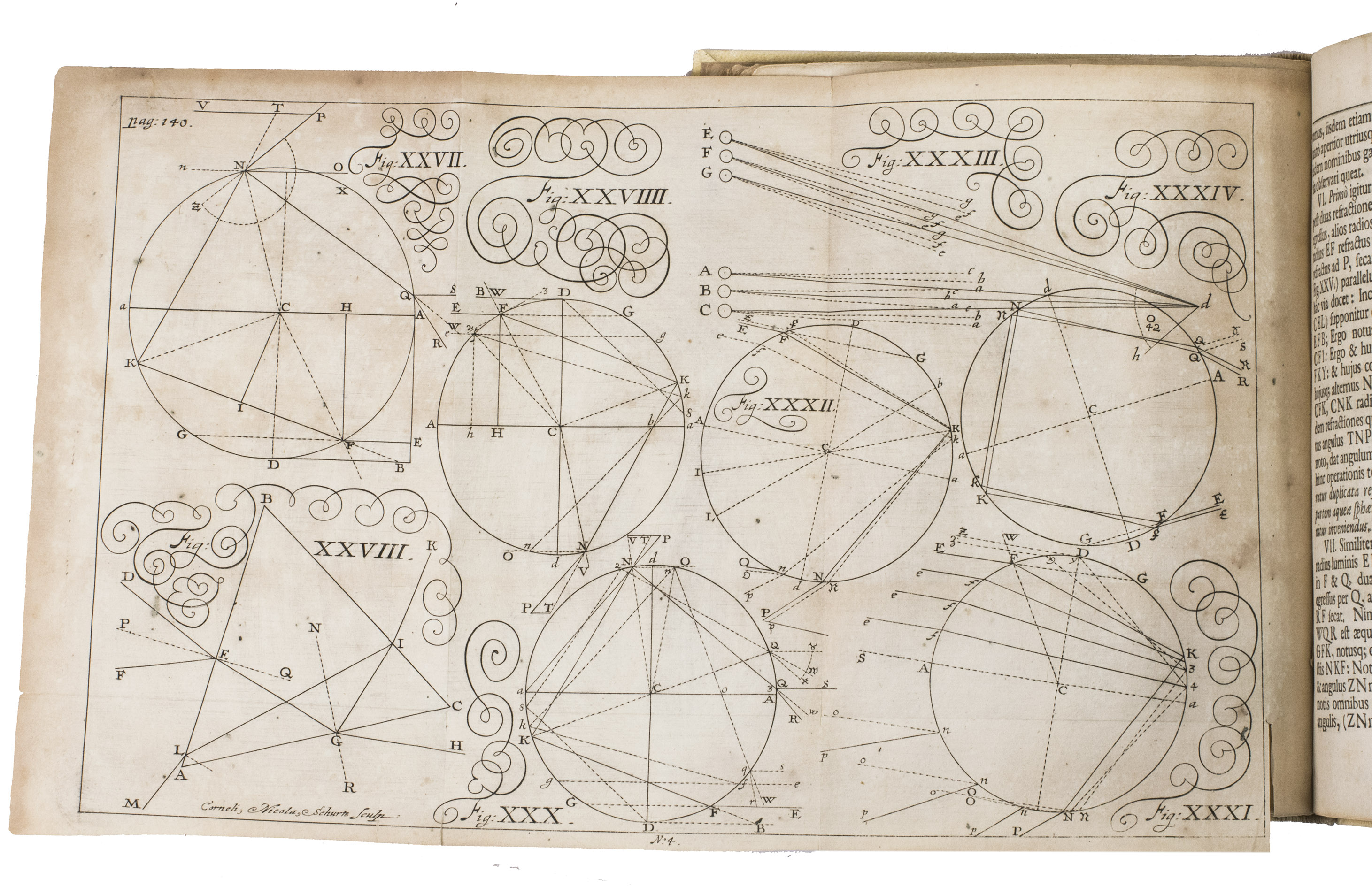 First edition of a doctoral thesis on the perspective and colours of the rainbow, read at the University of Altdorff in Germany, and written under the supervision of mathematician and astronomer Johann Christoph Sturm (1635-1703). The work starts with a discussion on the classical views on the subject, especially those of Aristotle, continues with essays on the views of the Renaissance perspective scientists, like Maurolico, Vitellio, Hamelius, etc., and ends with the latest views on the perspective and colours of the rainbow, based on the philosophy of Descartes and the works of Eckard. The large illustrations on the engraved plates clearly and attractively illustrate the ideas and problems discussed.