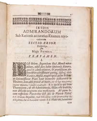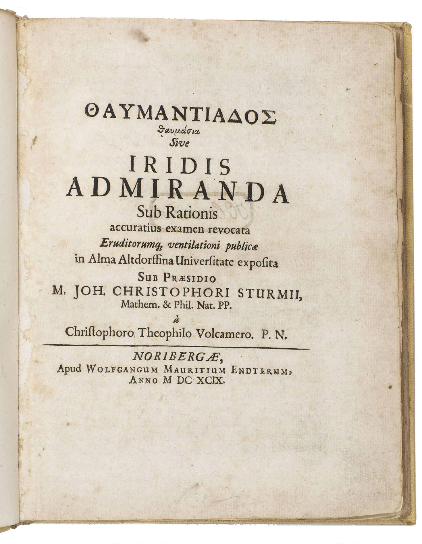 [Greek] Thaumantiados thaumasia. Sive iridis admiranda. Sub rationis accuratius examen revocata, eruditorumque ventilationi publicae in Alma Altdorffina Universitate exposita, Sub Praesisio Joh. Chr. Strumii.