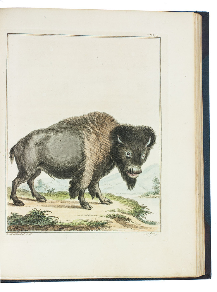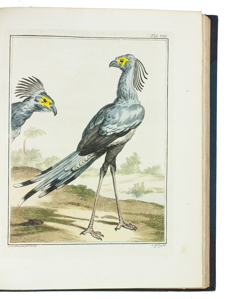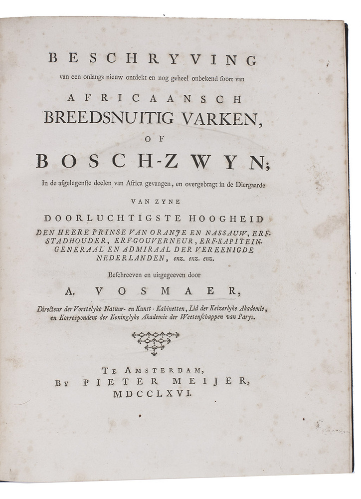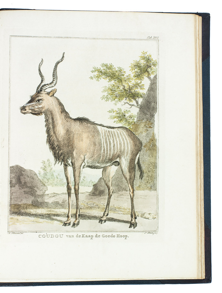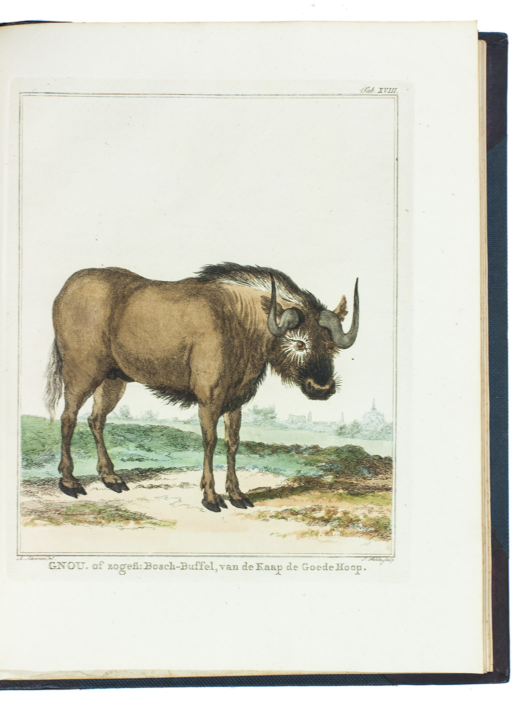 A collection of 31 separately published descriptions of exotic animals kept in the menagerie of prince William V. The animals were imported form the East and West Indies, North America, and Africa, and Vosmaer, director of the menagerie, describes some of them here for the first time. The collection consists of 20 papers on mammals, 8 on birds and 3 on reptiles. It "contains many type illustrations" and includes "a noteworthy description of the Orang-outang from Borneo, with two plates" (Wood). Most of the illustrations were engraved by Simon Fokke after designs by Aert Schouman.