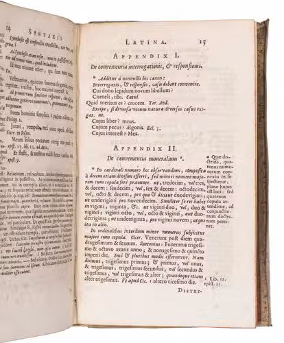 The present is the seventh edition, corrected and enlarged with extra notes. The book is finely printed in several different types, with the notes and annotations in small print arranged around the main text. It still is purely in Latin, only in the course of the 18th century a translation in Dutch as well as Latin-Dutch vocabularies were added.
