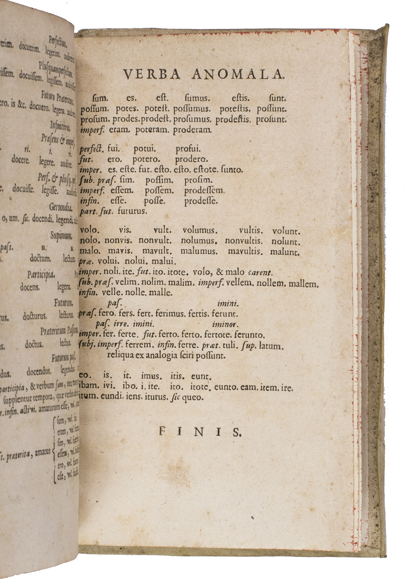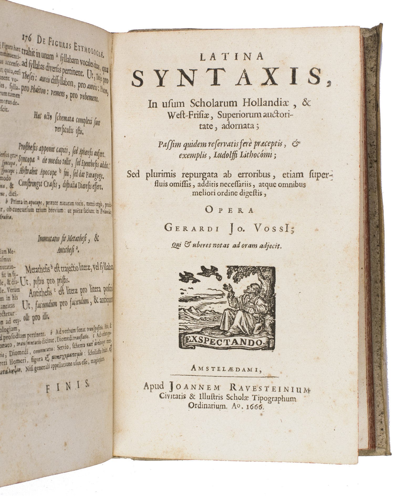 Rare edition of the most popular work on Latin (school) grammar and syntax in the Northern Netherlands, first published in 1627, by the famous humanist scholar Gerard Vossius (1577-1649). It was based upon an earlier popular grammar by Lodewijk Dijkgraaf, in Latin Lithocomus, which Vossius himself had used in his schooldays, and still had to use again when teaching at the Latin School at Dordrecht. So he started to purge the worst defeciencies in Dijkgraaf's grammar, and published the first edition in 1626. However, Vossius was not satisfied with this version either, and until the end of his life he continued to rework his grammar. Finally in 1649 he published the fifth edition, which he himself judged now to be perfect, calling it the "editio princeps". With his Latin grammar Vossius made a major contribution to reforming education at the Latin Schools.